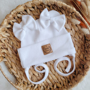 Prosta lub wywijana czapka z dzianiny prążkowanej ozdobiona misiowymi uszami w kolorze białym. Możliwe wiązanie i dodatkowe kokardki.