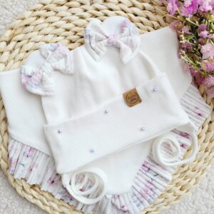 Komplet dla dziewczynki, czapka ozdobiona perełkami i kokardkami w zestawie z chustą z falbanką. Wzór Old Roses.
