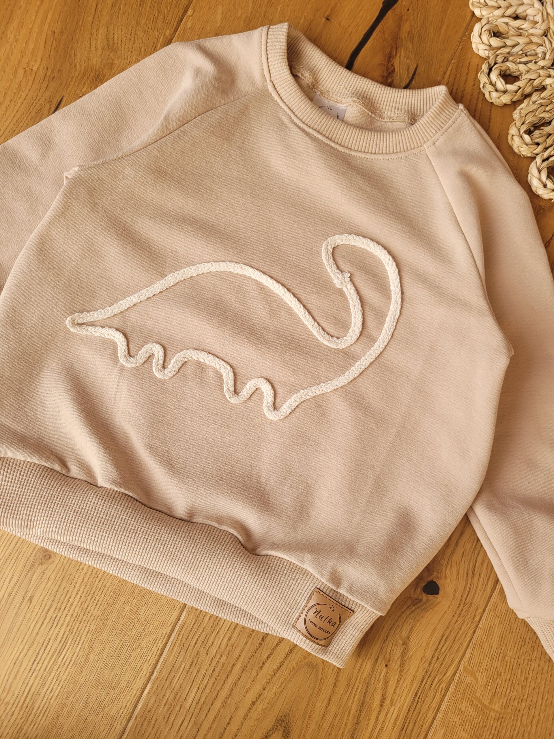 Bluza szyta z dzianiny dresowej w wybranym kolorze ozdobiona ręcznie robioną aplikacją ze sznurka bawełnianego w kształcie dinozaura. Wzór, który spodoba się miłośnikom dinozaurów – dla chłopców i dla dziewczynek.