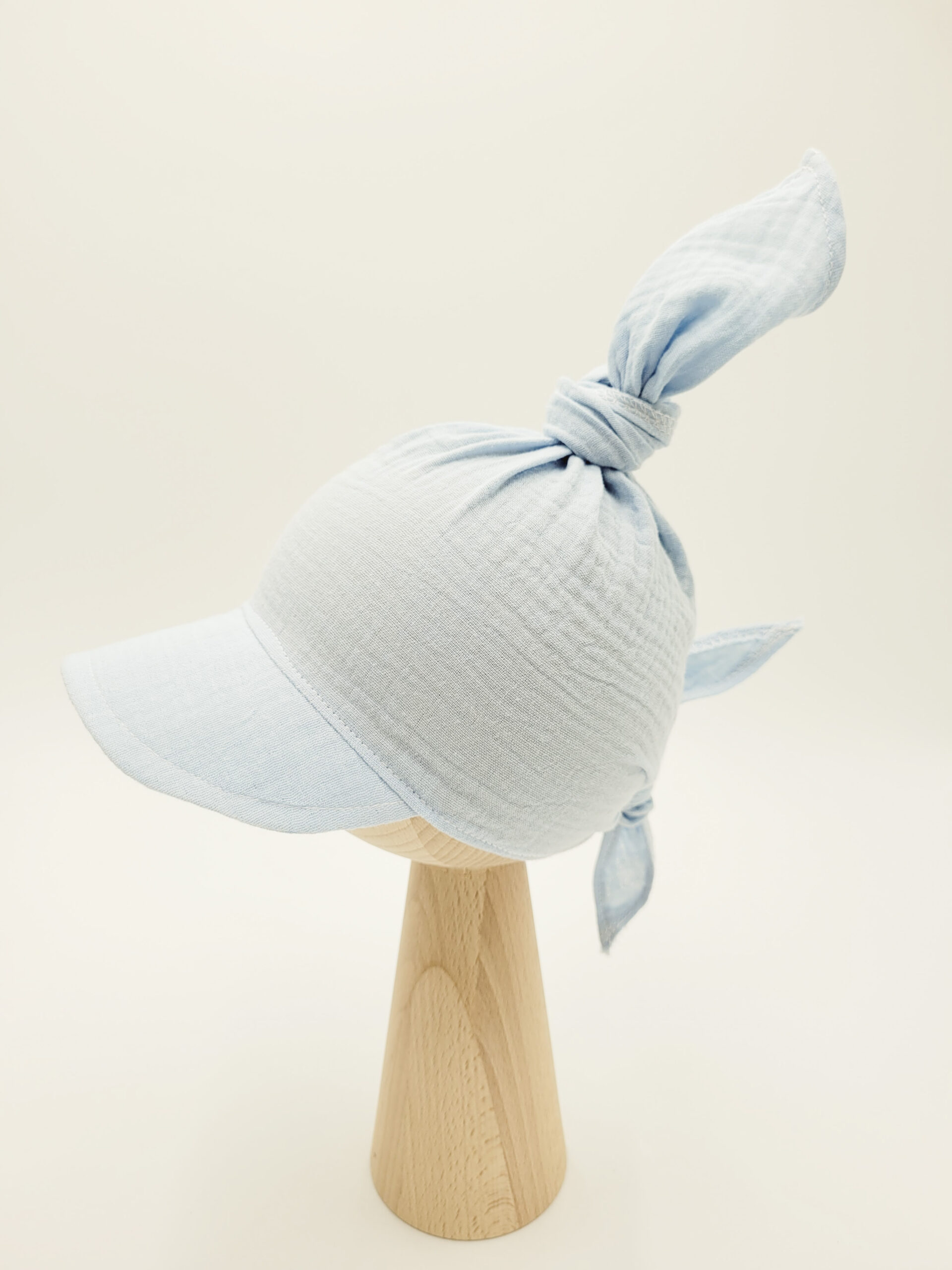 Chusta z daszkiem z supełkiem dla chłopca lub dziewczynki uszyta z muślinu bawełnianego w wybranym kolorze- wiązana lub na gumce.