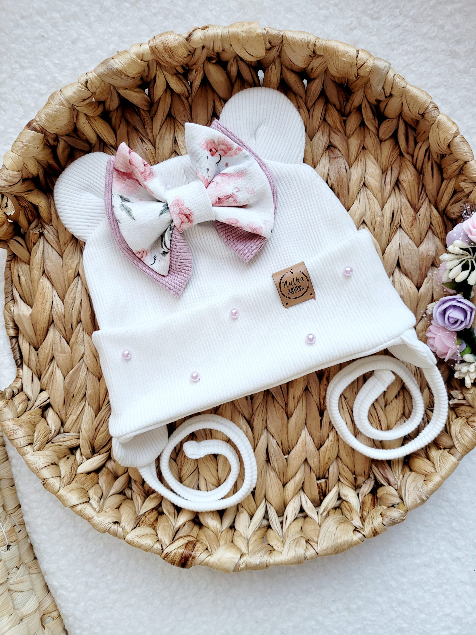 Czapka prążkowana dla dziewczynki ozdobiona misiowymi uszkami i kokardką wzór Peony. Opcje dodatkowe: wiązanie, perełki.