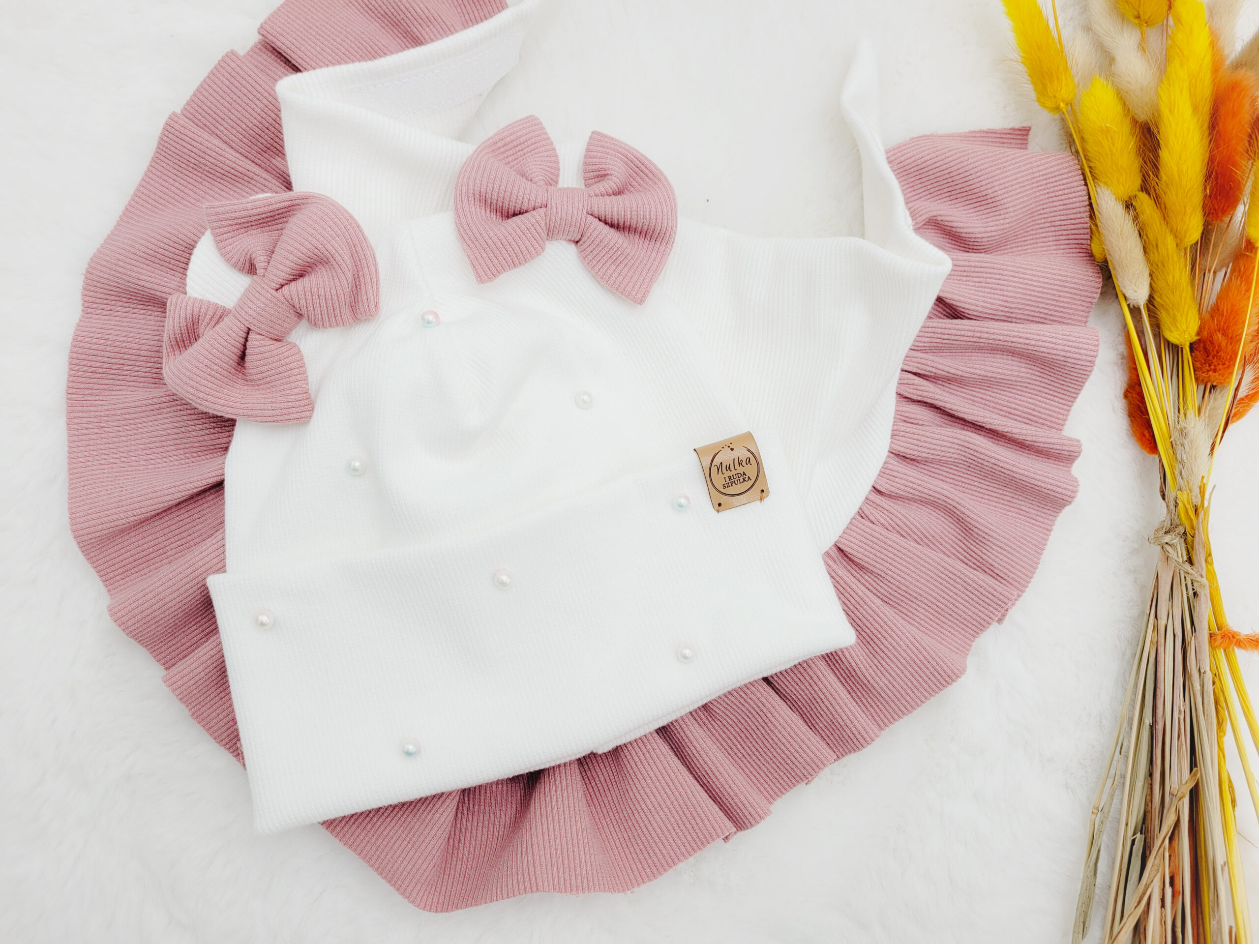Szukasz uroczej czapki dla swojej małej księżniczki? Czapka prążkowana wybranym kolorze ozdobiona misiowymi uszkami, perełkami i kokardkami brudny róż to doskonały wybór, który zapewnia zarówno ciepło, jak i stylowy wygląd.