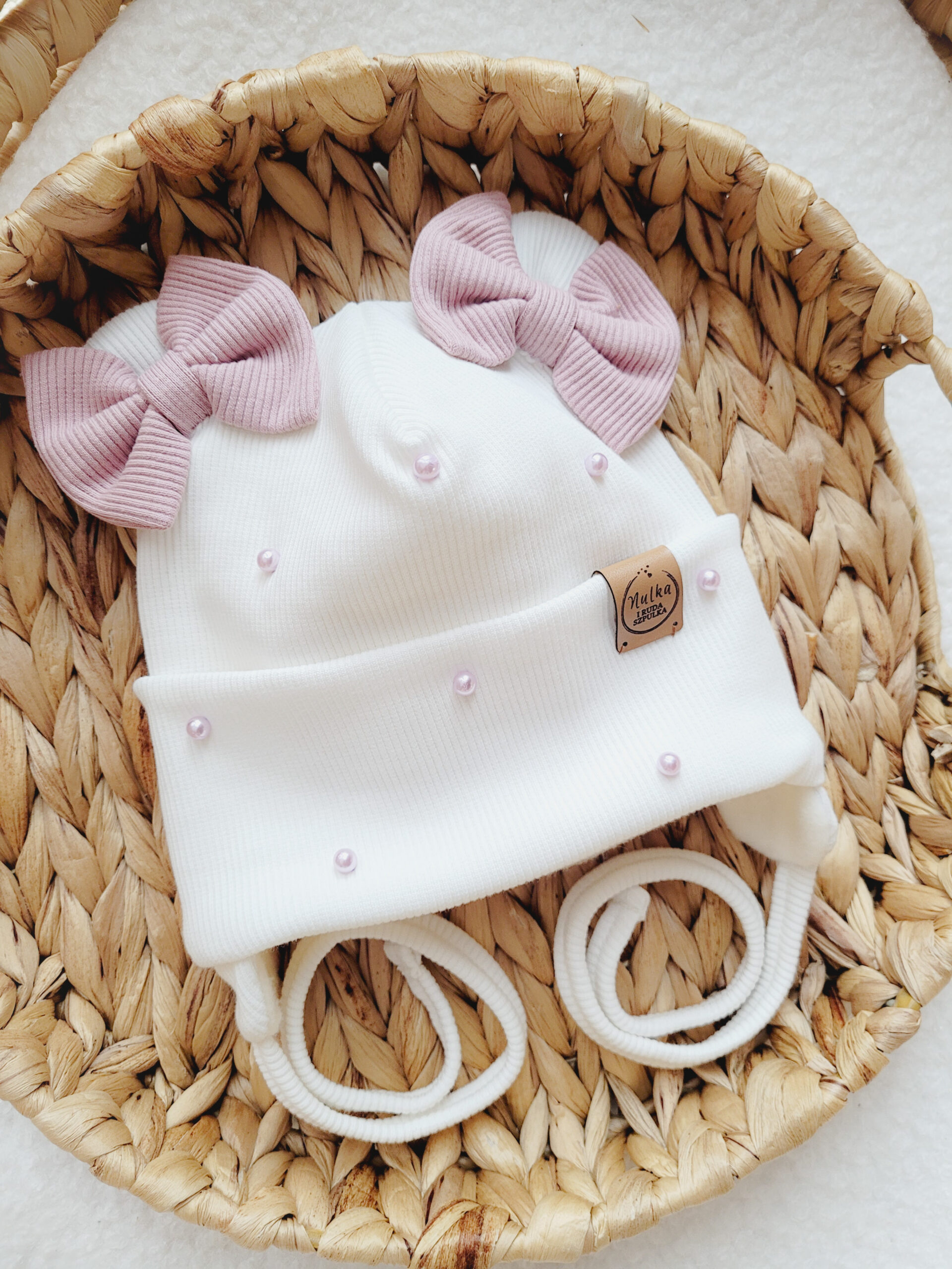 Czapka została uszyta z miękkiej i elastycznej dzianiny prążkowanej, która zapewnia komfort i ciepło. Ozdobiona uroczymi misiowymi uszkami, perełkami i kokardkami. Wersję zimową podszywamy polarem w wybranym kolorze. Czapka może być wiązana.
