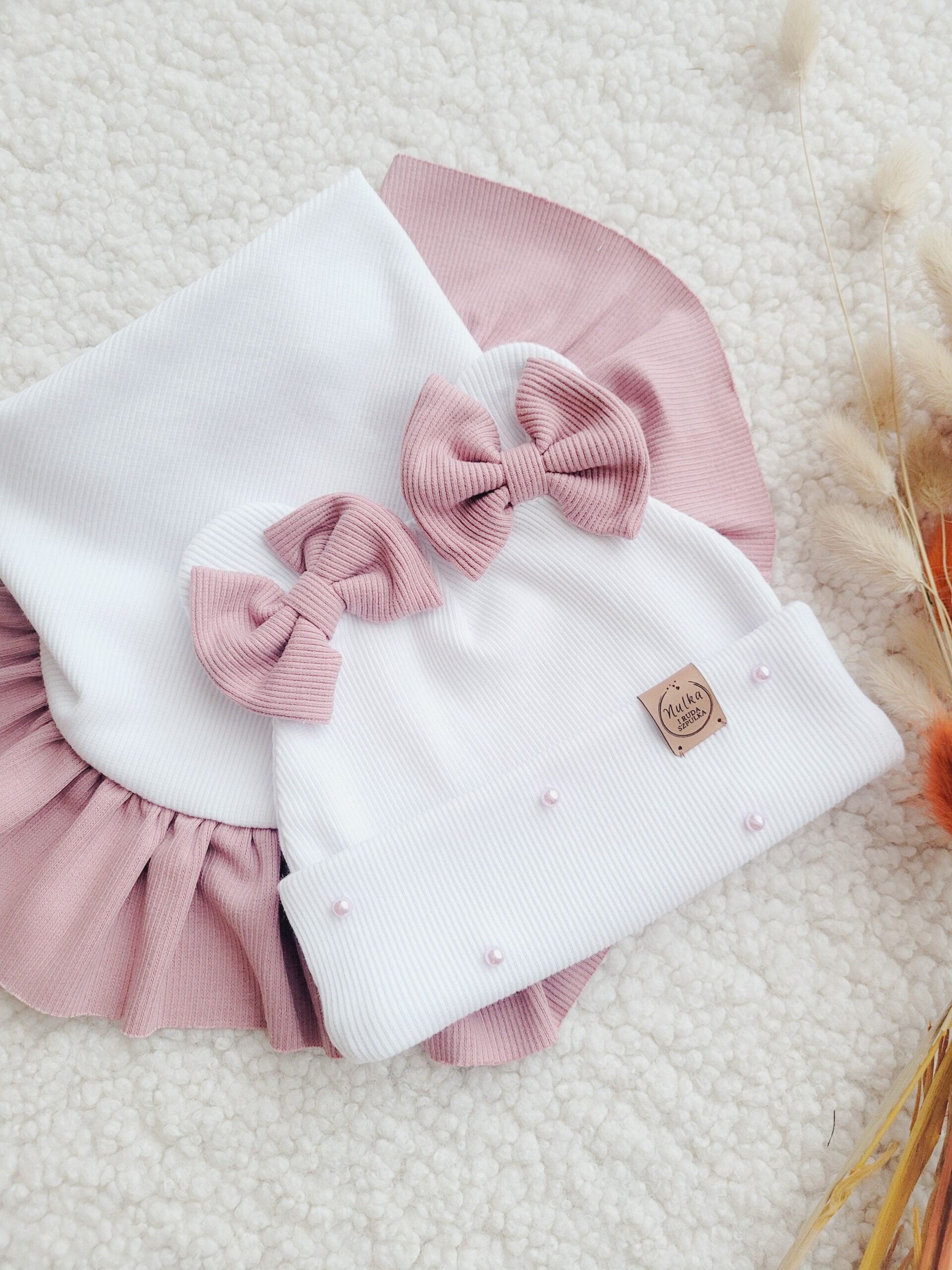 Szukasz uroczej czapki dla swojej małej księżniczki? Czapka prążkowana w wybranym kolorze ozdobiona misiowymi uszkami, perełkami i kokardkami pastelowy róż to doskonały wybór, który zapewnia zarówno ciepło, jak i stylowy wygląd. Idealny zestaw na chrzest.
