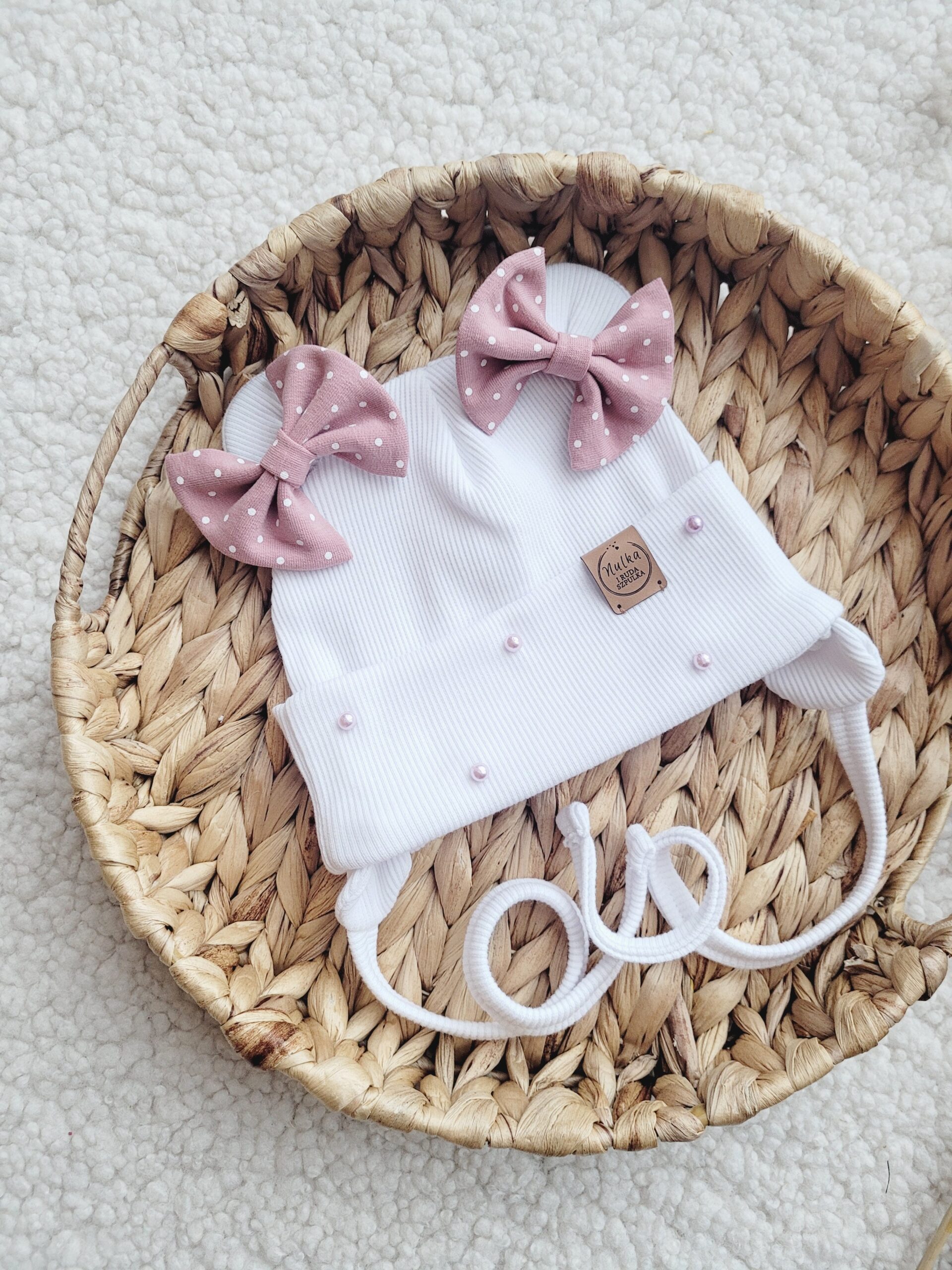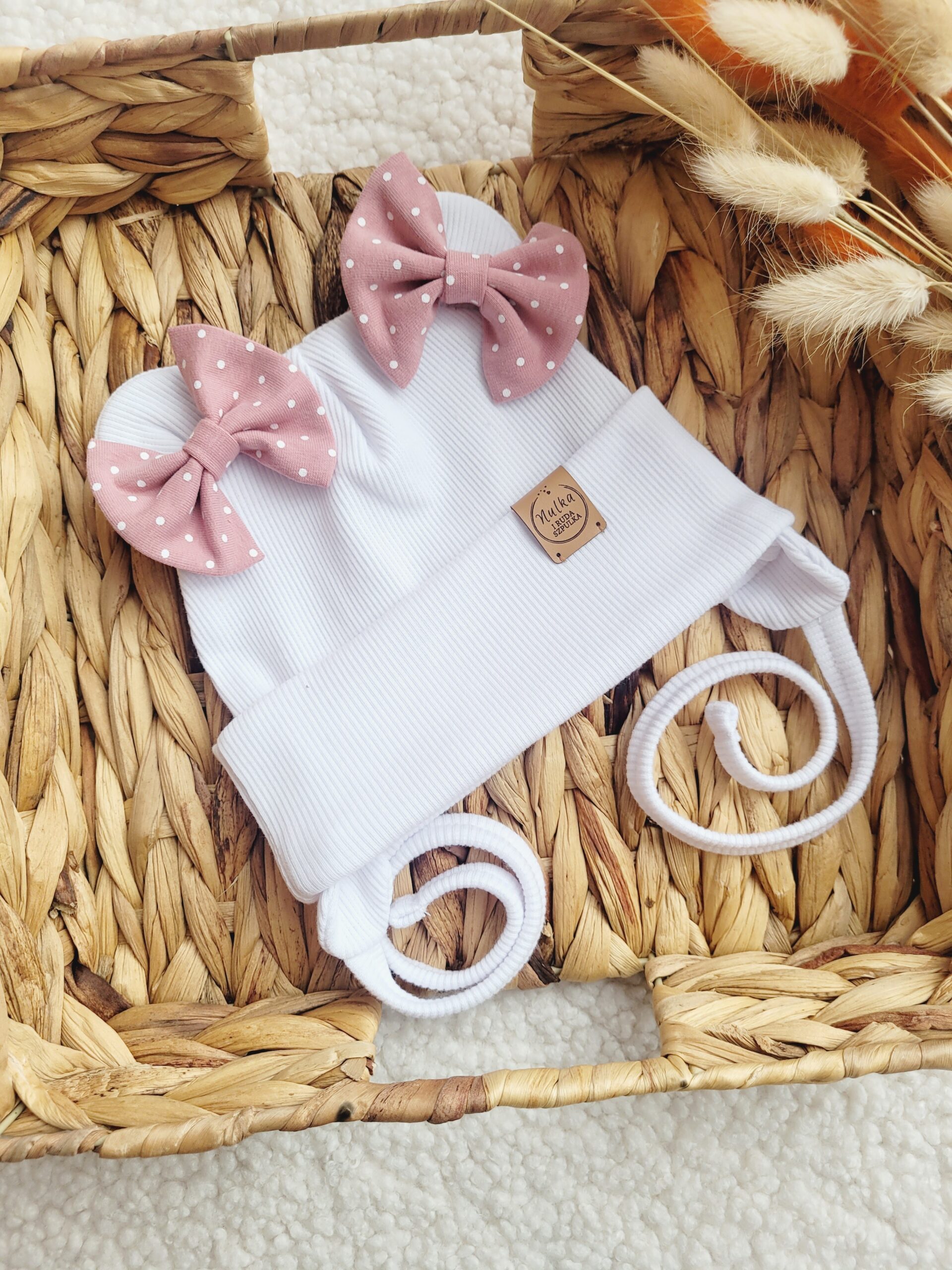 Poszukujesz wyjątkowej czapki dla swojej małej księżniczki? Nasza czapka dla dziewczynki z pewnością spełni Twoje oczekiwania! Wykonana z wysokiej jakości dzianiny prążkowanej w białym kolorze, ozdobiona misiowymi uszkami i dwoma uroczymi kokardkami w kolorze brudny róż z białymi kropeczkami.