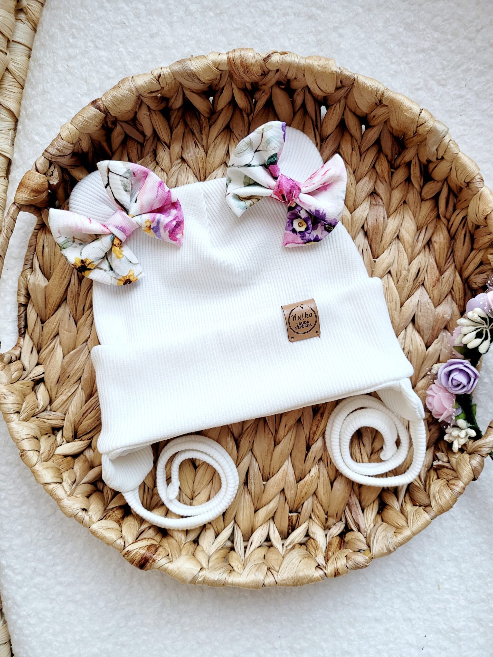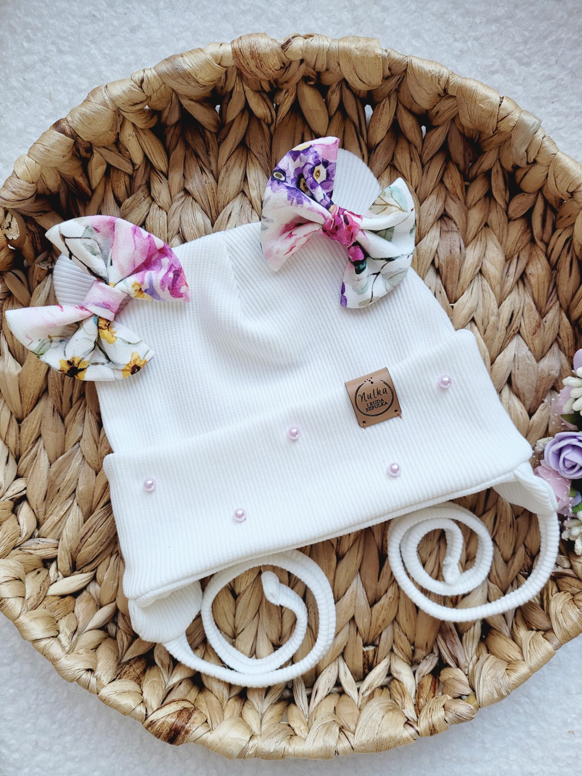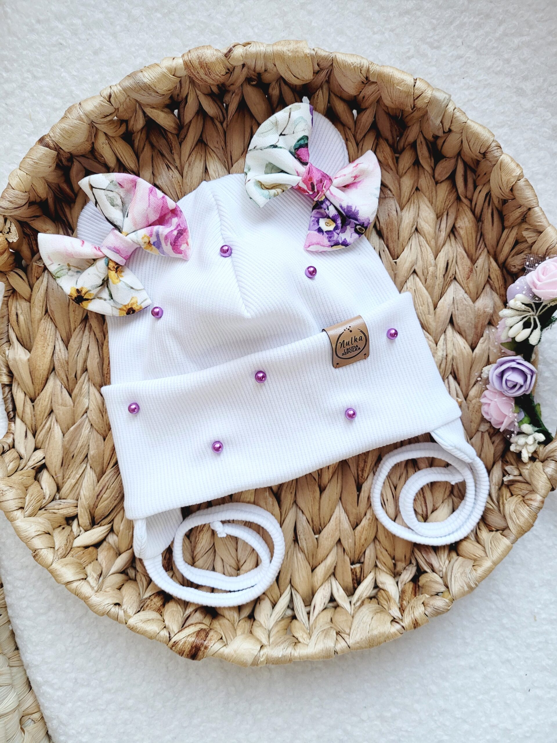A to jeszcze nie wszystko! Specjalnie dla Ciebie możemy ozdobić czapkę pięknymi dodatkami. Jeśli szukasz czegoś jeszcze bardziej funkcjonalnego, wybierz wiązanie z nausznikami lub dodaj śliczne perełki (różowe dla czapki białej i ecru, pozostałe kolory perłowe) na wywinięciu co sprawi, że będzie jeszcze piękniejsza!