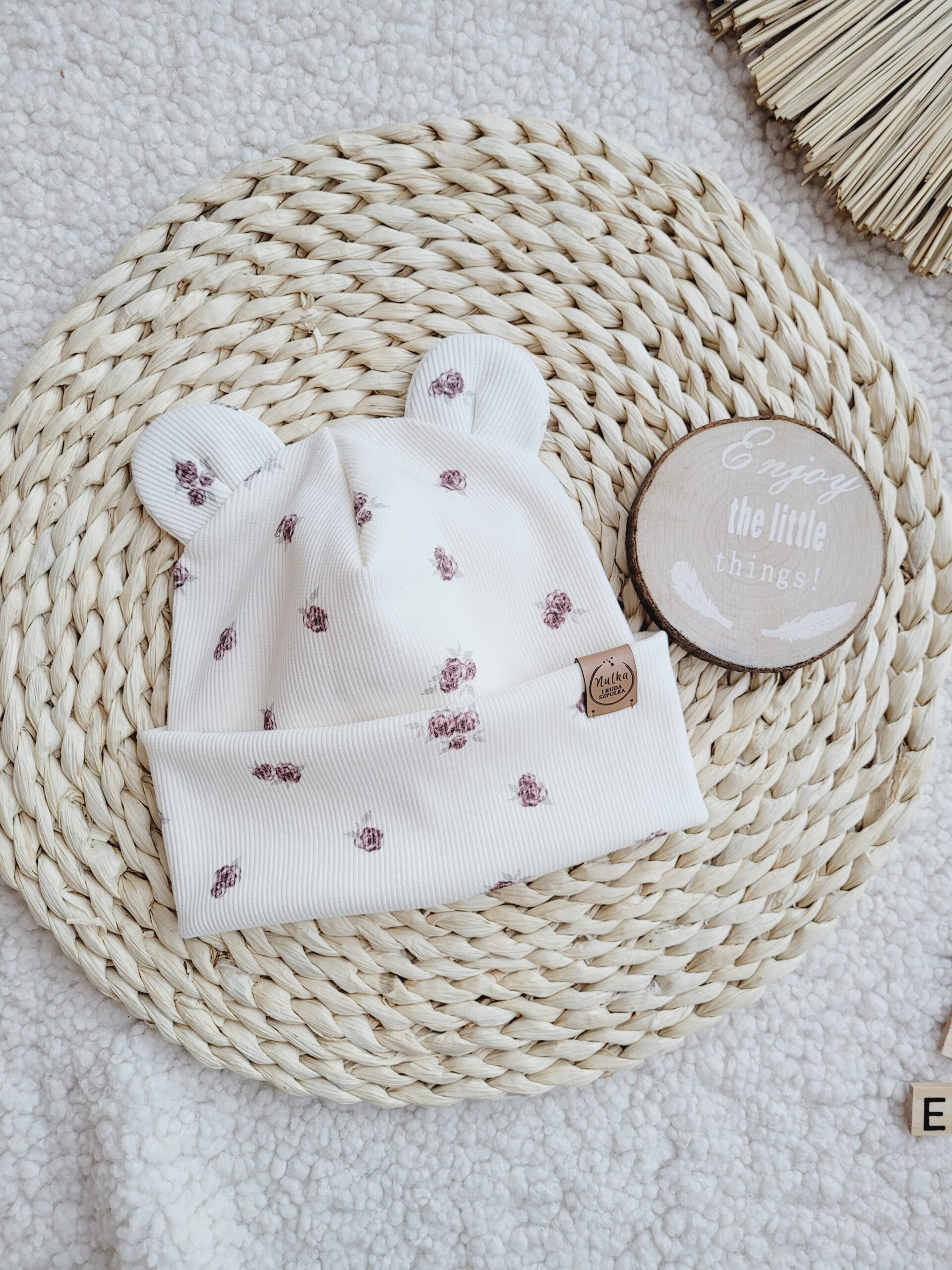 Czapka z dzianiny prążkowanej ozdobiona misiowymi uszami w różyczki.
