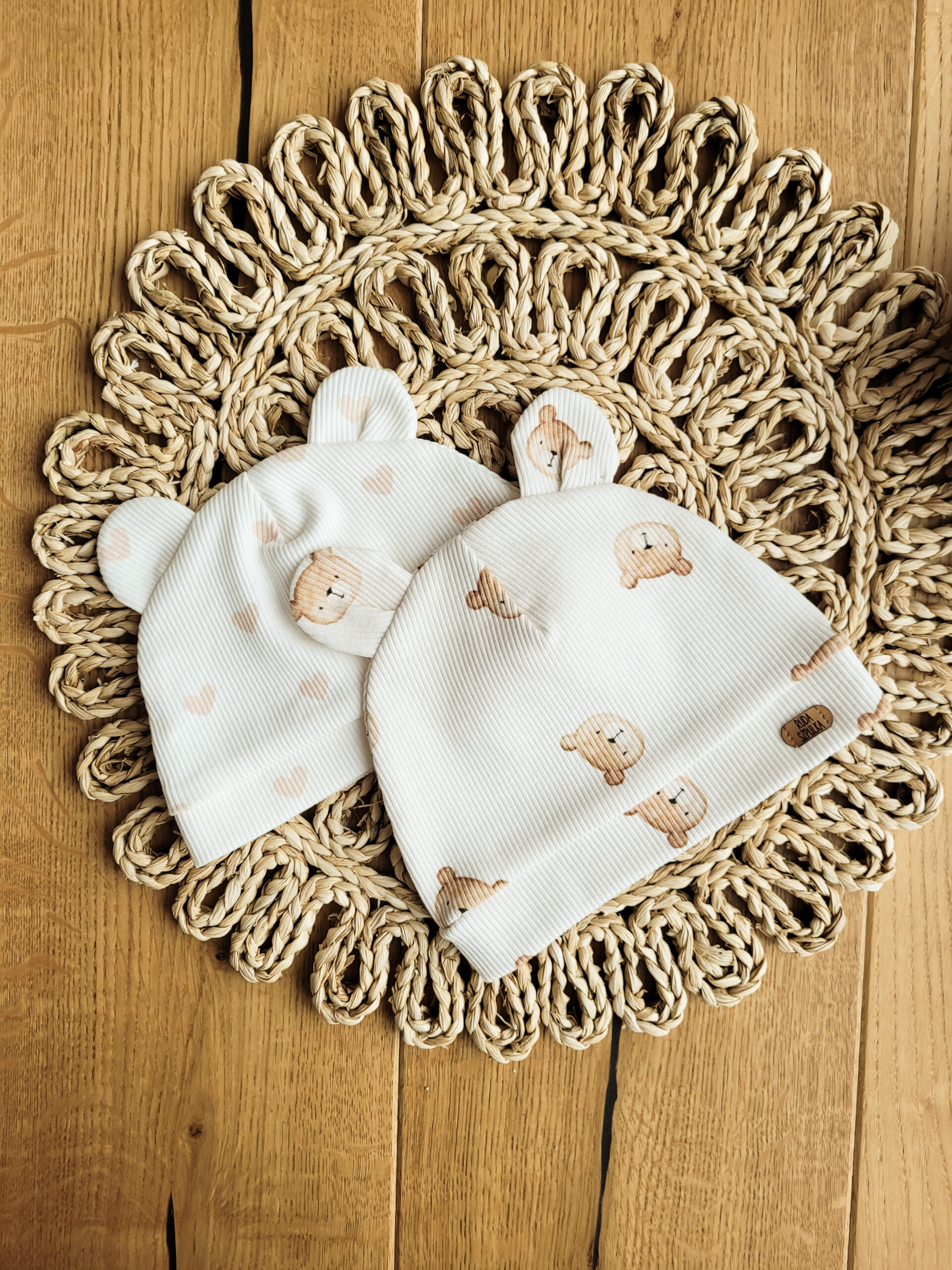 Niemowlęca czapka z dzianiny prążkowanej z misiowymi uszkami w różnych wzorach do wyboru. Rozmiary od 34 do 46.