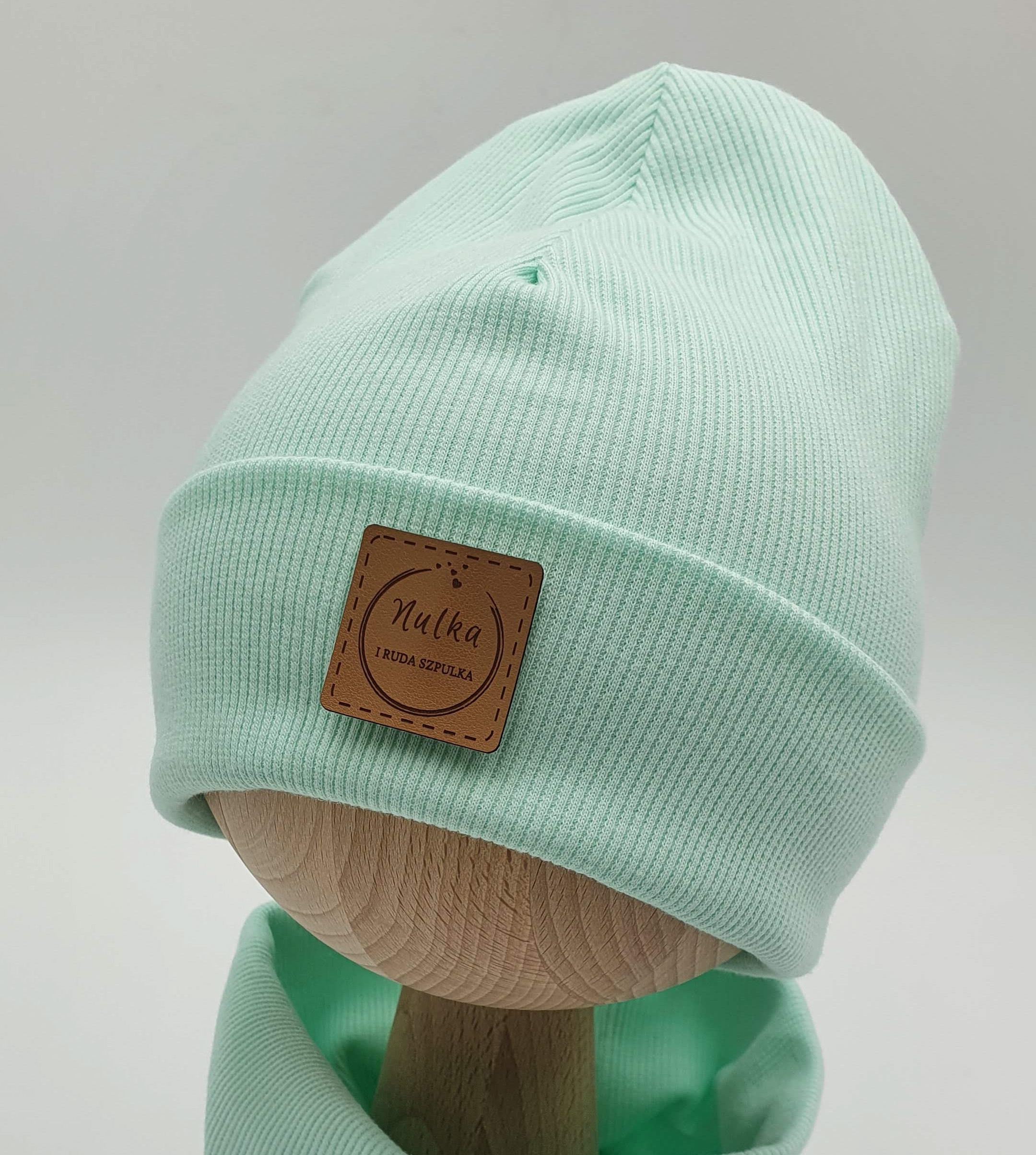 Czapka z dzianiny prążkowanej w kolorze miętowym.