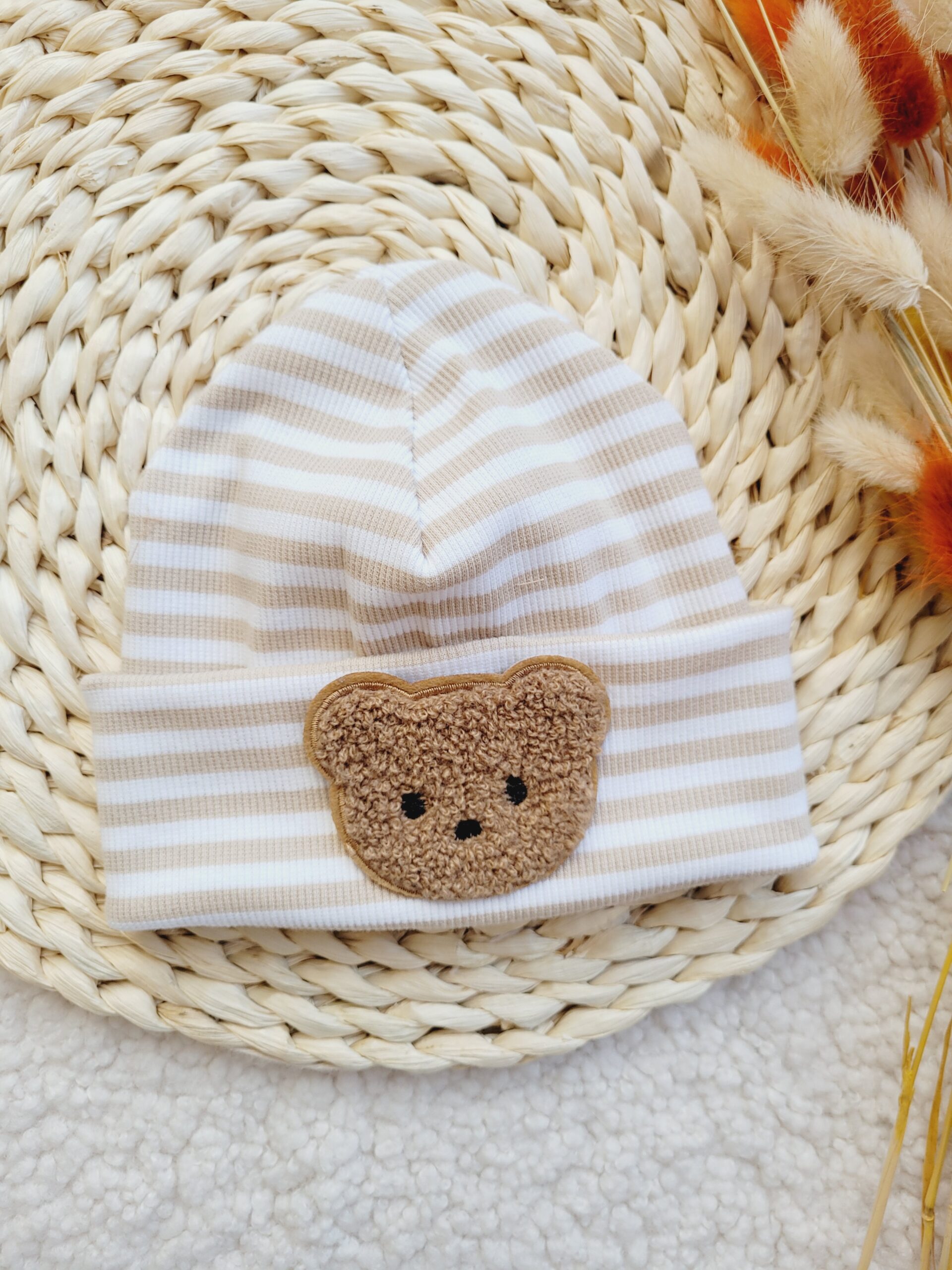 Czapka prążkowana beanie dla chłopca i dziewczynki w paski beżowe z naszywką misia. Rozmiary 34-54.