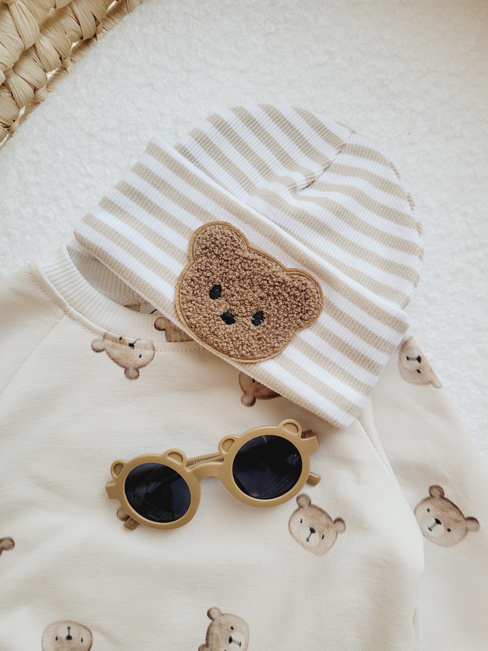 Uszyliśmy ją z miękkiej, elastycznej dzianiny prążkowanej z beżowymi paskami, dzięki czemu dobrze dopasowuje się do główki i nie powoduje dyskomfortu. Dodatkowo naszywka z misiem nadaje całości wyjątkowego, dziecięcego charakteru, który przyciąga uwagę i dodaje uroku każdej stylizacji.