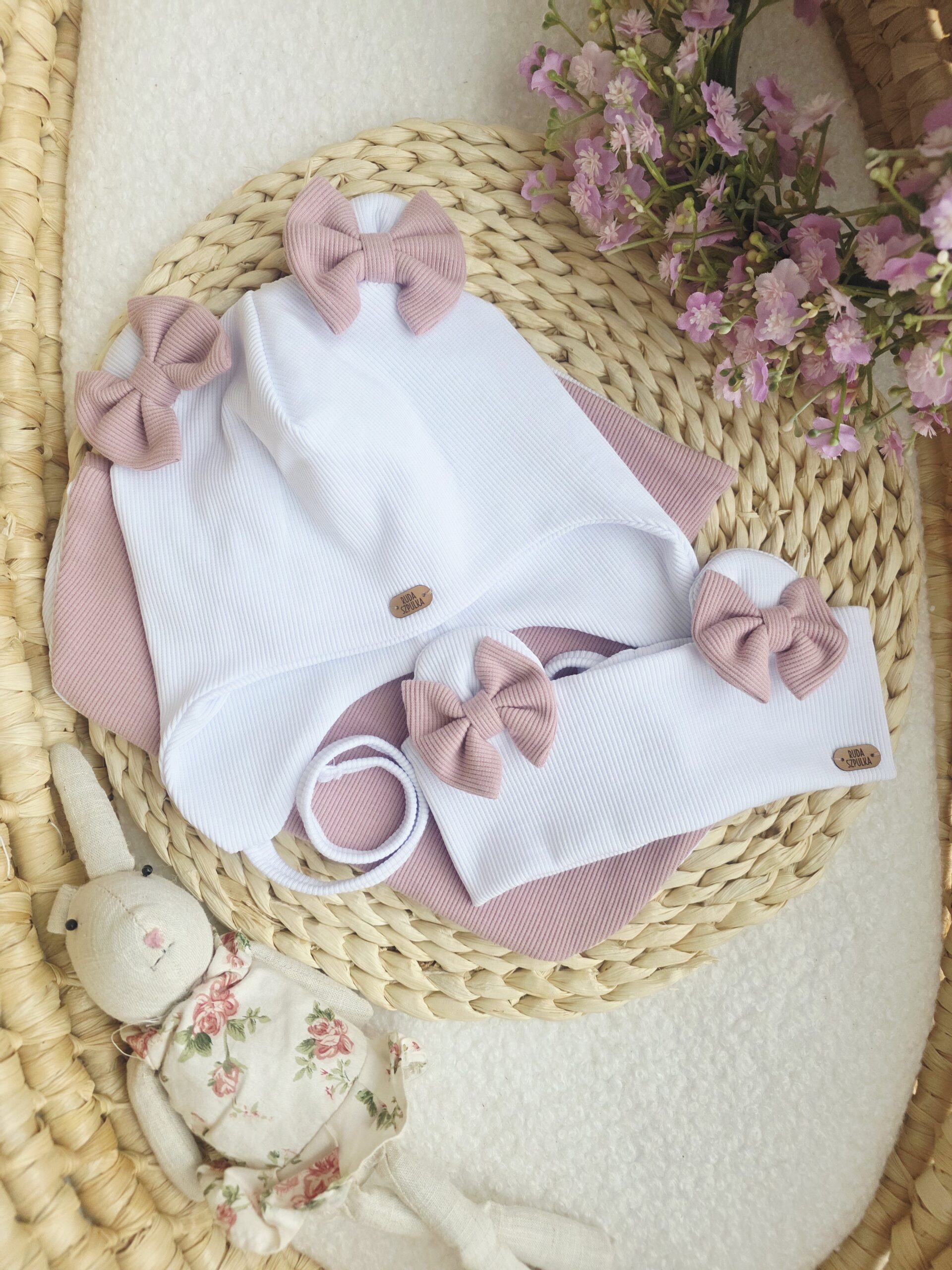 Wiązana czapka dla dziewczynki z uszkami misia i kokardkami