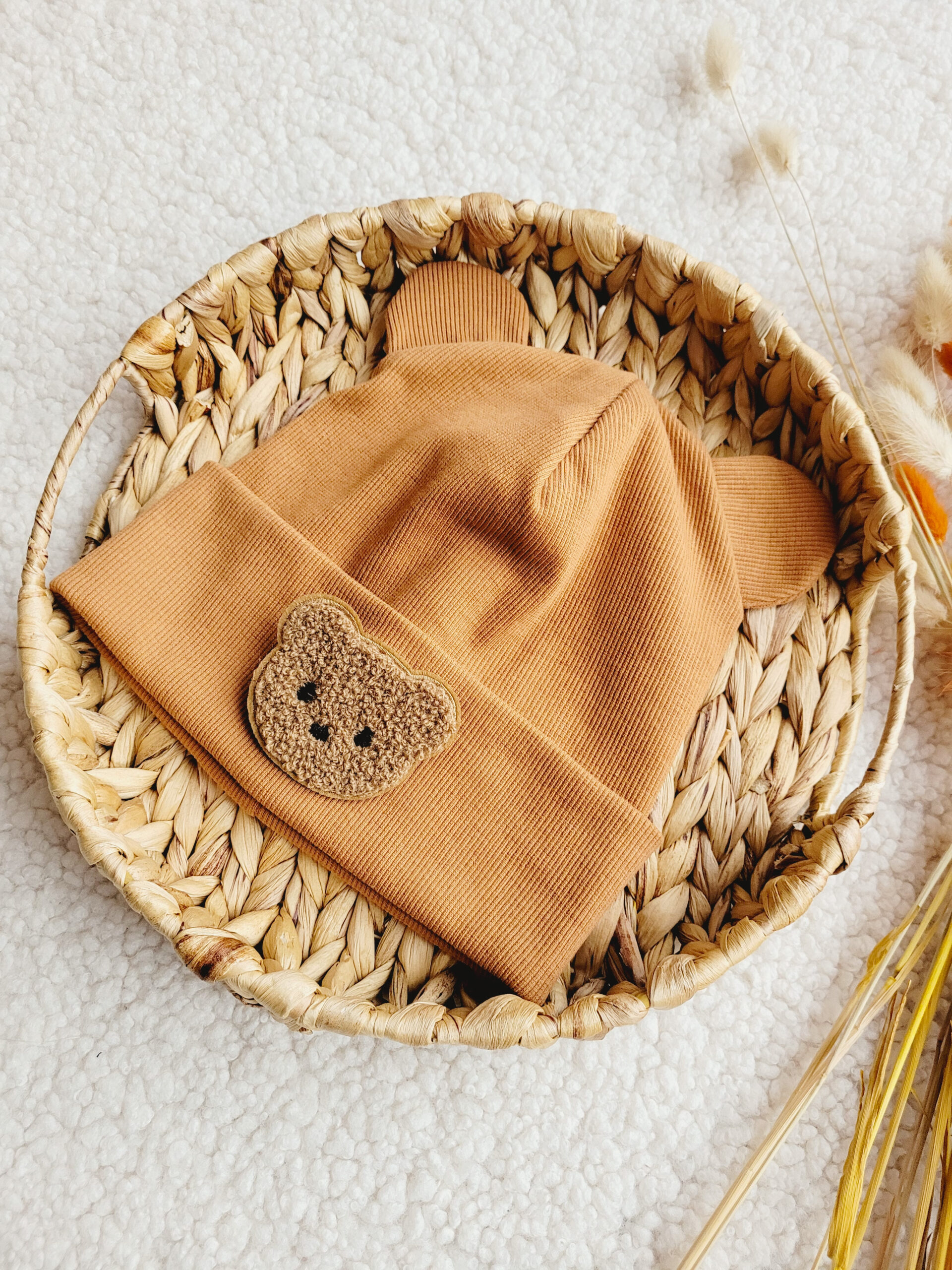 Czapka prążkowana z uszkami dla chłopca lub dziewczynki w wybranym kolorze ozdobiona naszywką z misiem.
