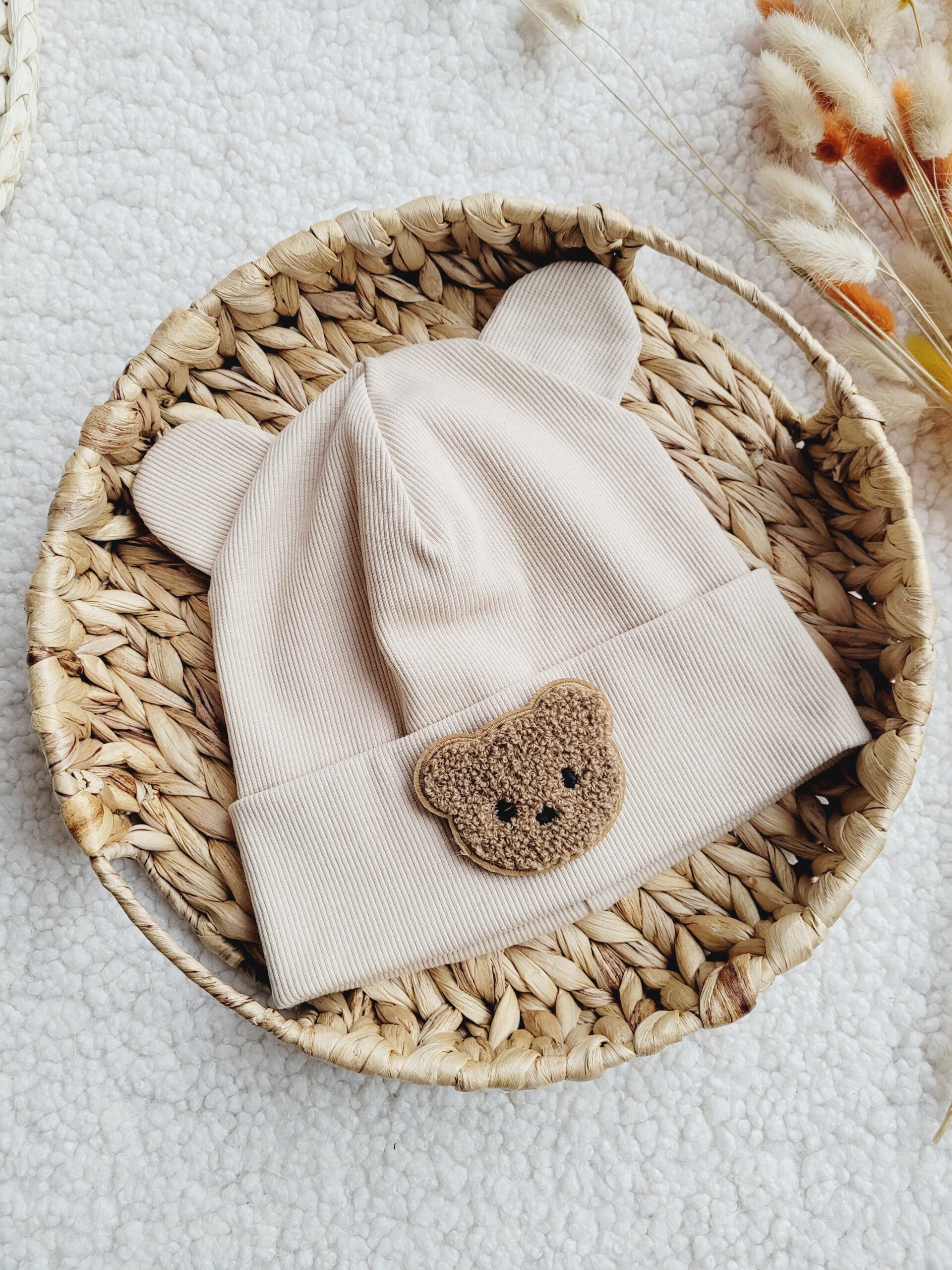 Czapka prążkowana z uszkami beanie dla chłopca i dziewczynki w wybranym kolorze z naszywką misia. Rozmiary 34-54.