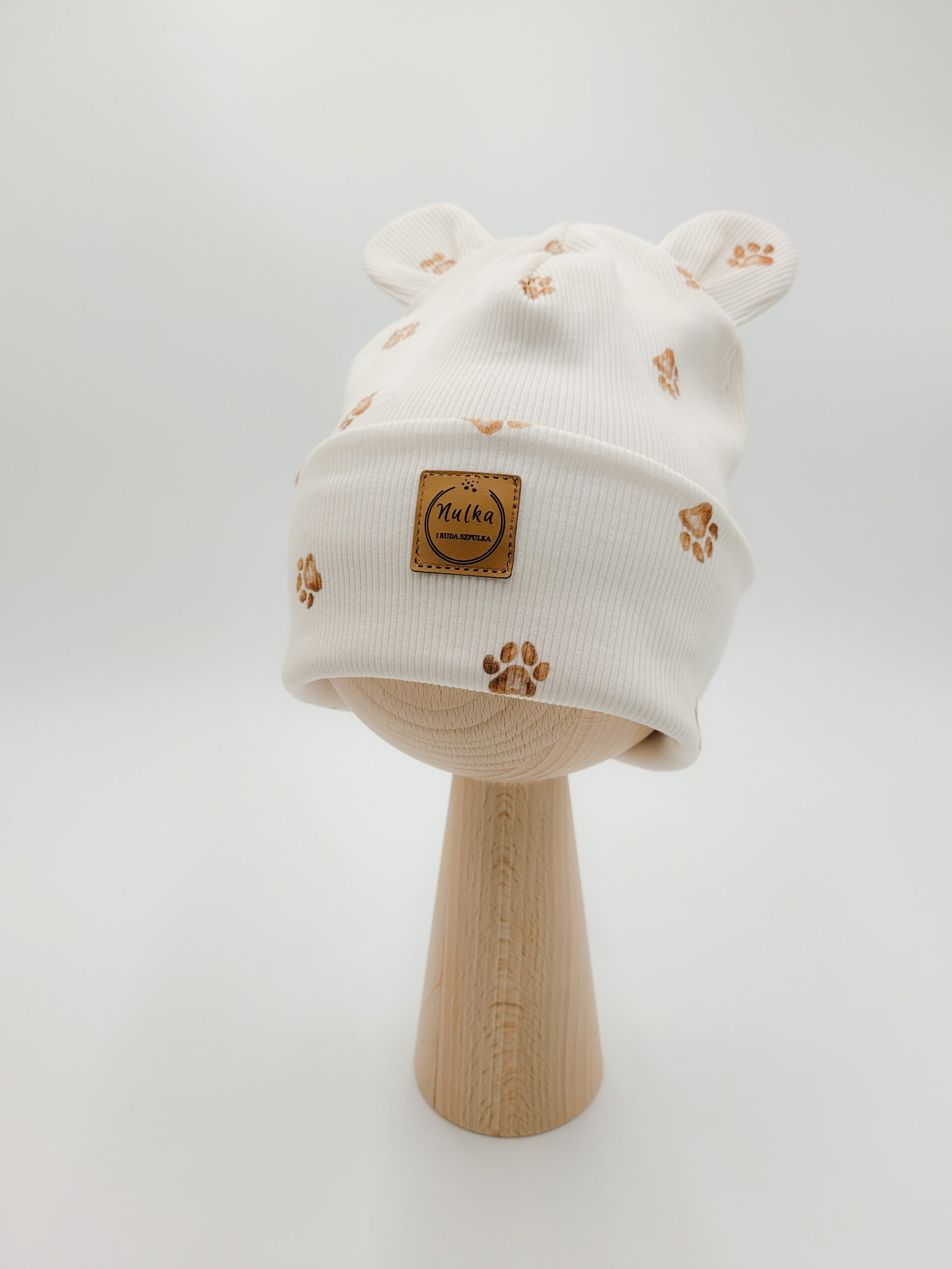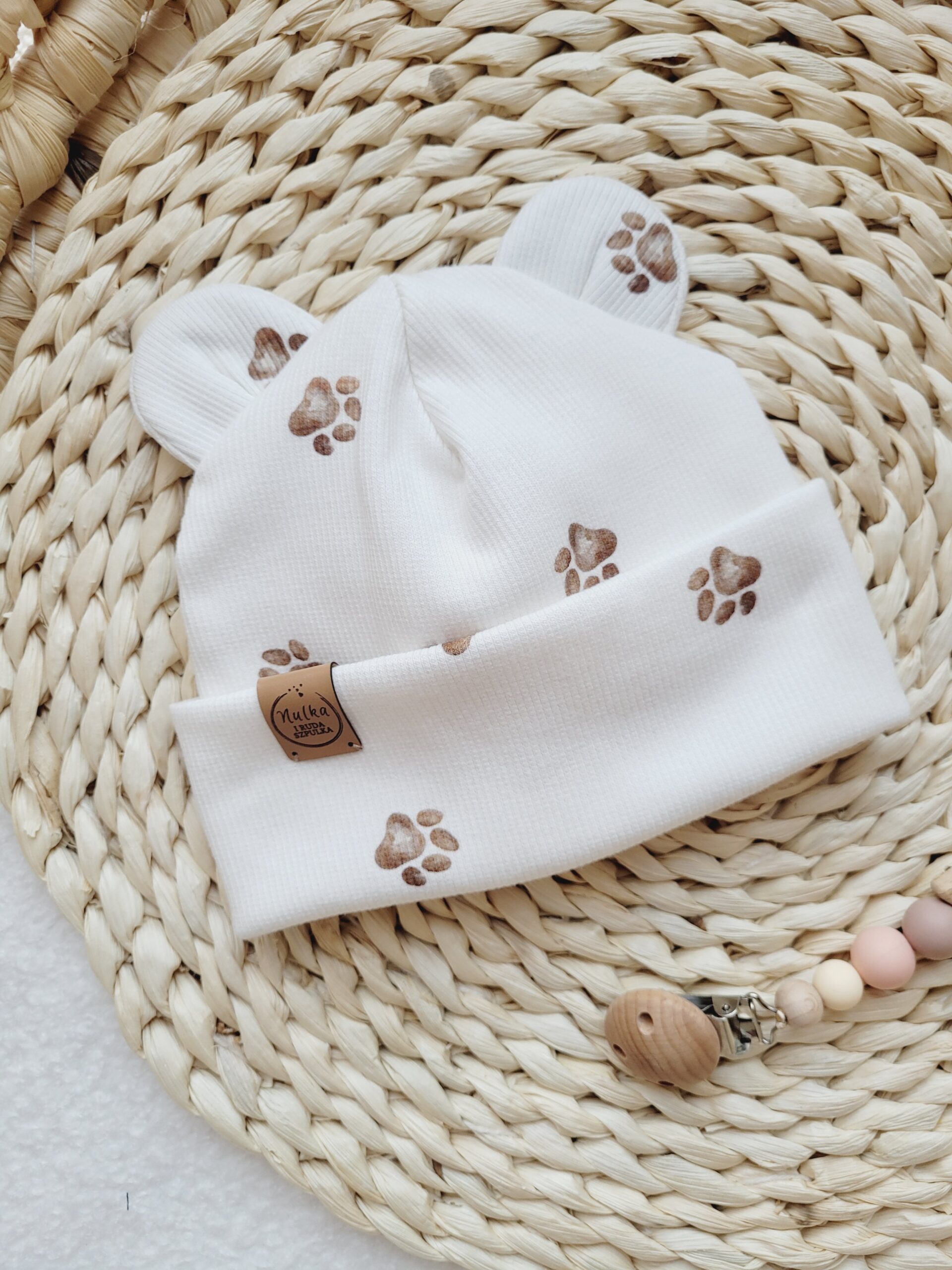 Czapka z dzianiny prążkowanej ozdobiona misiowymi uszami wzór psie łapki. Rozmiary dla dzieci i niemowląt a także dla wcześniaków.