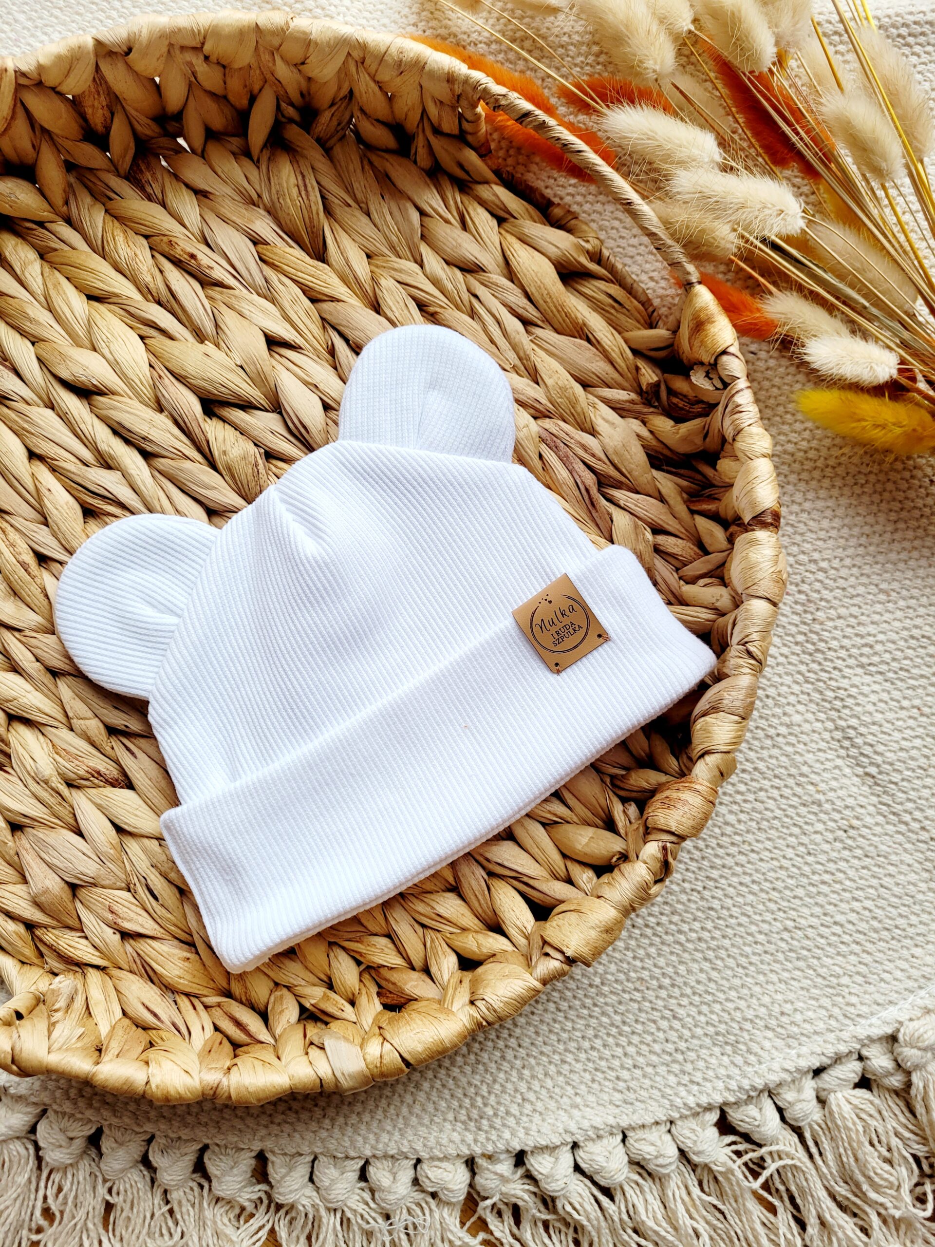 Prosta lub wywijana czapka z dzianiny prążkowanej ozdobiona misiowymi uszami w kolorze białym. Możliwe wiązanie i dodatkowe kokardki.