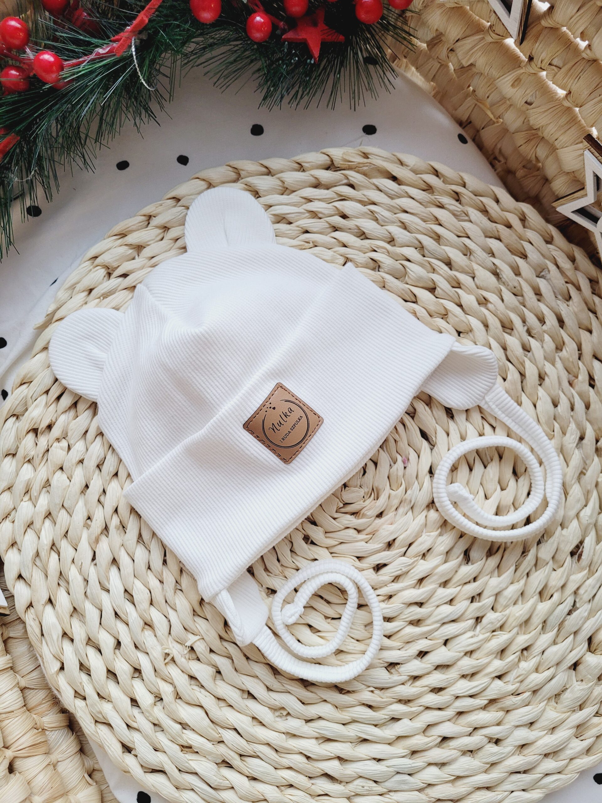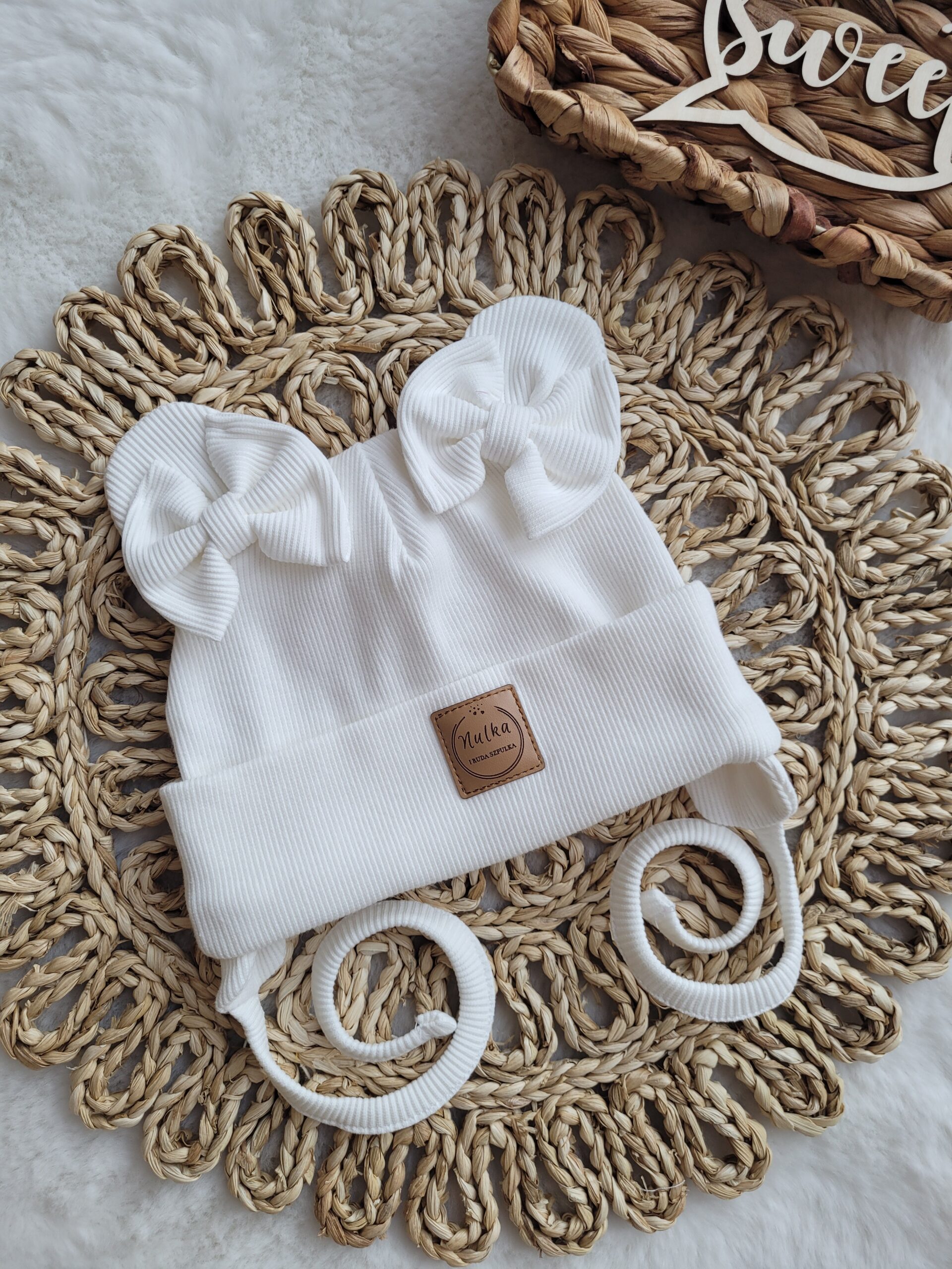 Prosta lub wywijana czapka z dzianiny prążkowanej ozdobiona misiowymi uszami w kolorze ecru. Możliwe wiązanie i dodatkowe kokardki.