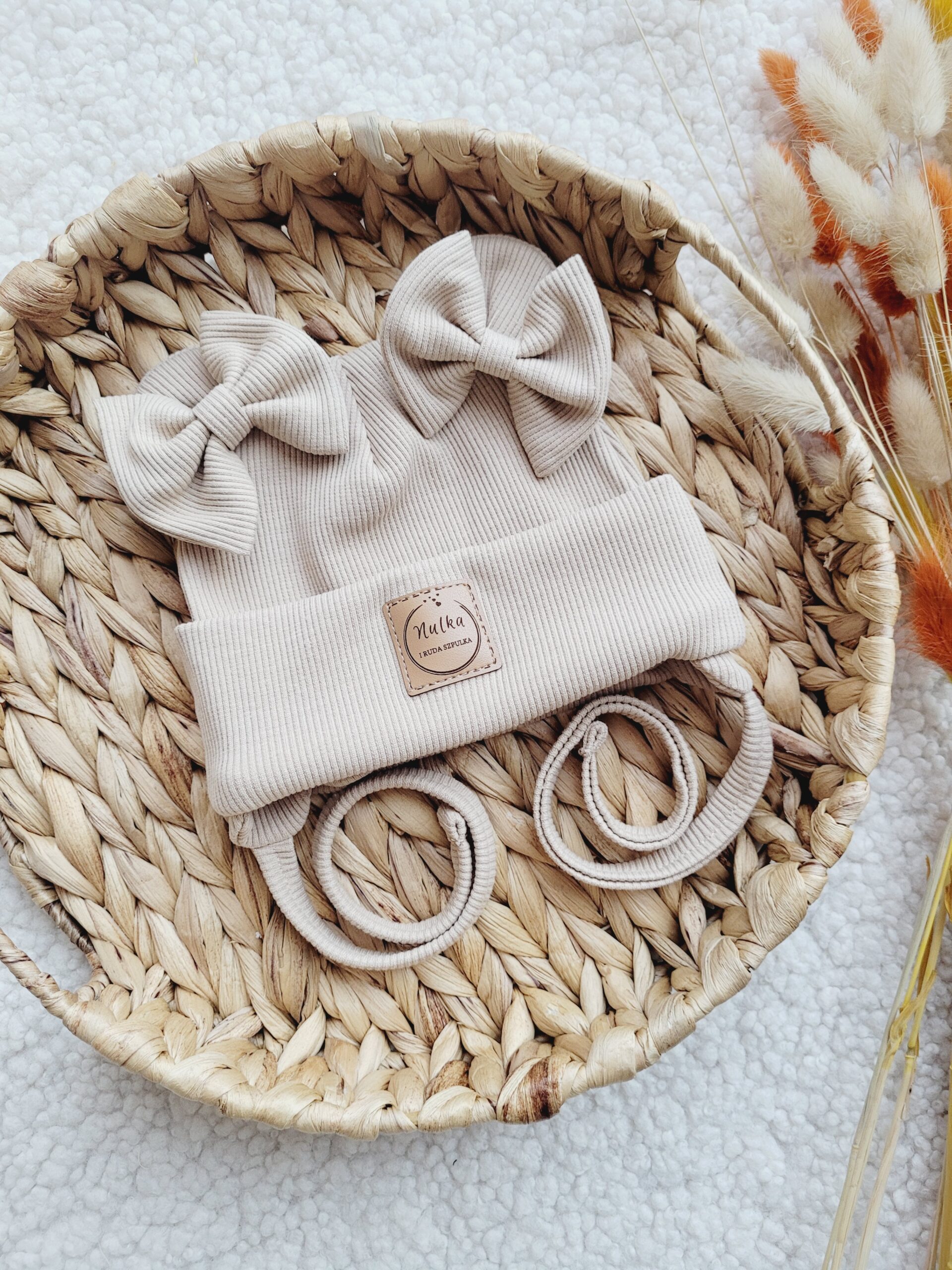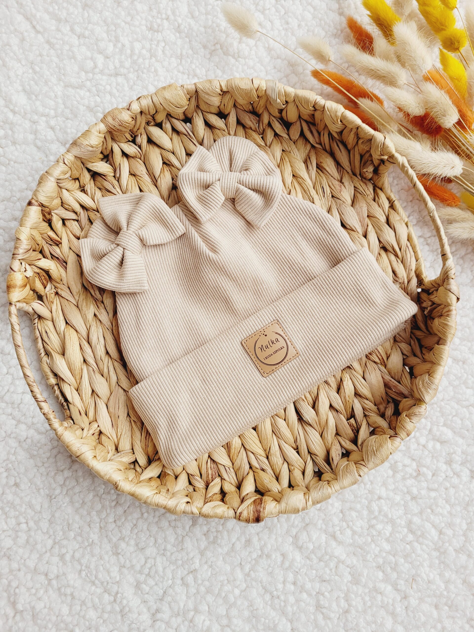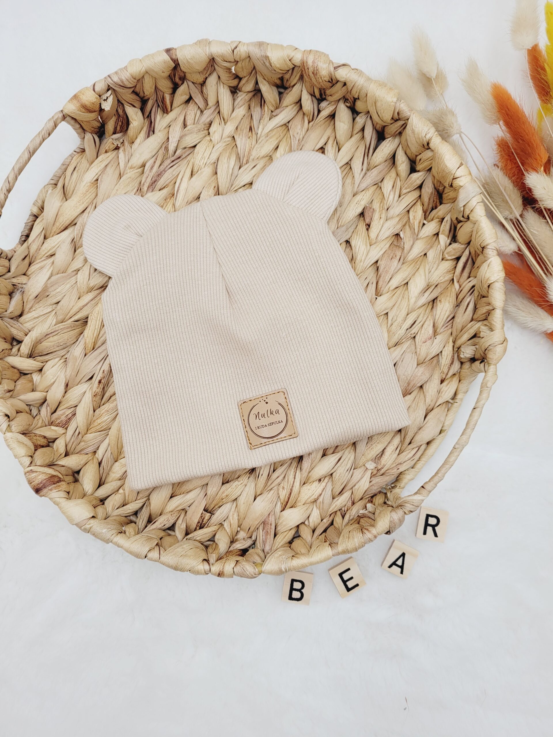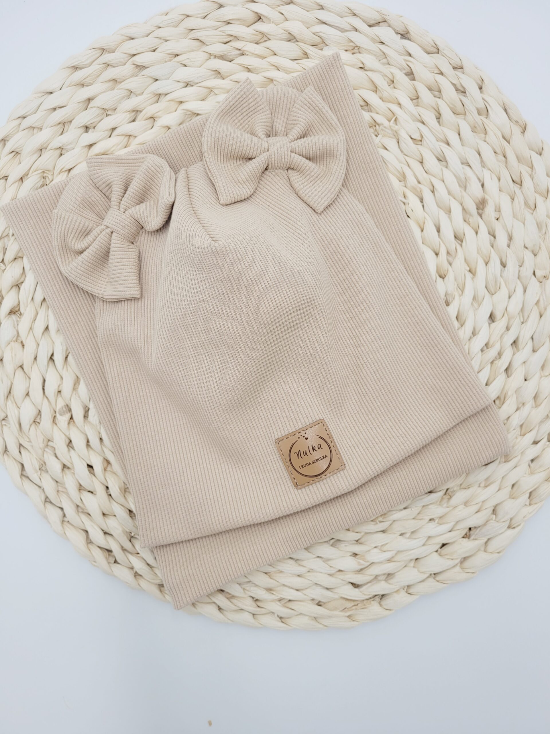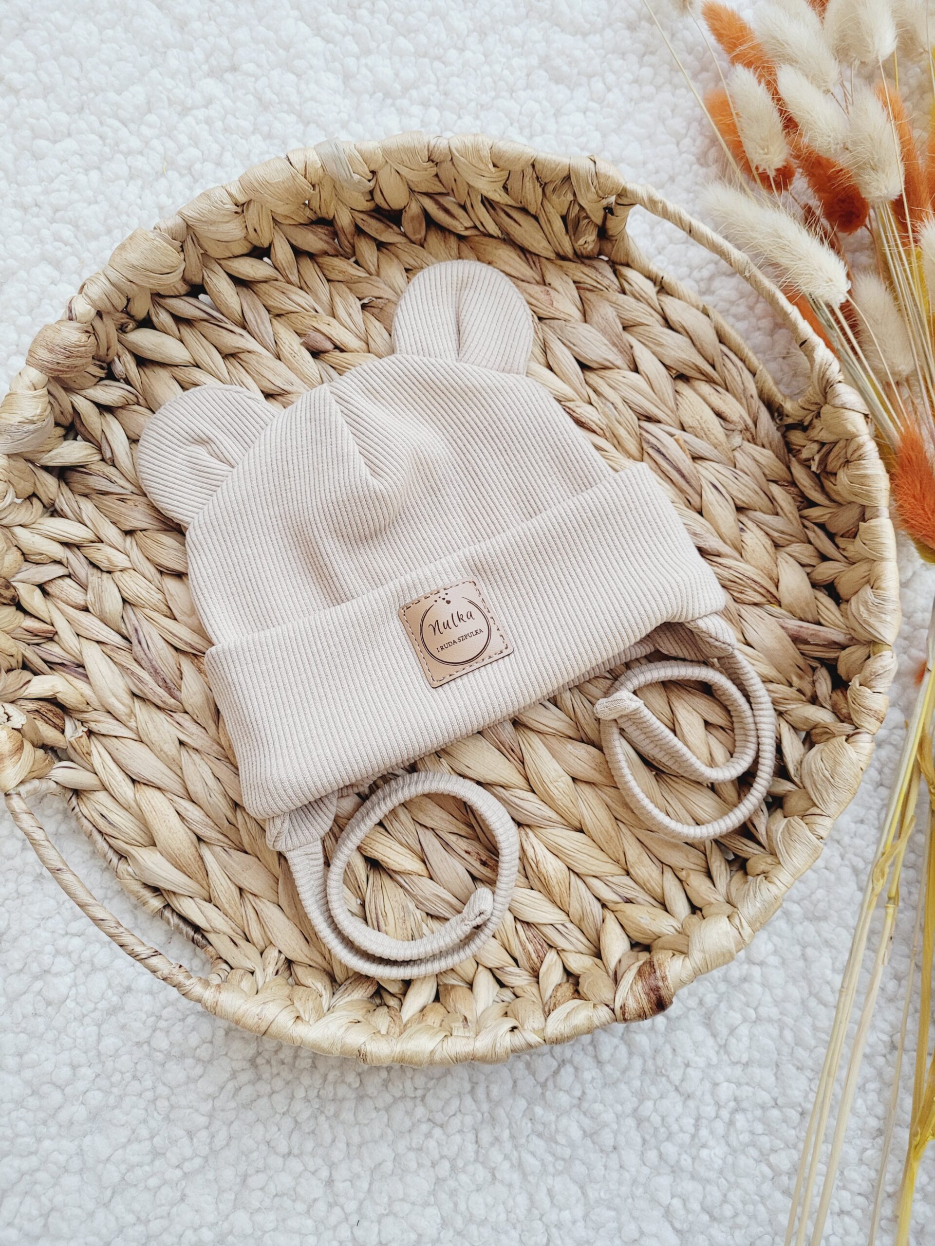 Prosta lub wywijana czapka z dzianiny prążkowanej ozdobiona misiowymi uszami w kolorze jasny beż. Możliwe wiązanie i dodatkowe kokardki.
