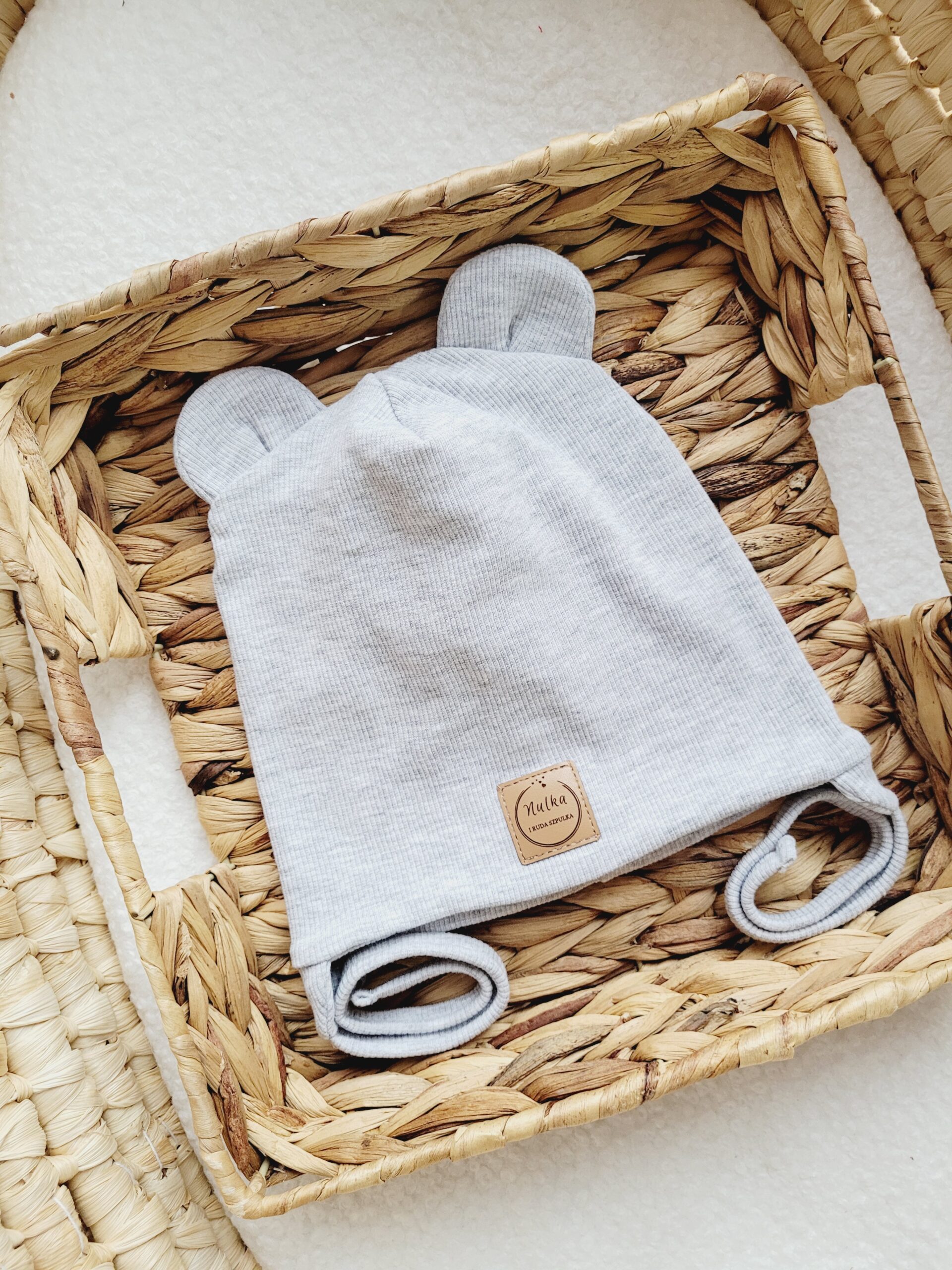 Prosta lub wywijana czapka z dzianiny prążkowanej ozdobiona misiowymi uszami w kolorze jasny szary melanż.