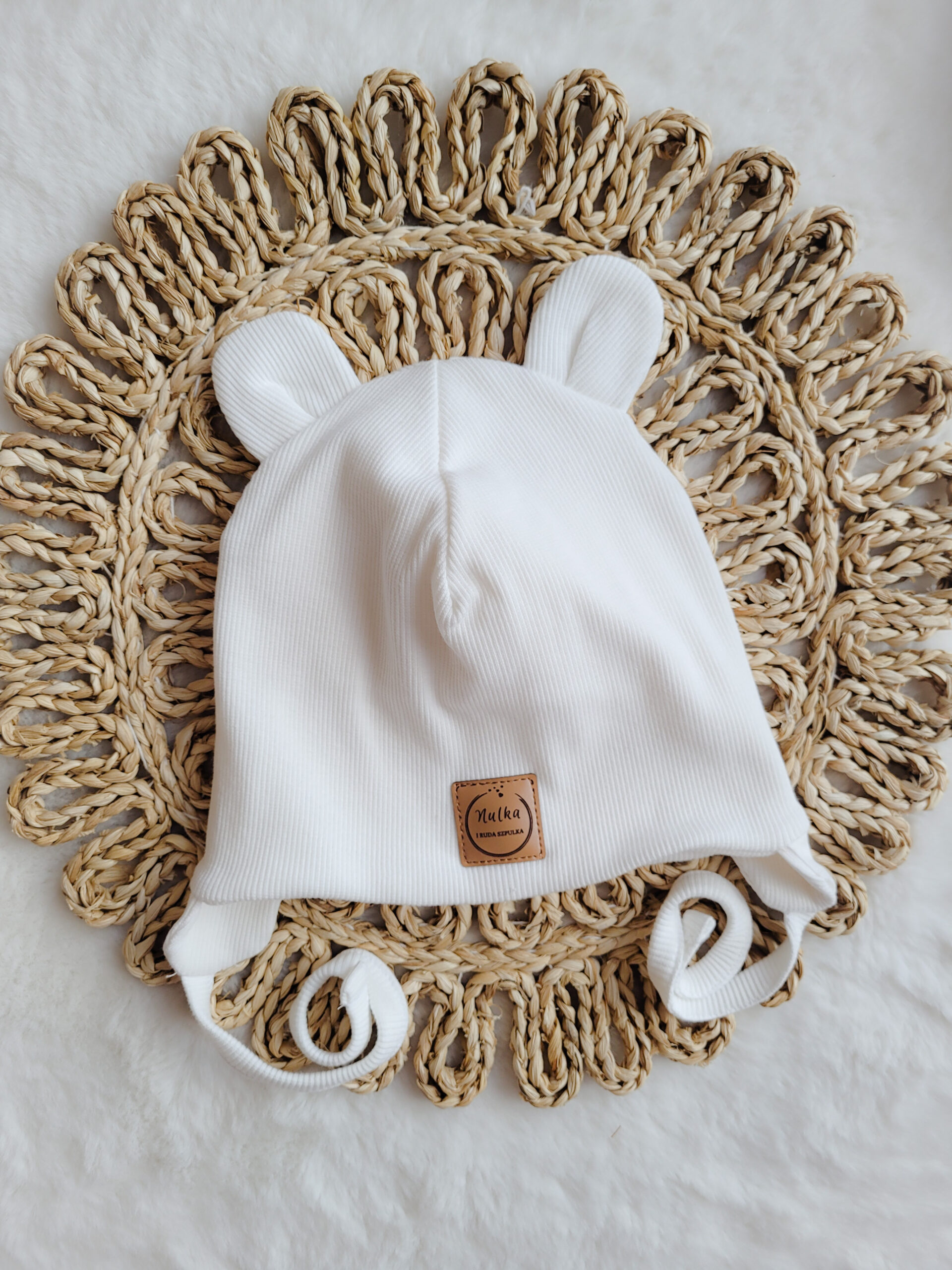 Prosta lub wywijana czapka z dzianiny prążkowanej ozdobiona misiowymi uszami w kolorze białym. Możliwe wiązanie i dodatkowe kokardki.