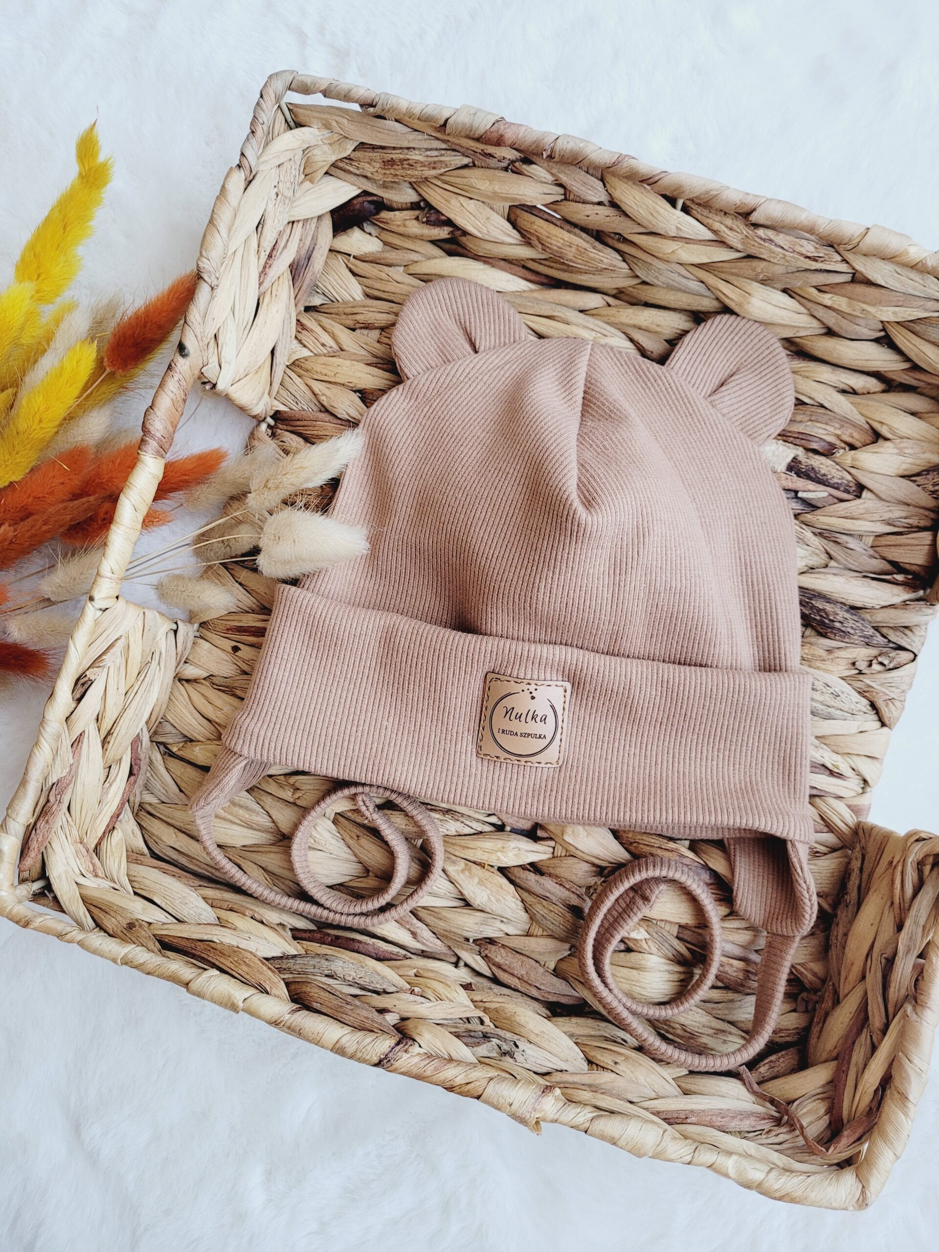 Prosta lub wywijana czapka z dzianiny prążkowanej ozdobiona misiowymi uszami w kolorze karmelowym. Możliwe wiązanie i dodatkowe kokardki.