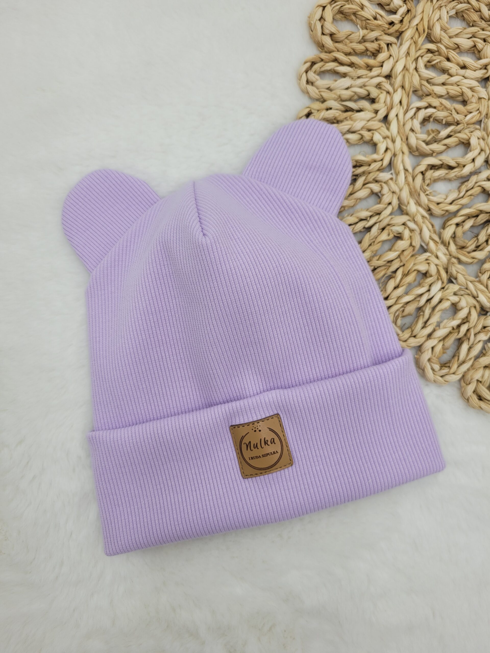Czapka dla dziewczynki ozdobiona misiowymi uszkami w kolorze lawendy. Uszyta z dzianiny prążkowanej, która dopasowuje się do głowy dziecka. Szyjemy ją w rozmiarach dla noworodka, niemowlaka czy starszego dziecka.