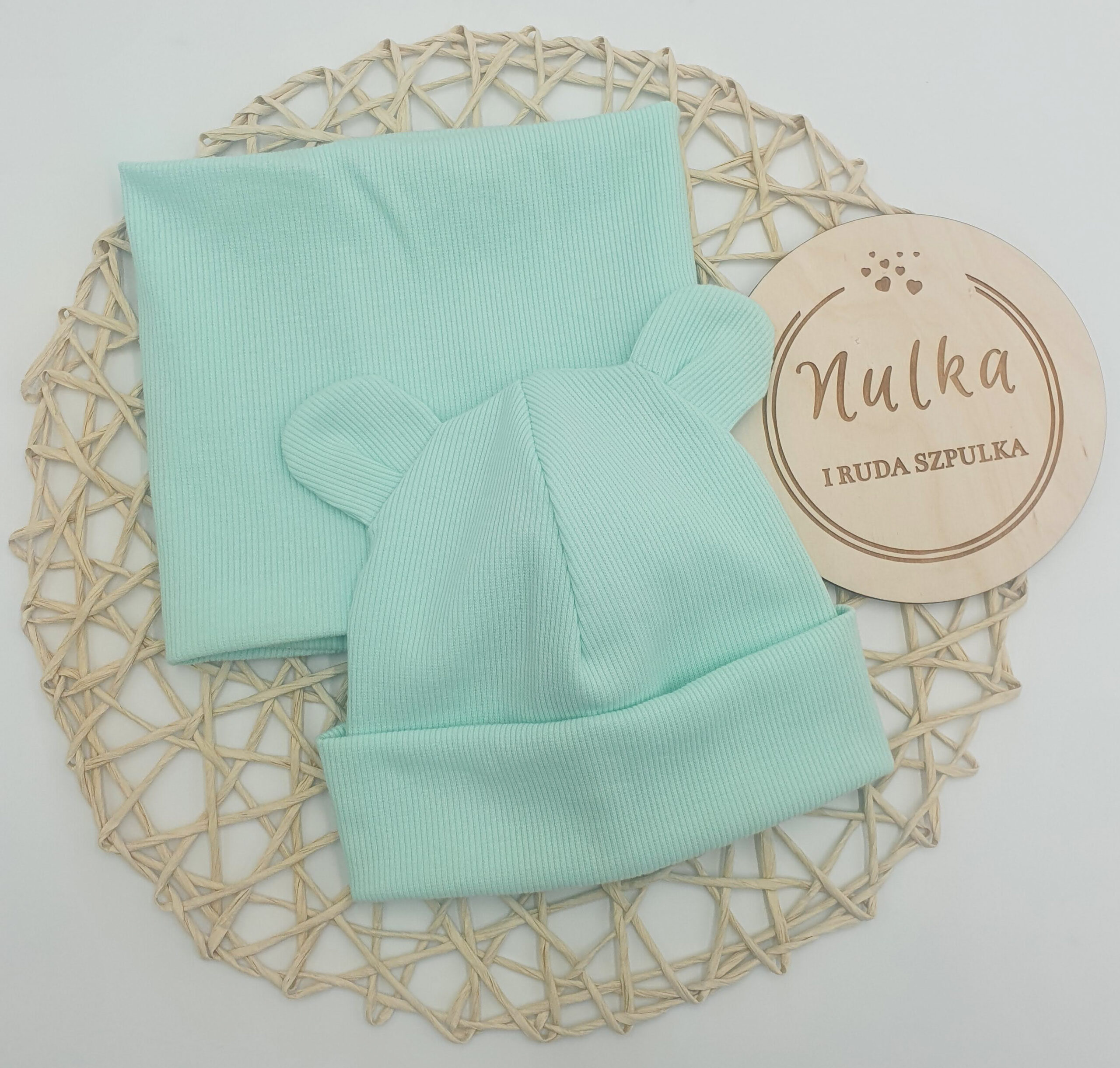 Prosta lub wywijana czapka z dzianiny prążkowanej ozdobiona misiowymi uszami w kolorze miętowym. Możliwe wiązanie i dodatkowe kokardki.