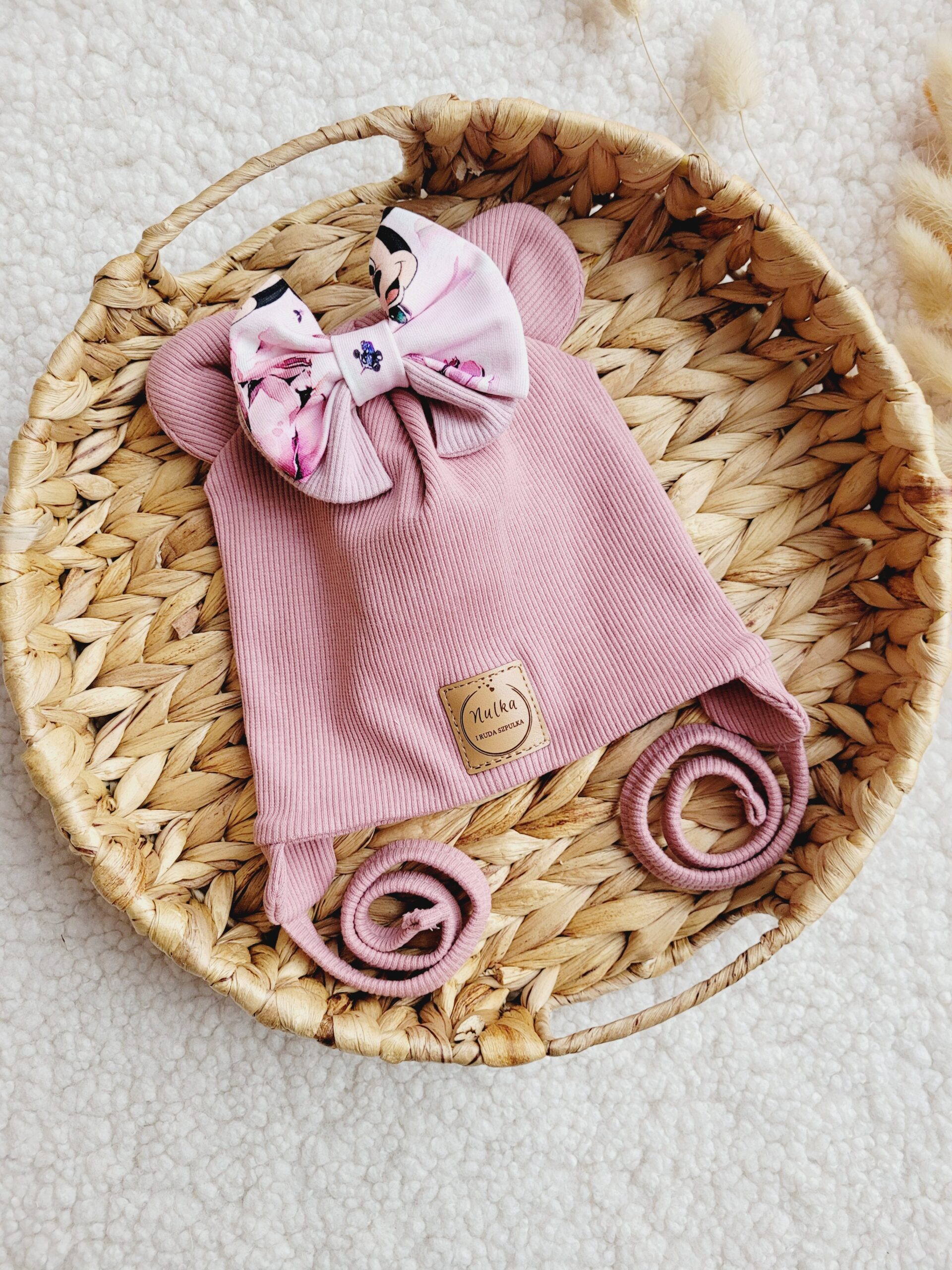 Czapka i chusta dla dziewczynki z motywem myszki Minnie – uroczy zestaw z uszkami i kokardką