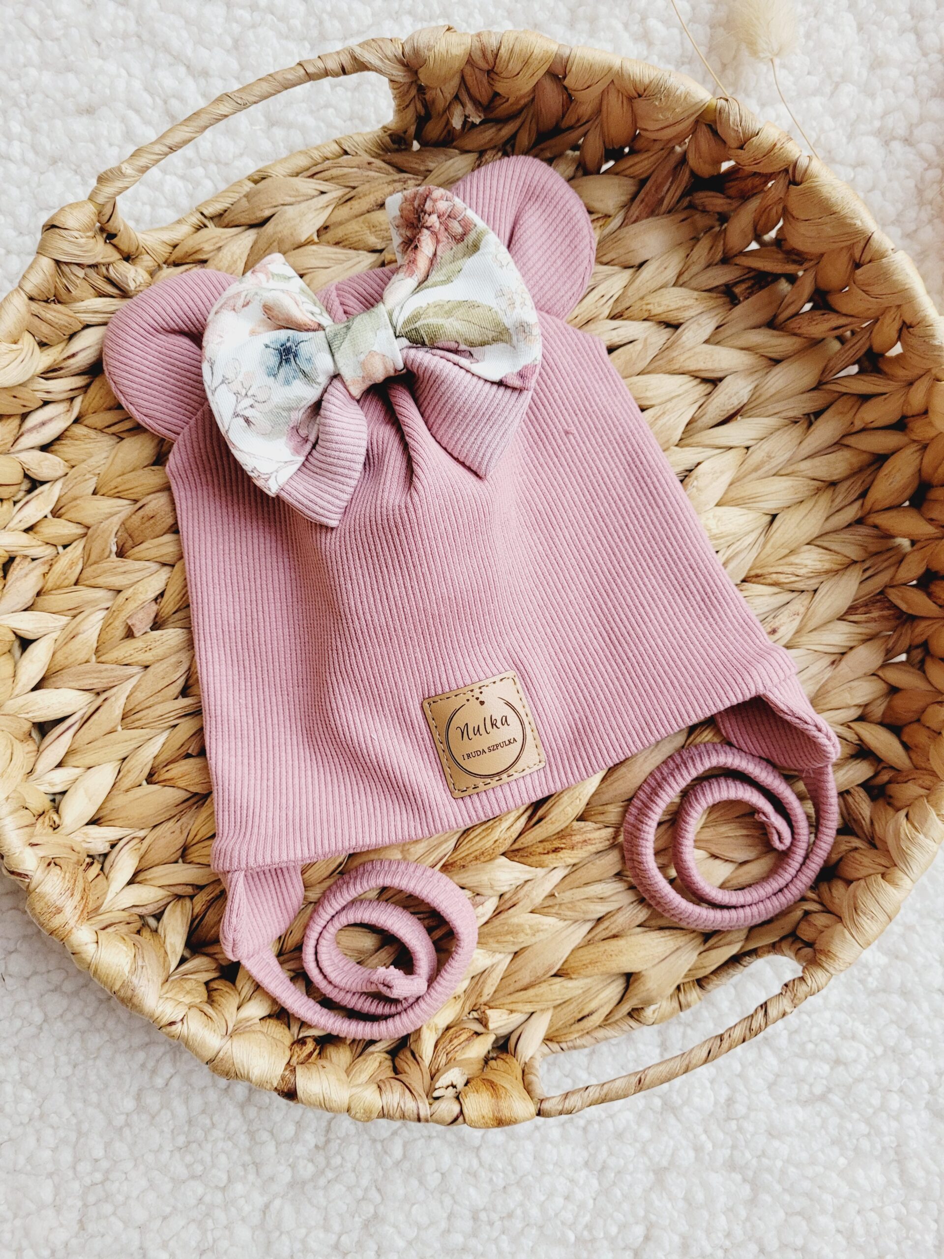 Czapka została uszyta z miękkiej i elastycznej dzianiny prążkowanej, która zapewnia komfort i ciepło. Ozdobiona uroczymi misiowymi uszkami i kokardką wzór Purple Garden, co dodaje jej niezwykłego, dziewczęcego uroku. W wersji zimowej czapkę i chustę podszyjemy polarem w wybranym kolorze.
