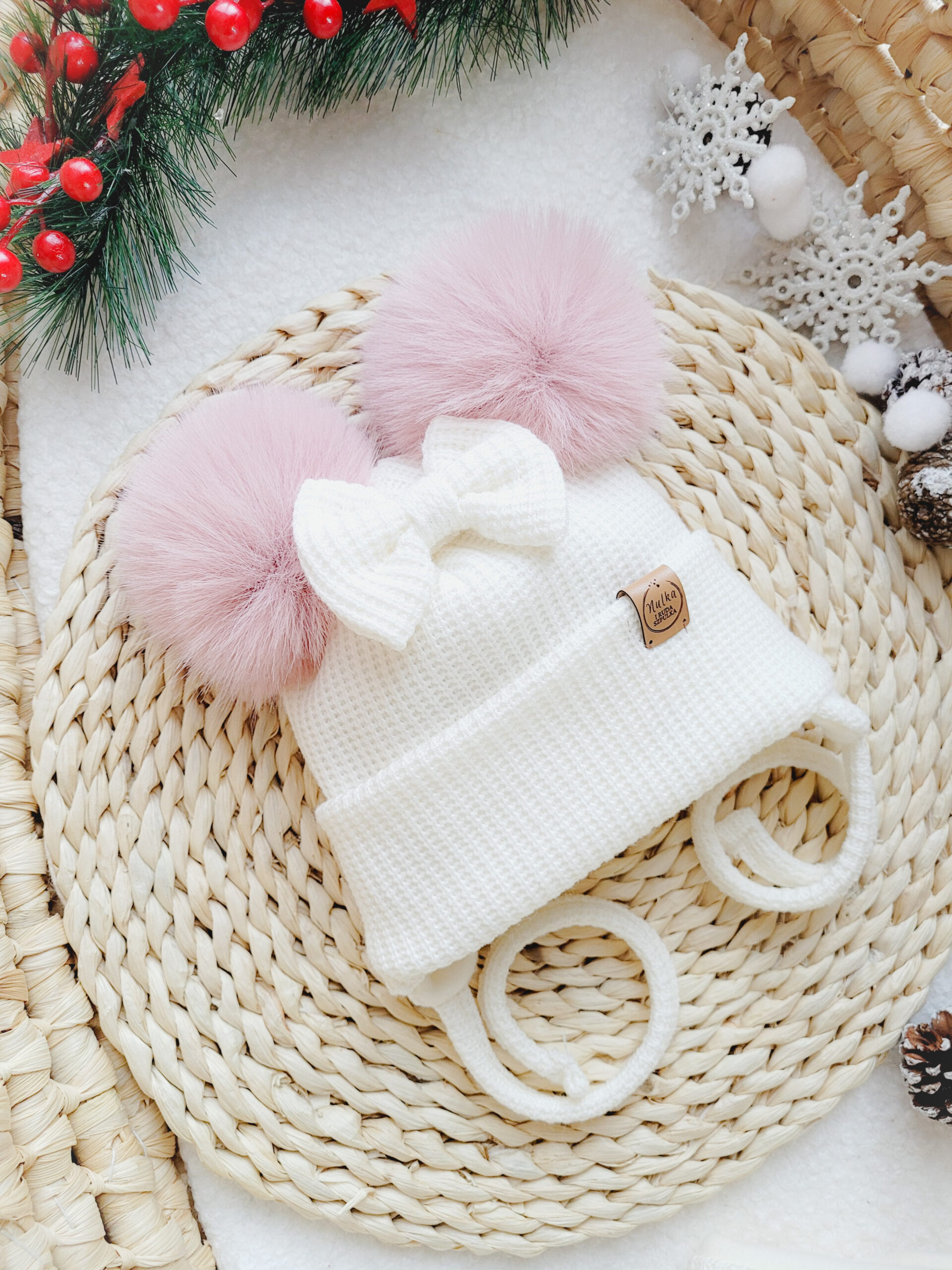 Czapka zimowa wiązana z pomponami i kokardkami perełki – kolory do wyboru