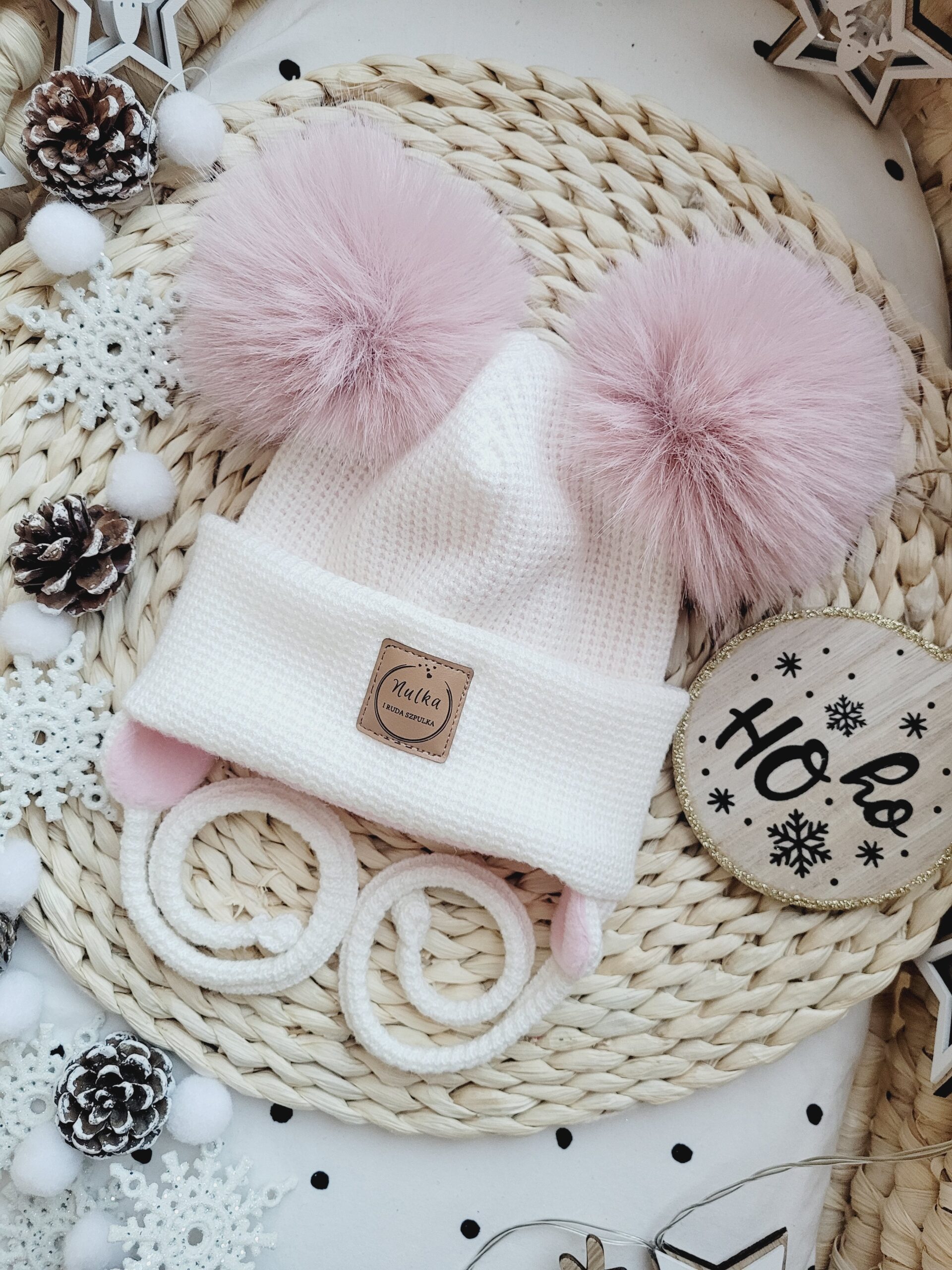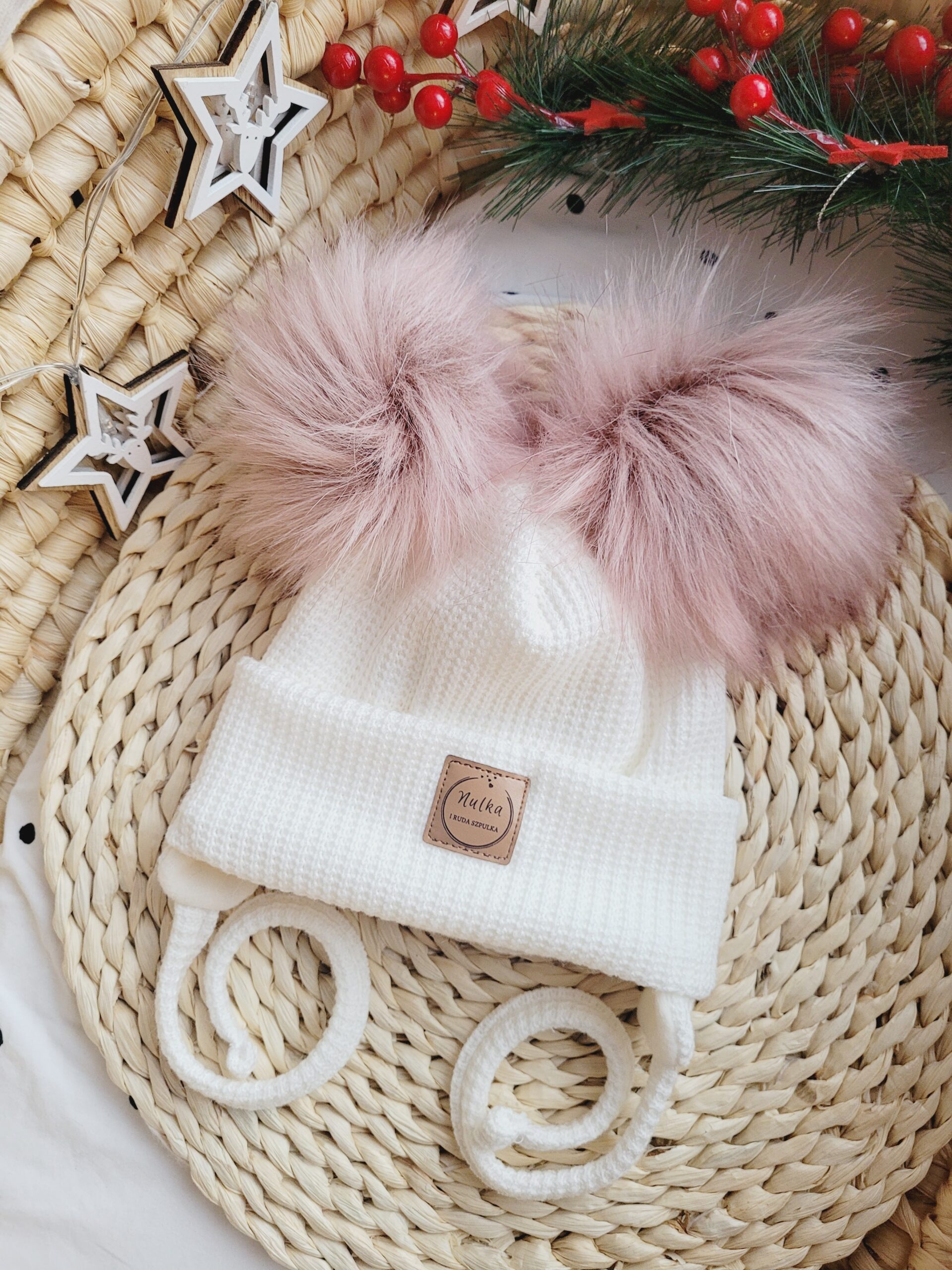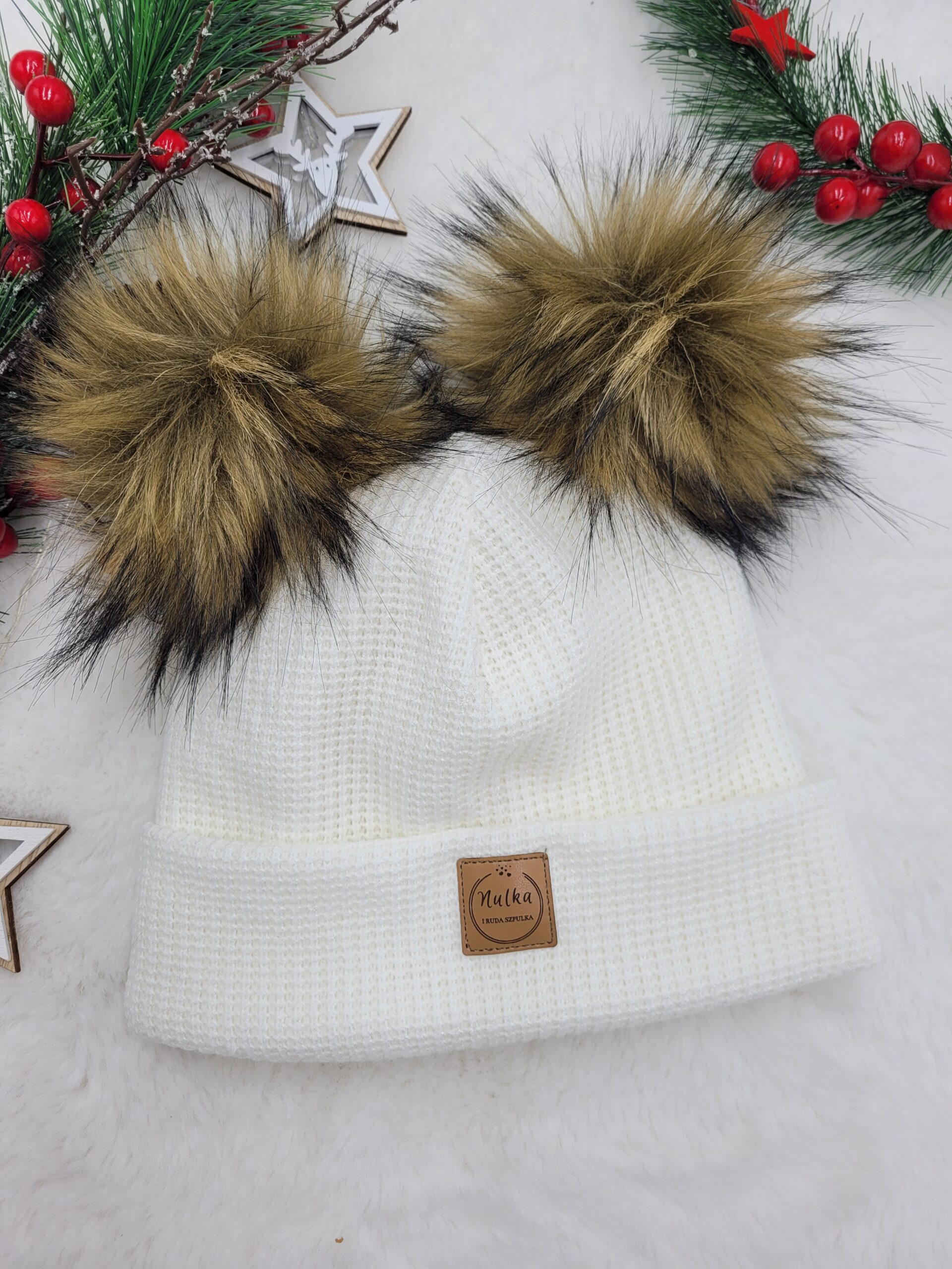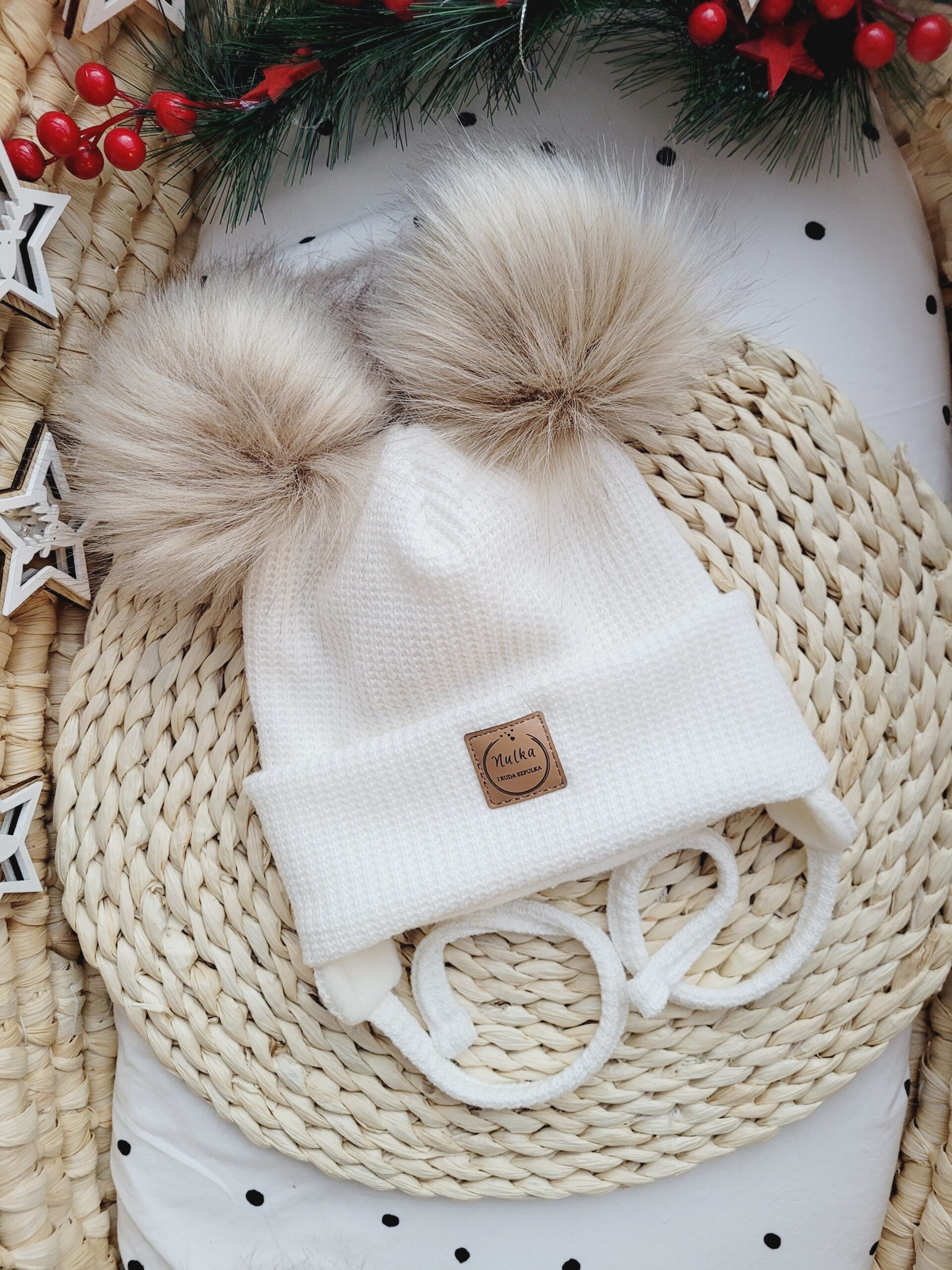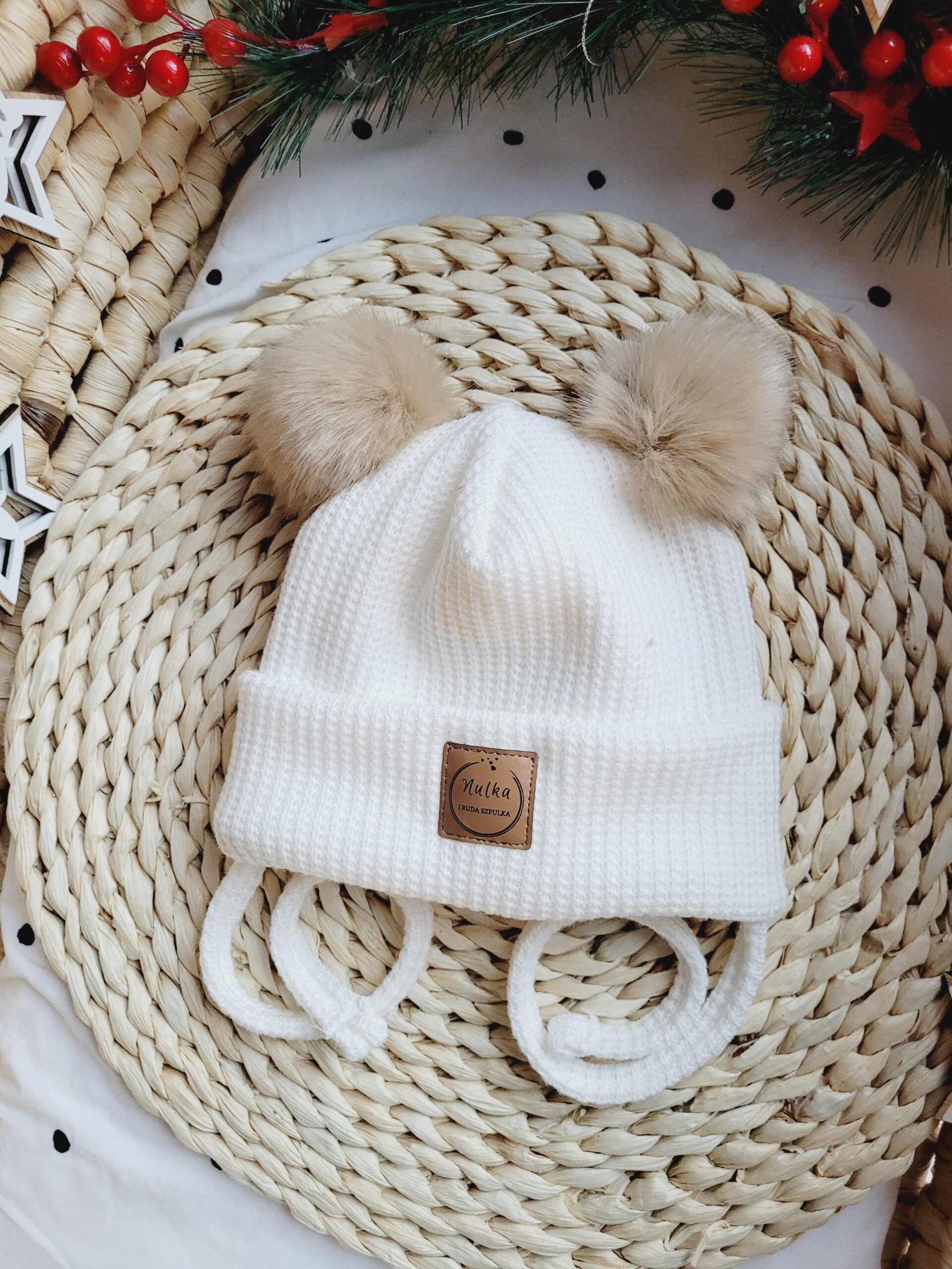 Czapka zimowa wiązana z pomponami dla chłopca lub dziewczynki w ponadczasowym kolorze ecru, rozmiary od 36 do 56.