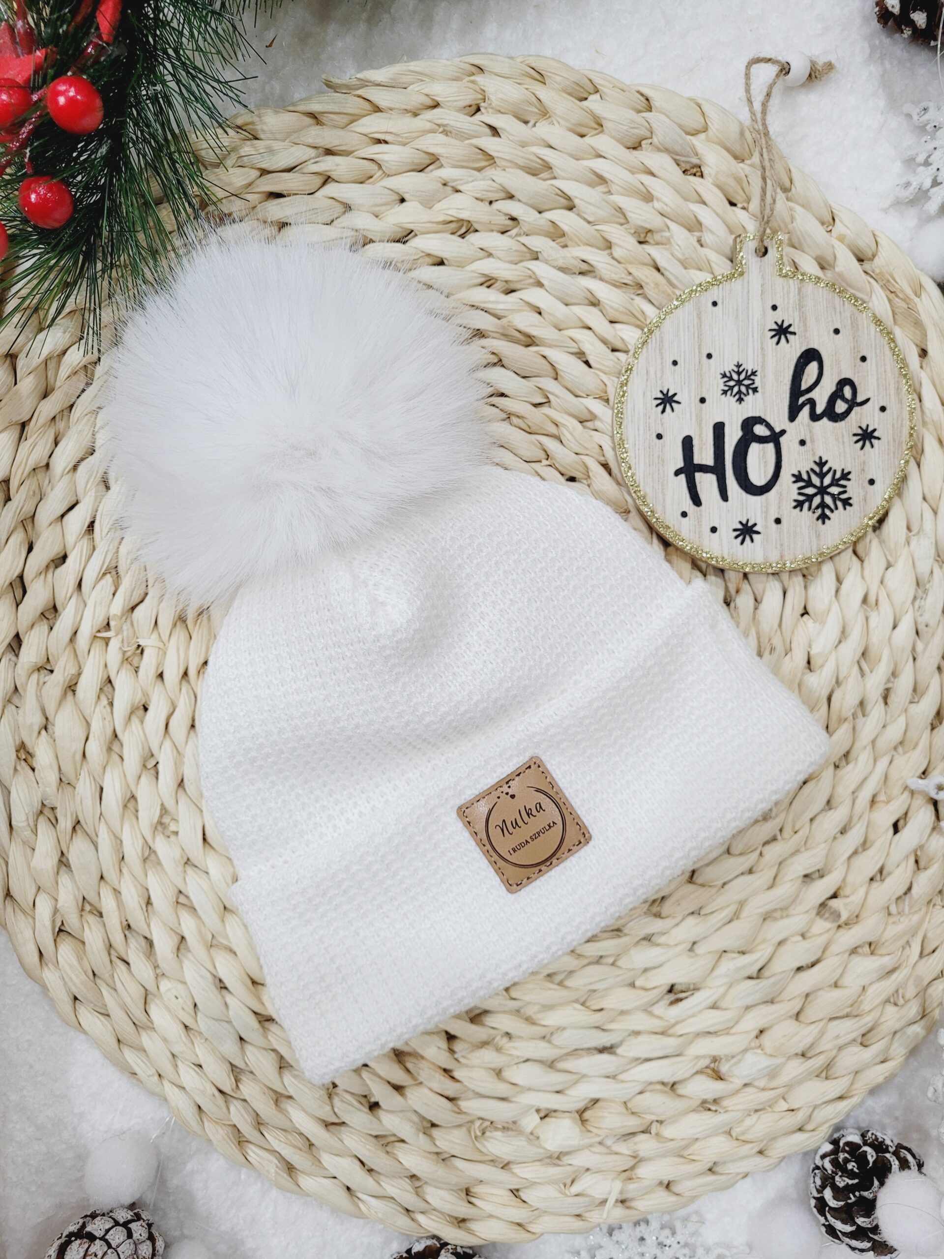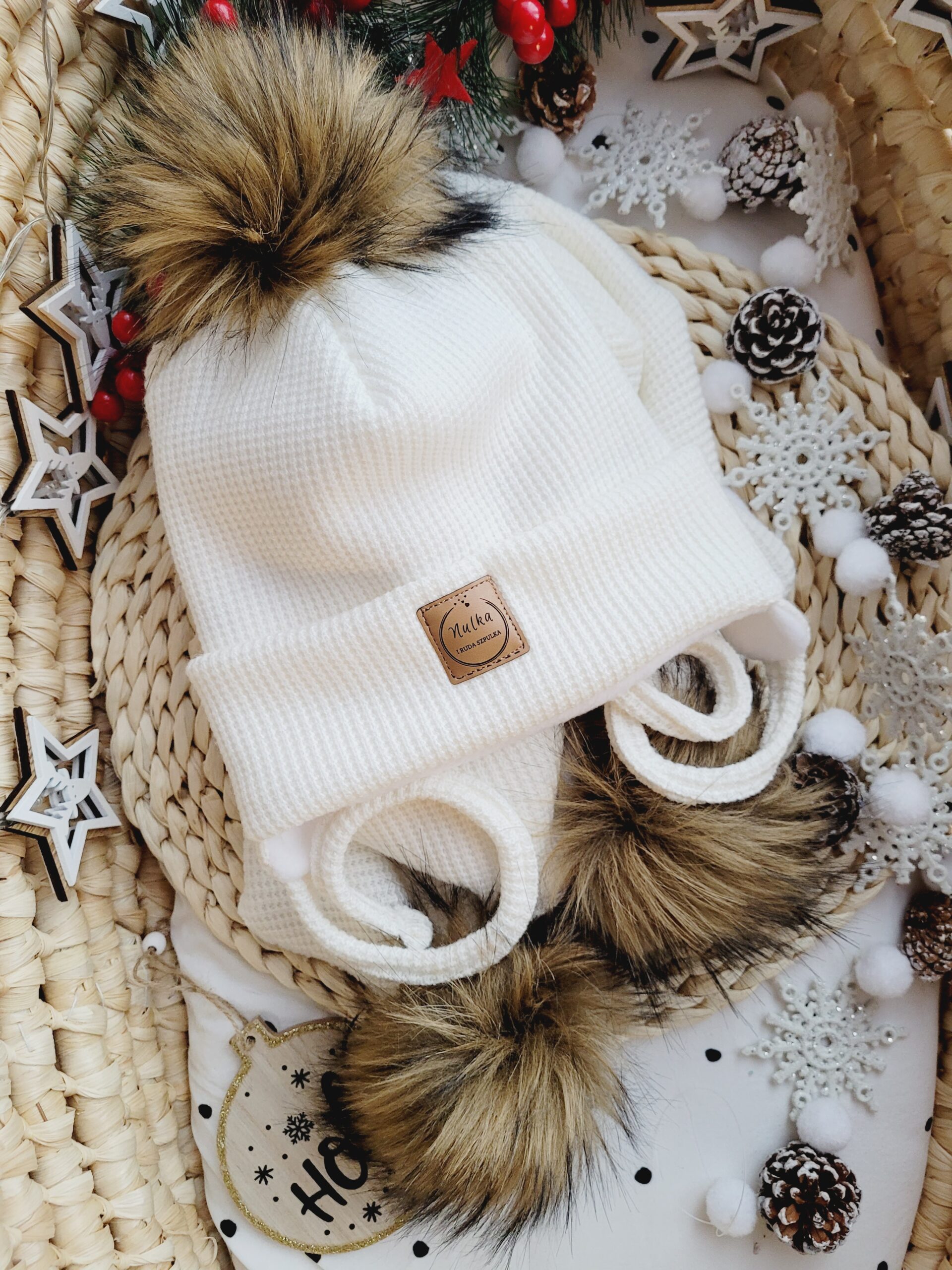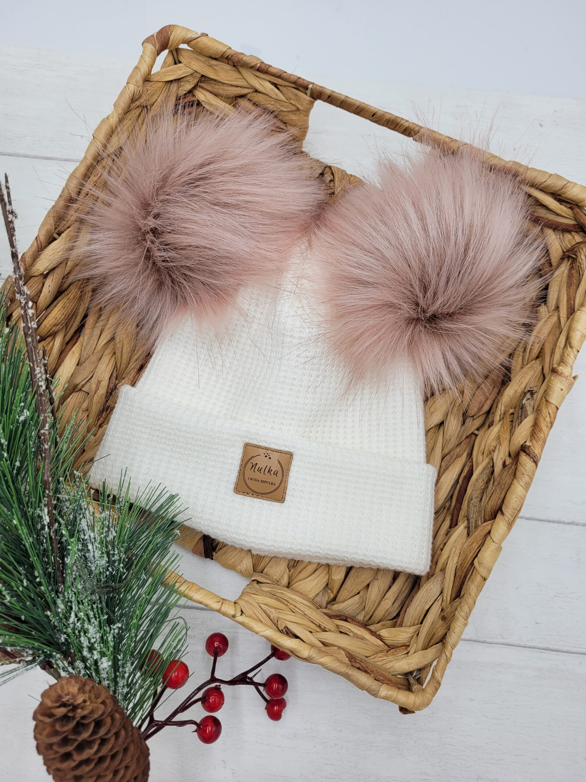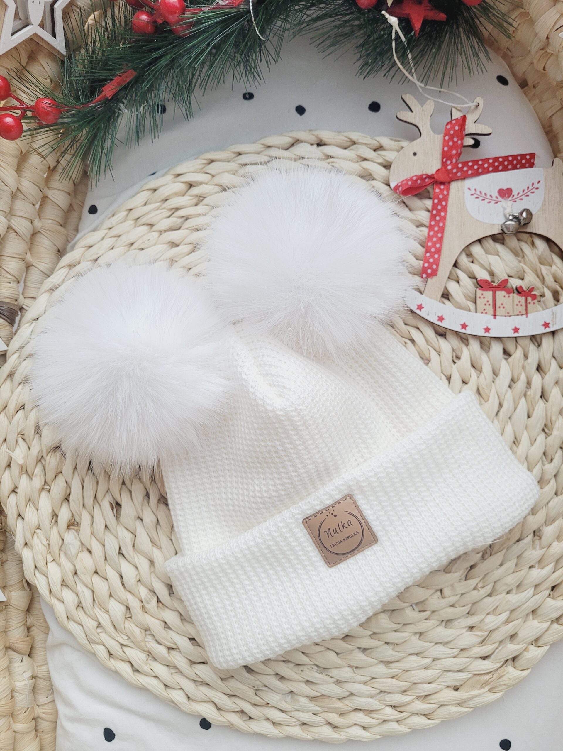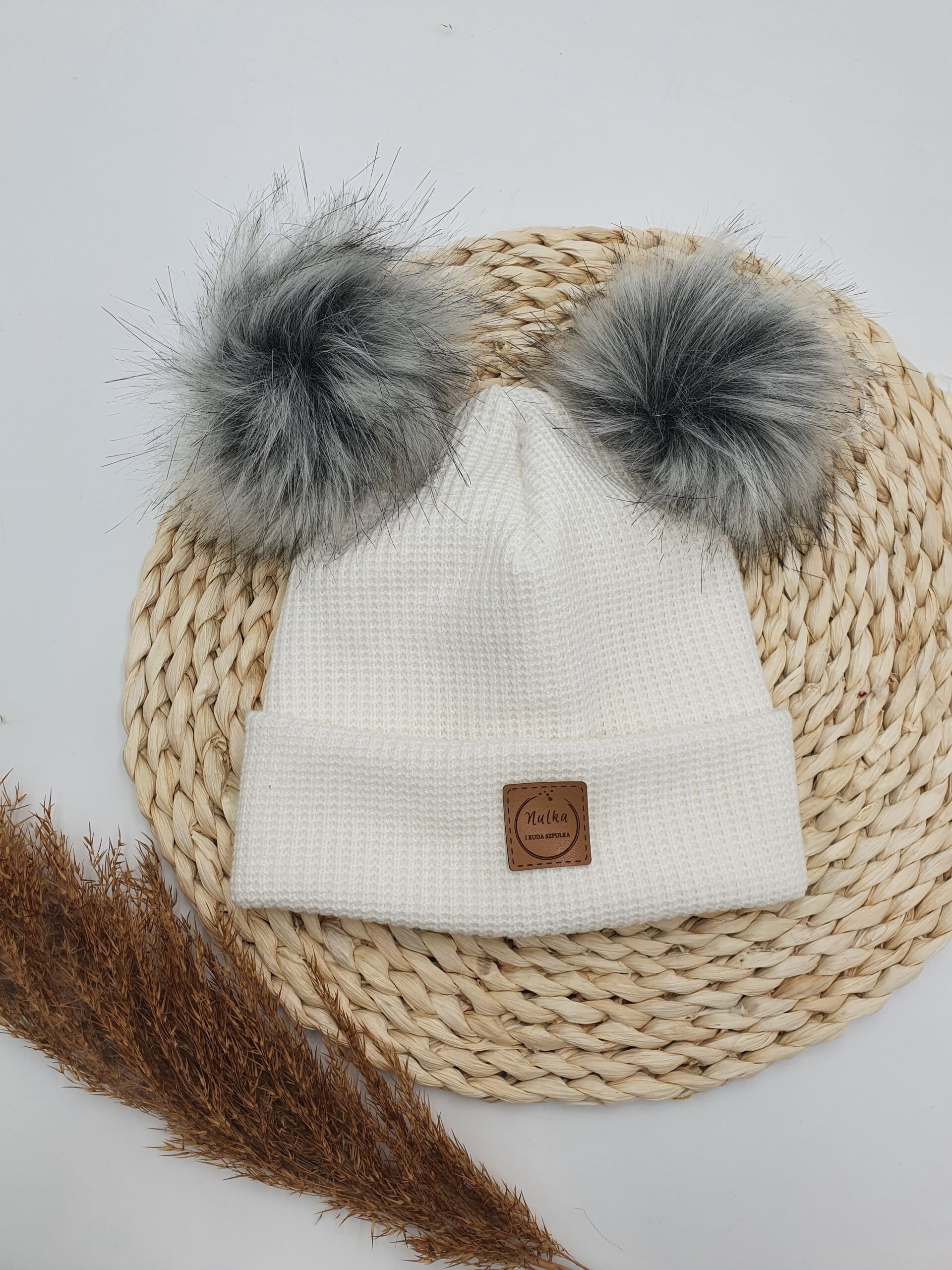 Czapka zimowa wiązana z pomponami dla chłopca lub dziewczynki w ponadczasowym kolorze ecru, rozmiary od 36 do 56.