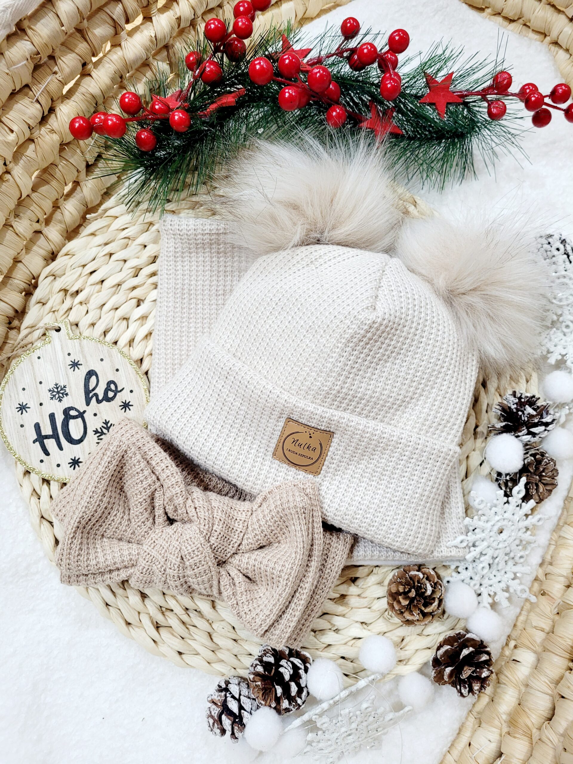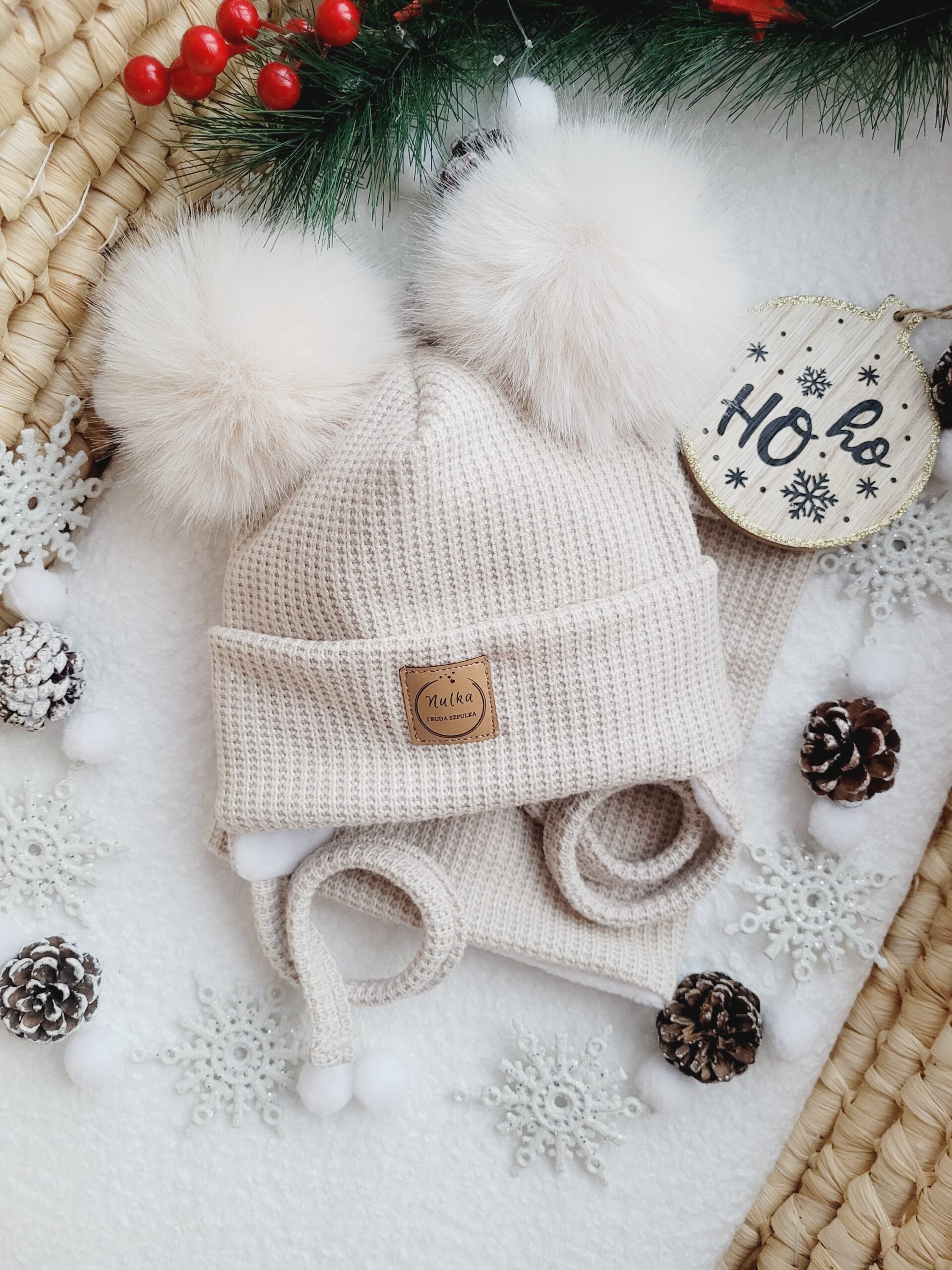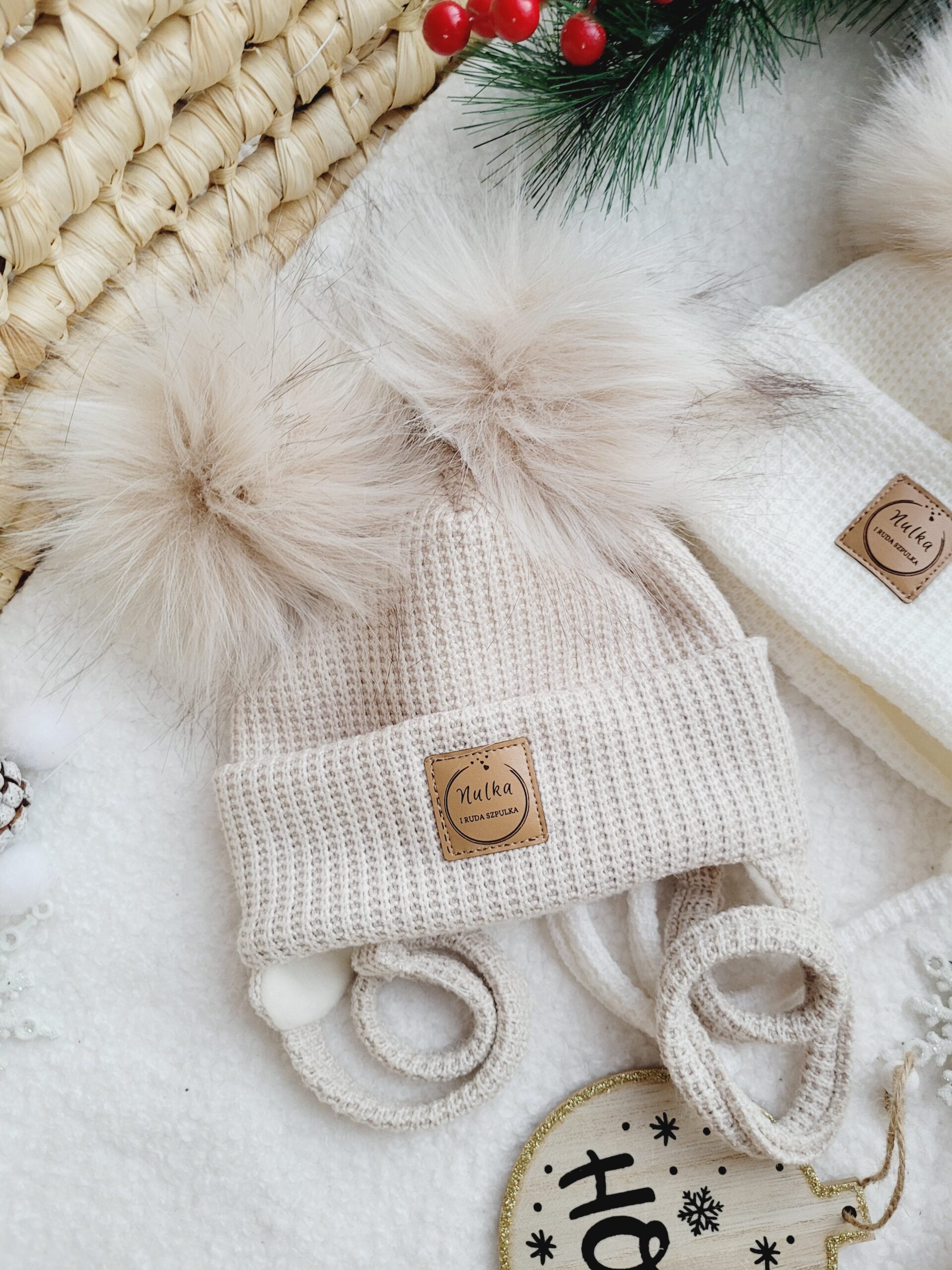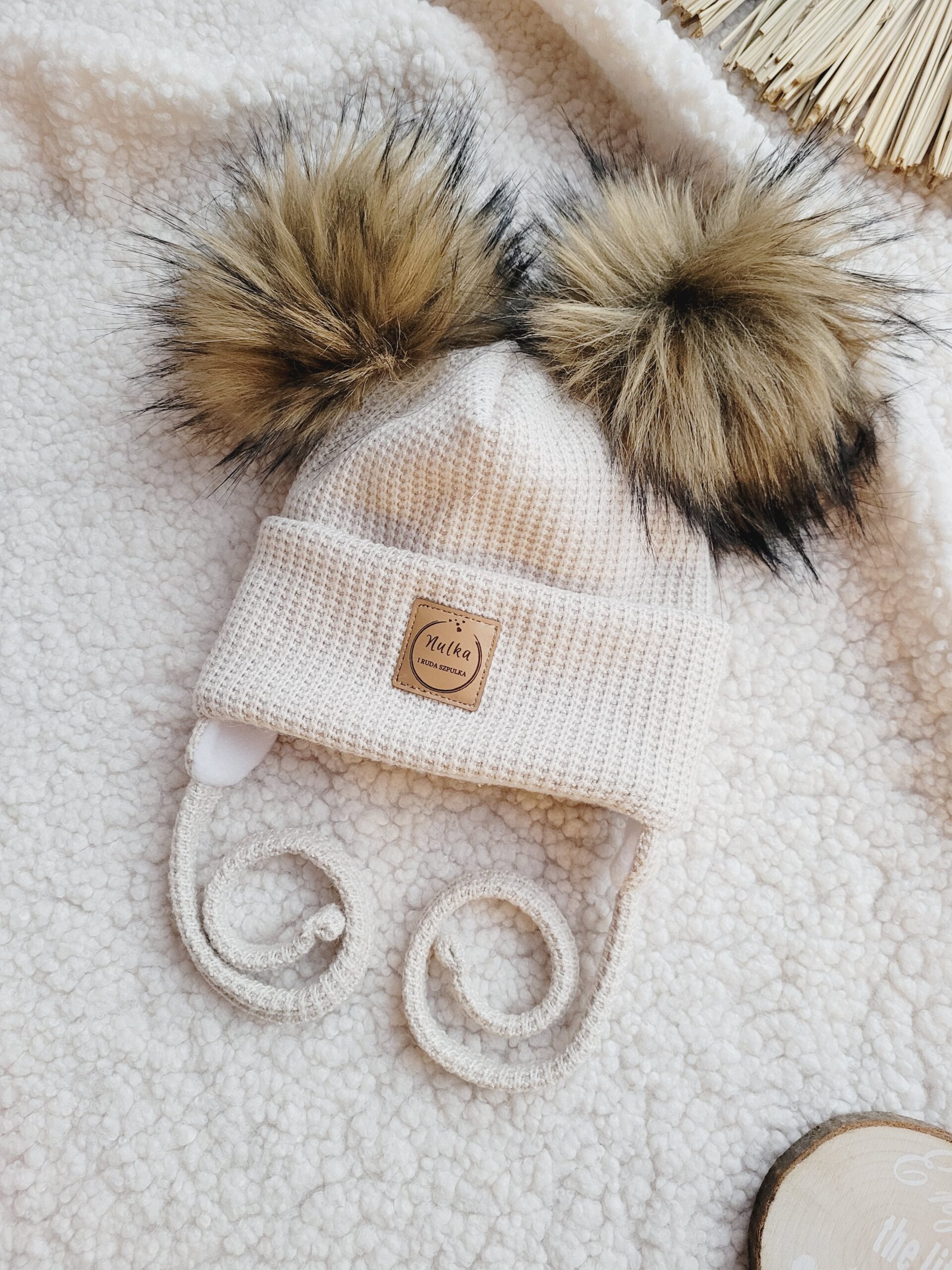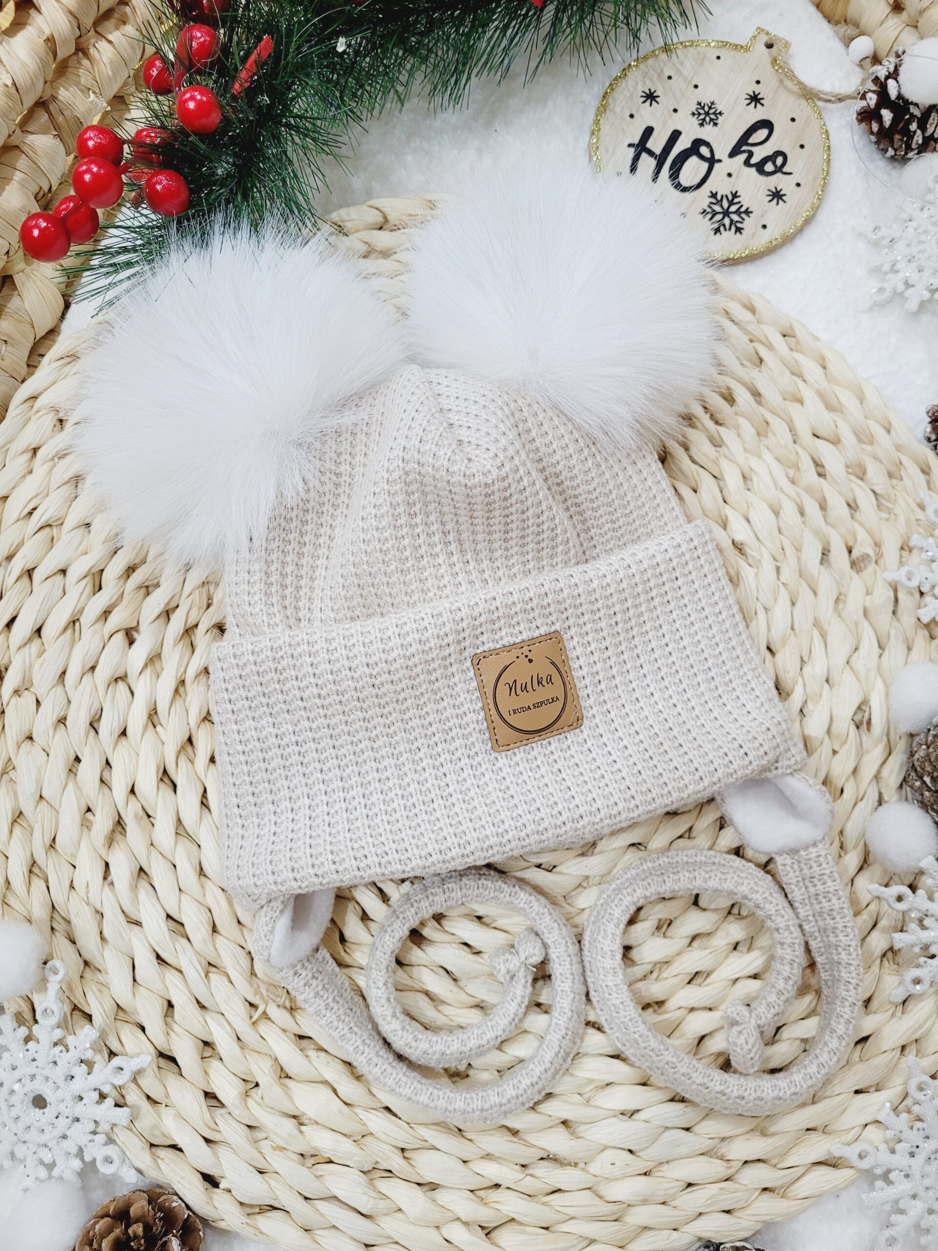 Czapka zimowa z dzianiny sweterkowej w kolorze jasny beż ozdobiona jednym lub dwoma pomponami. Rozmiary 36-56.