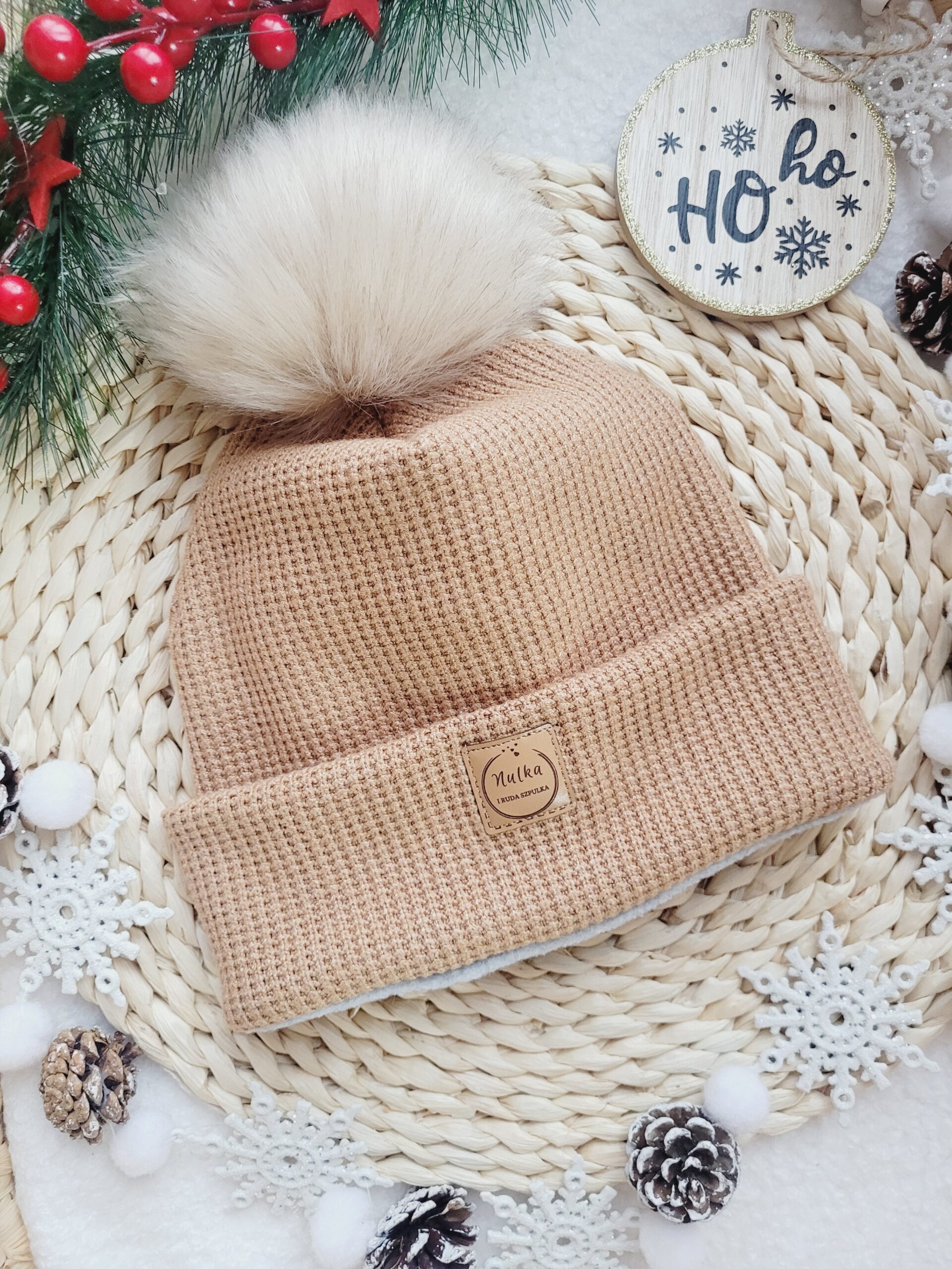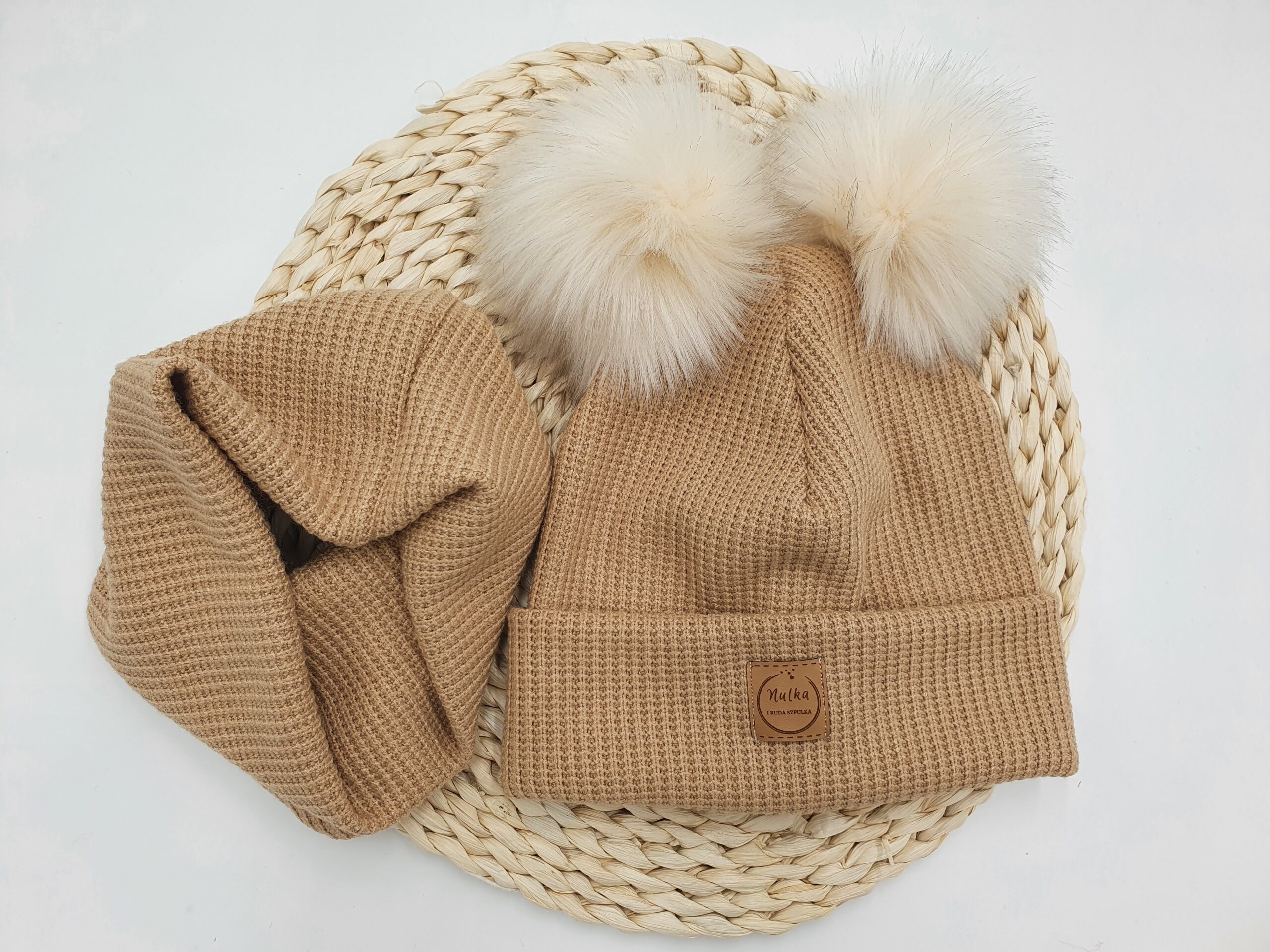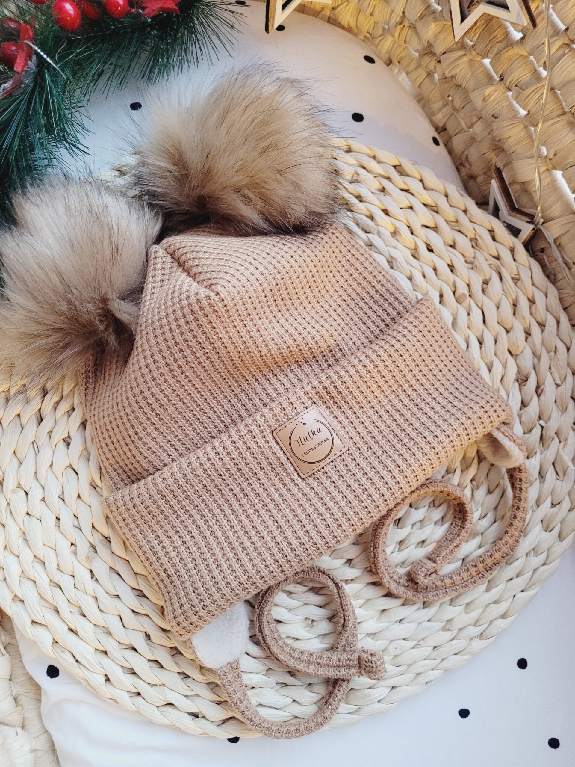 Czapka w kolorze karmel ozdobiona pomponami w dowolnym kolorze.