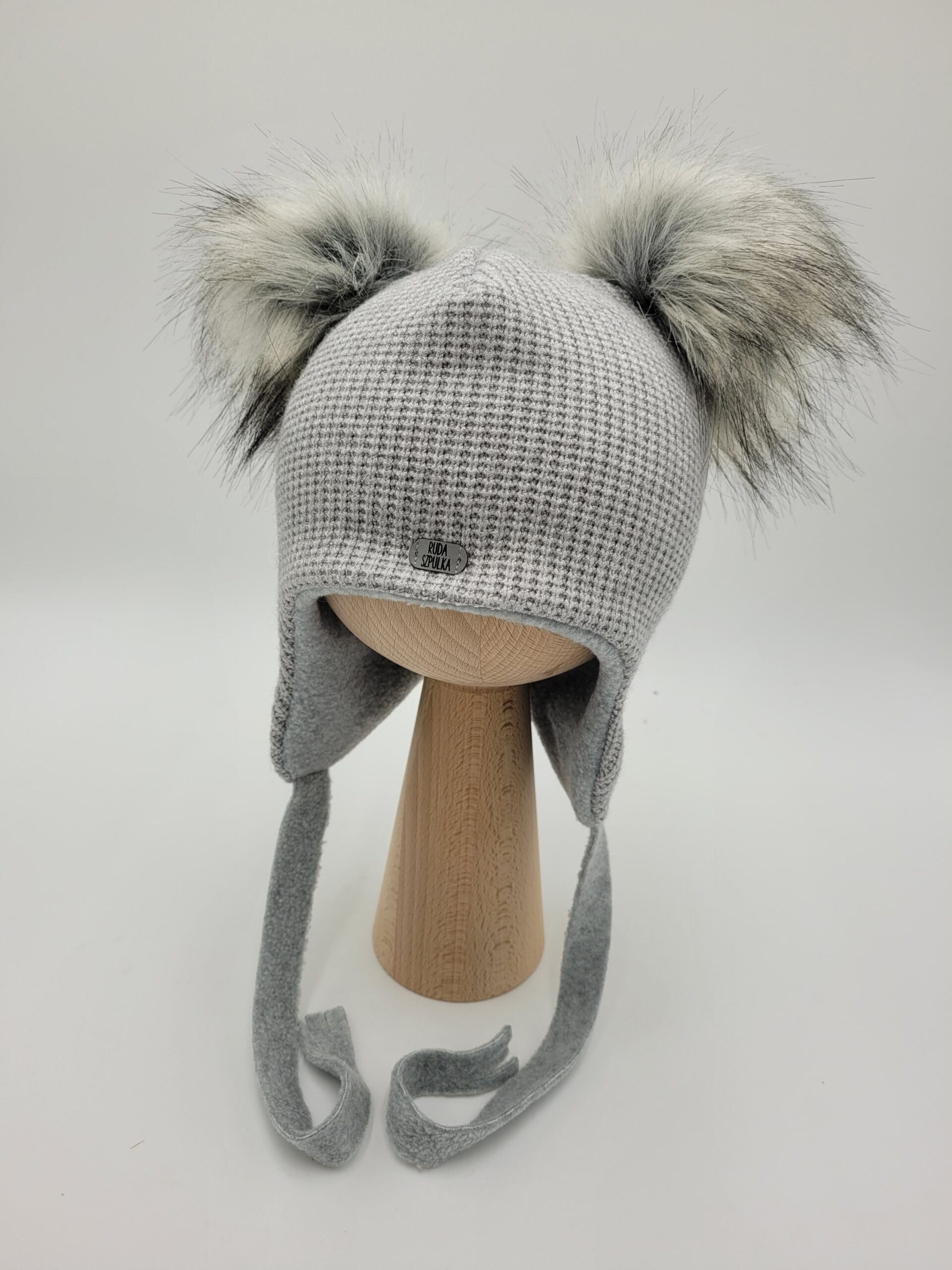 Zimowa czapka wiązana z pomponami w kolorze szary melanż jasny. Podszyta ciepłym polarem termicznym.