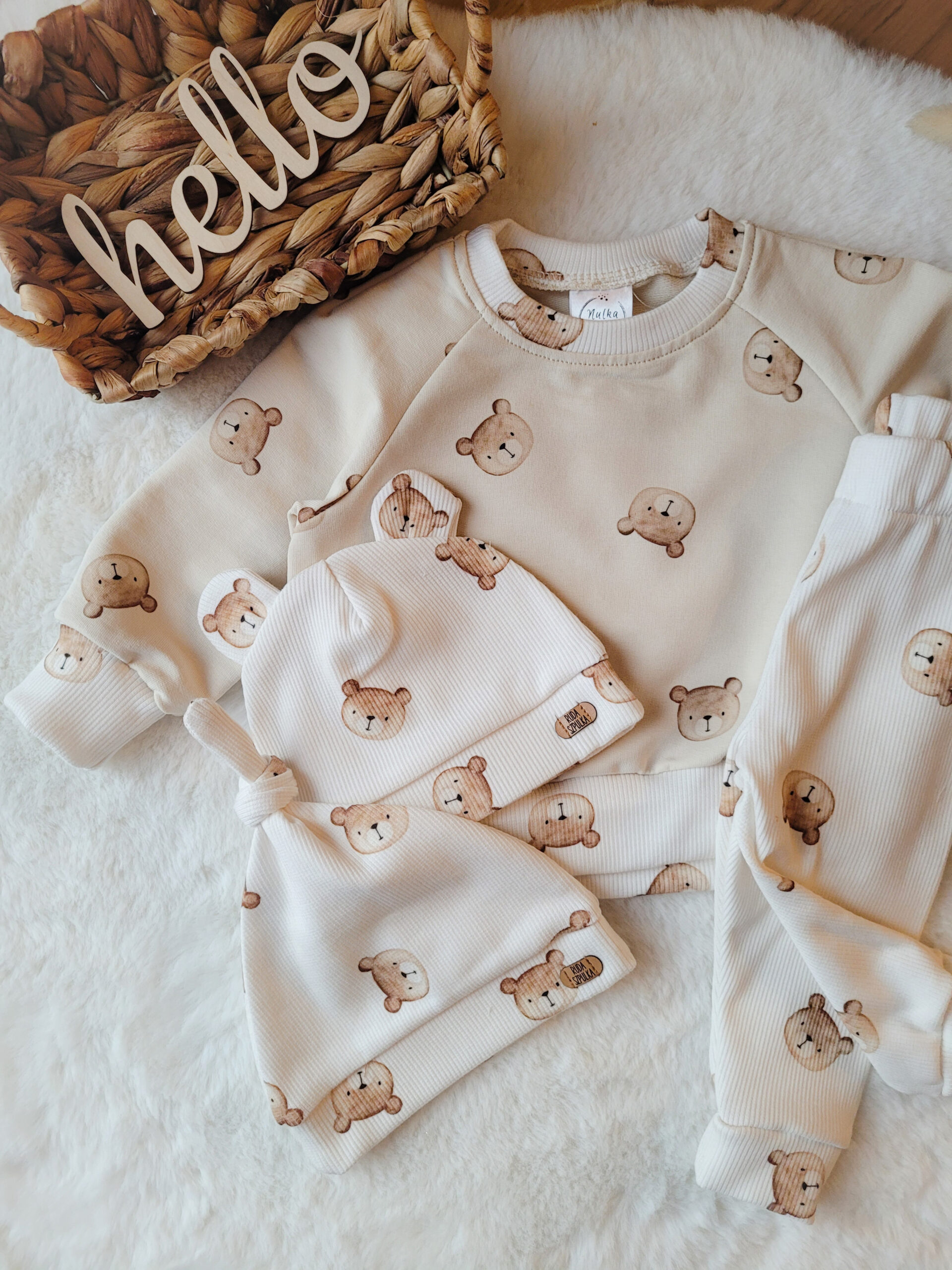 Komplet bluza i legginsy dla dzieci i niemowląt z misiowymi główkami na jasno beżowym tle.