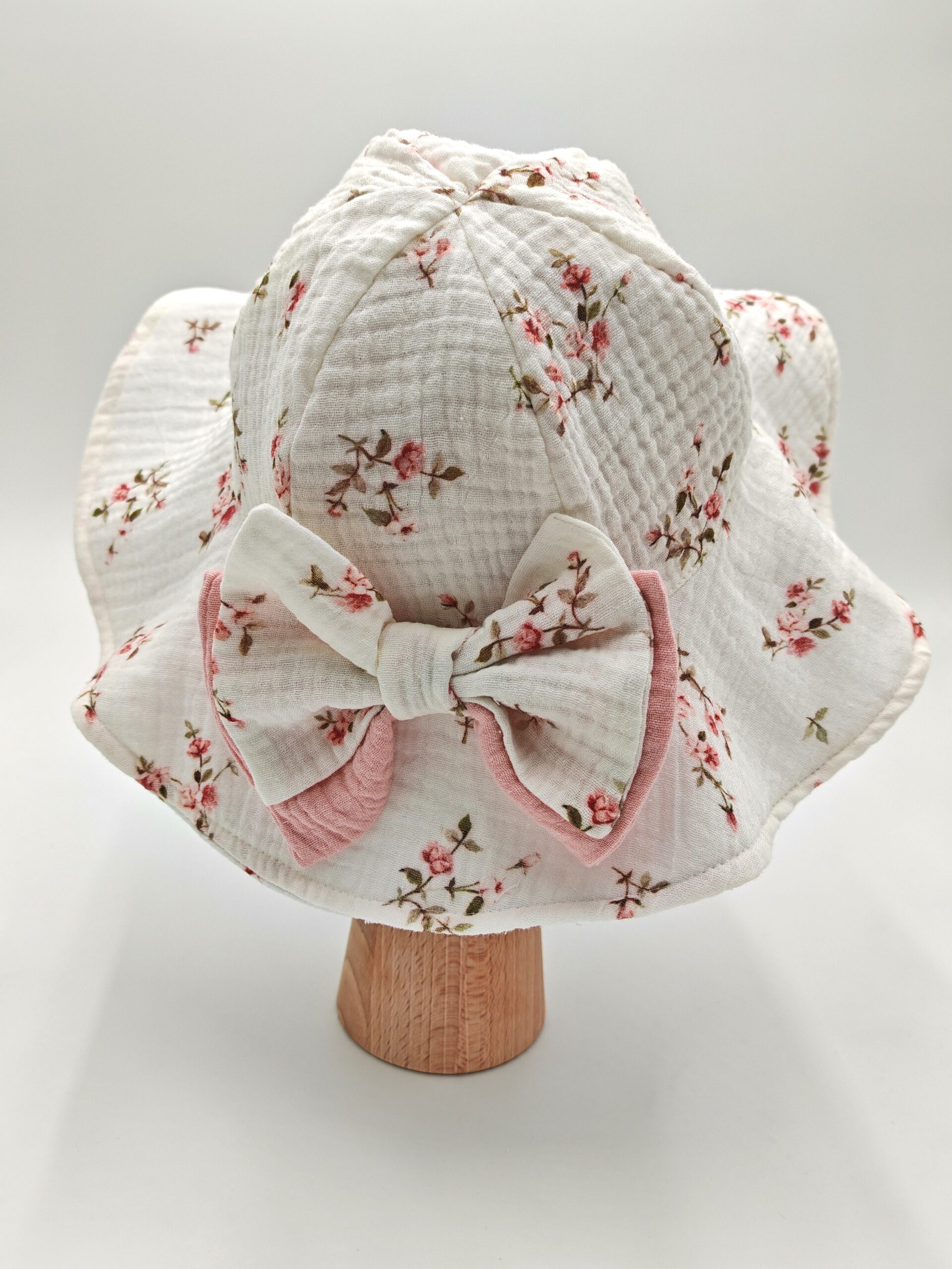 Uroczy kapelusz dla dziewczynki z podwójną kokardą, uszyty z przewiewnego muślinu bawełnianego w drobne różyczki. Idealny na lato. Dostępny w rozmiarach 36–54 cm.