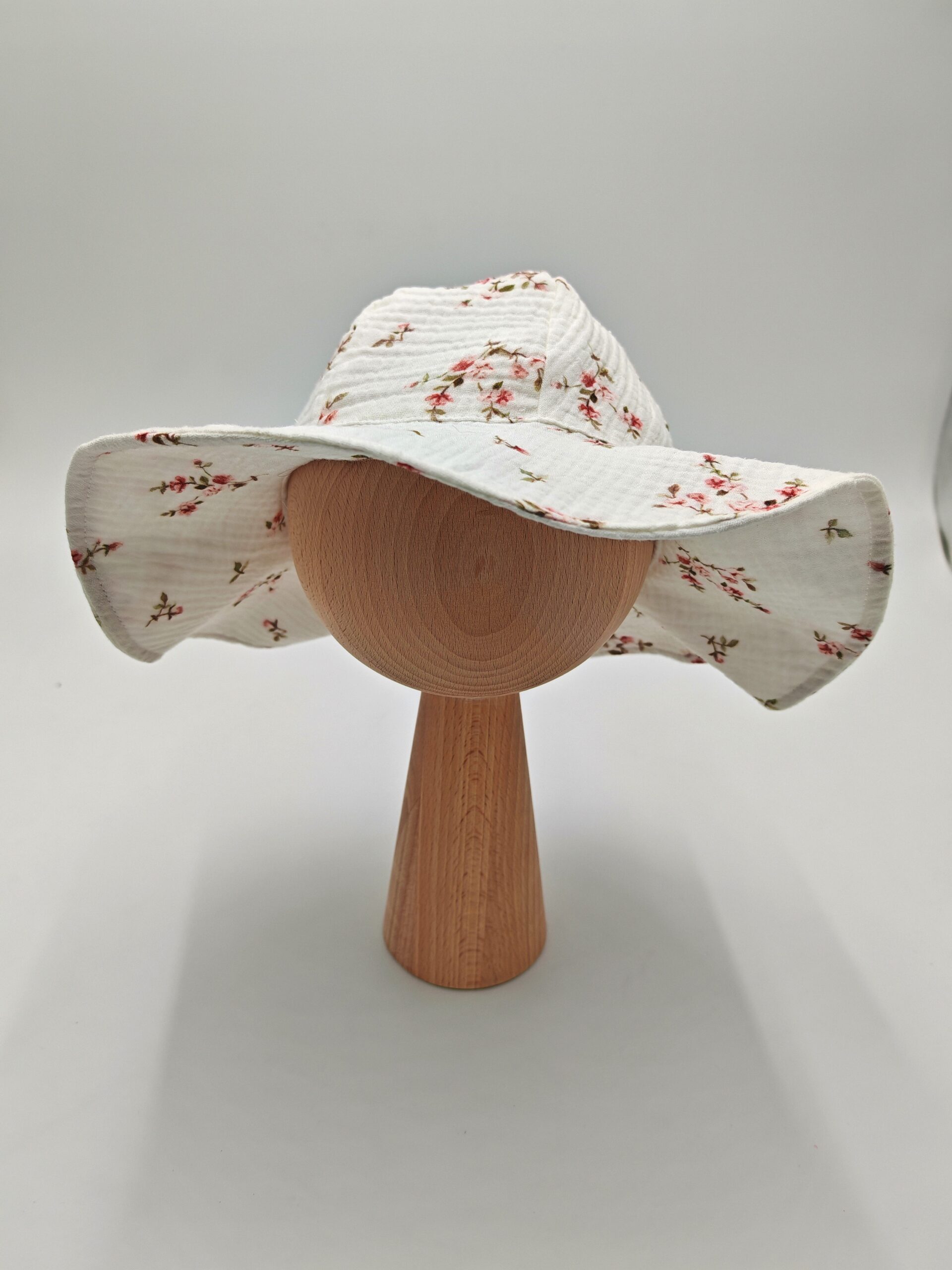 Letni kapelusz dla dziewczynki uszyty z wysokiej jakości muślinu bawełnianego double gauze premium w kolorze ecru, ozdobiony wzorem drobnych różyczek. Materiał jest lekki, przewiewny i idealnie sprawdza się w ciepłe dni. Tkanina posiada certyfikat Oeko-Tex Standard 100, dzięki czemu jest w pełni bezpieczna dla niemowląt i dzieci.