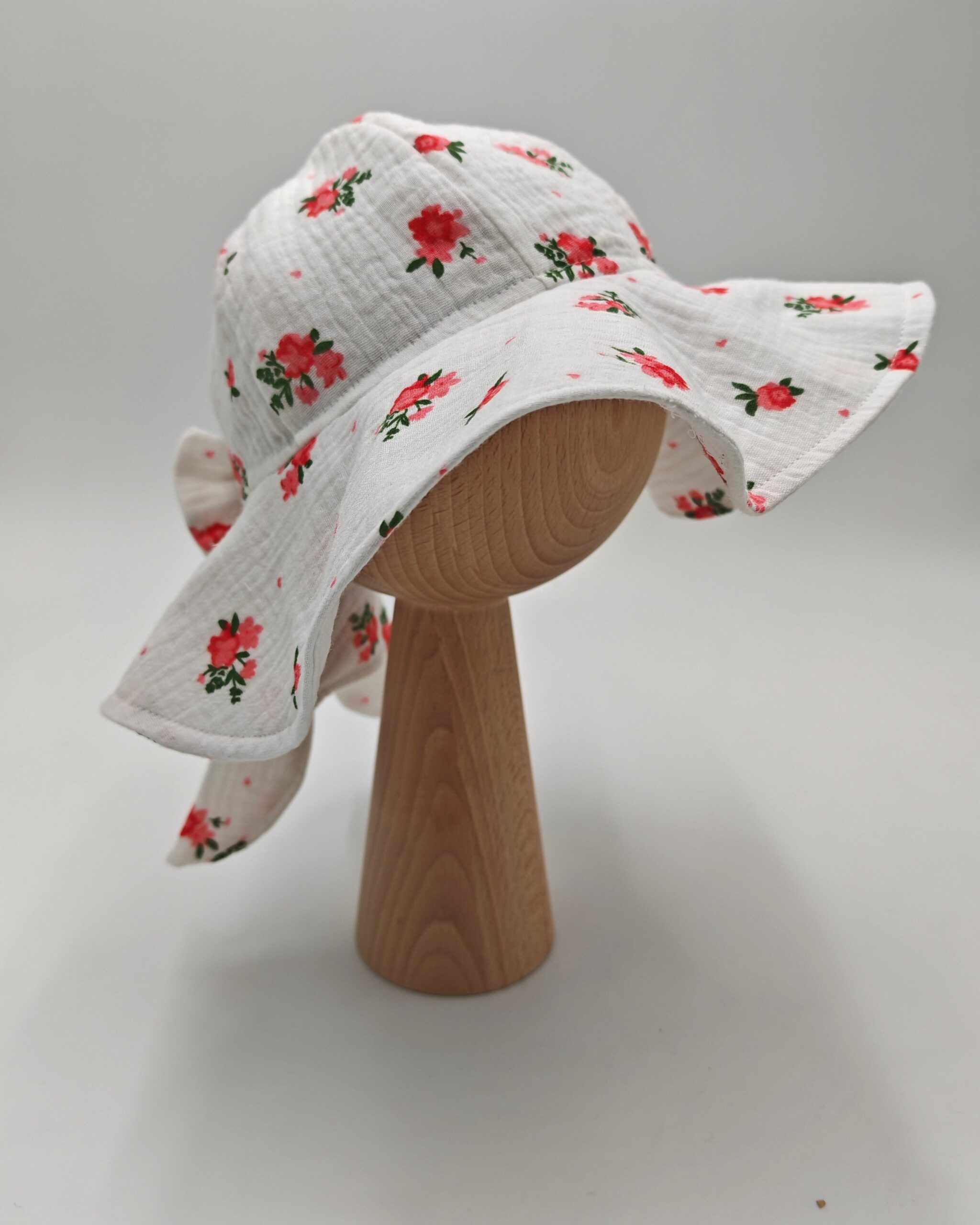 Uroczy kapelusz dla dziewczynki z kokardą, uszyty z przewiewnego muślinu bawełnianego w koralowe kwiaty. Idealny na lato. Dostępny w rozmiarach 36–54 cm.