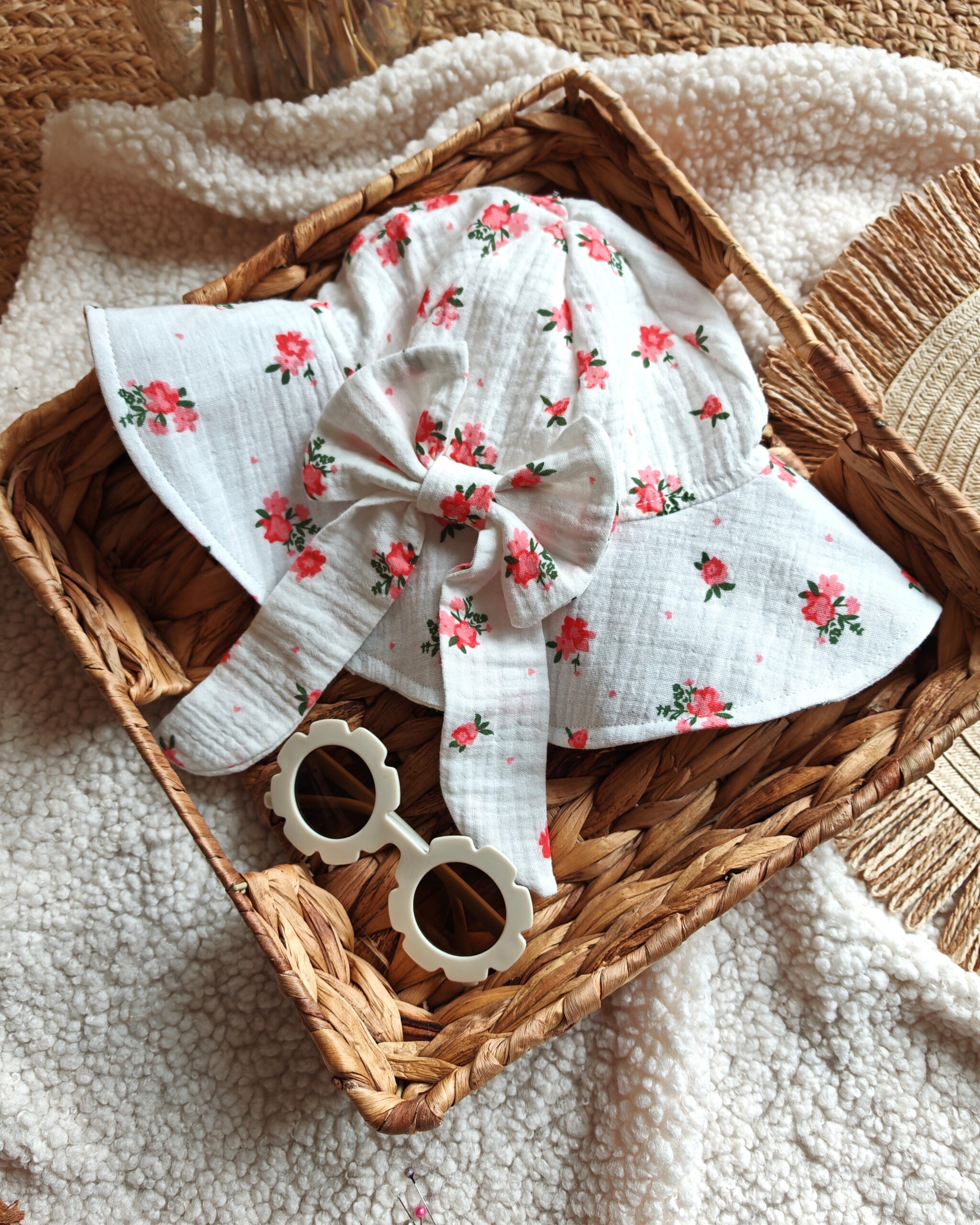 Letni kapelusz dla dziewczynki uszyty z wysokiej jakości muślinu bawełnianego double gauze w kolorze ecru, ozdobiony wzorem koralowych kwiatów. Materiał jest lekki, przewiewny i idealnie sprawdza się w ciepłe dni. Tkanina posiada certyfikat Oeko-Tex Standard 100, dzięki czemu jest w pełni bezpieczna dla niemowląt i dzieci.
