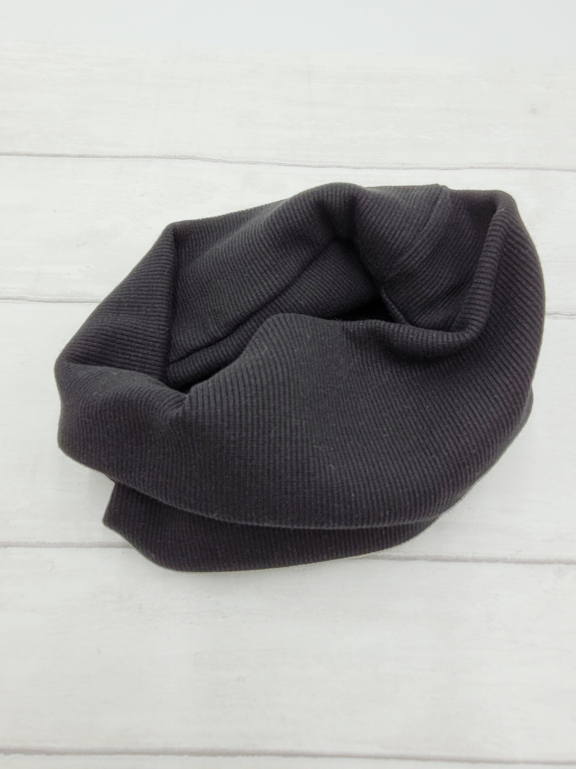 Uniwersalny, czarny komin z dzianiny prążkowanej.
