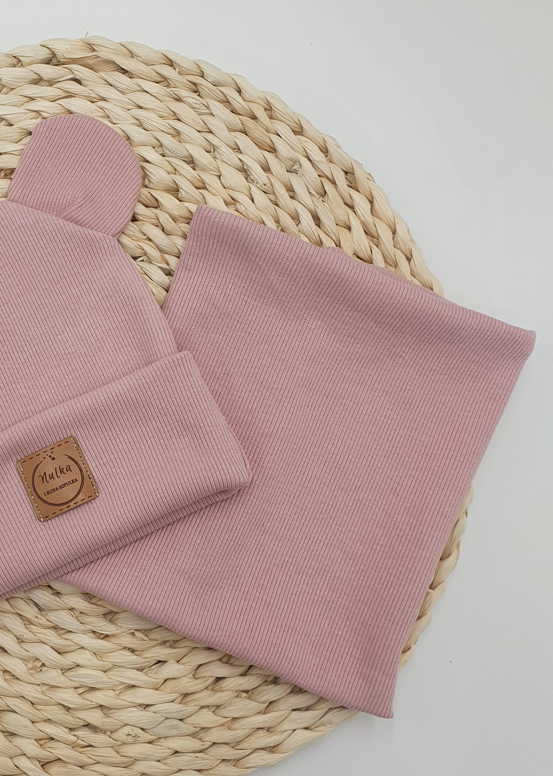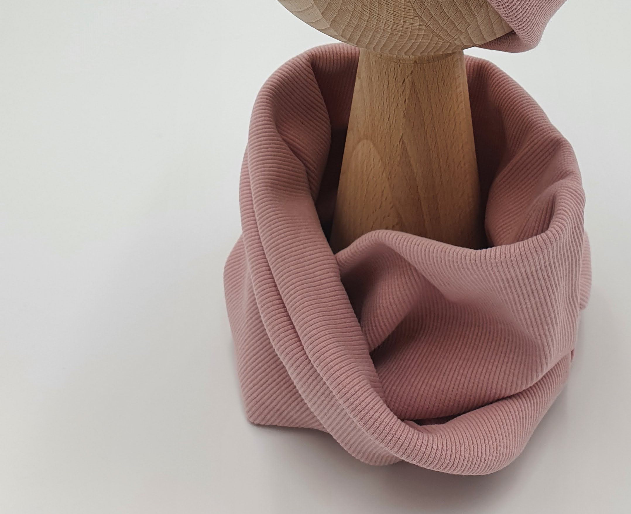 Komin w kolorze pastelowego różu z dzianiny prążkowanej.