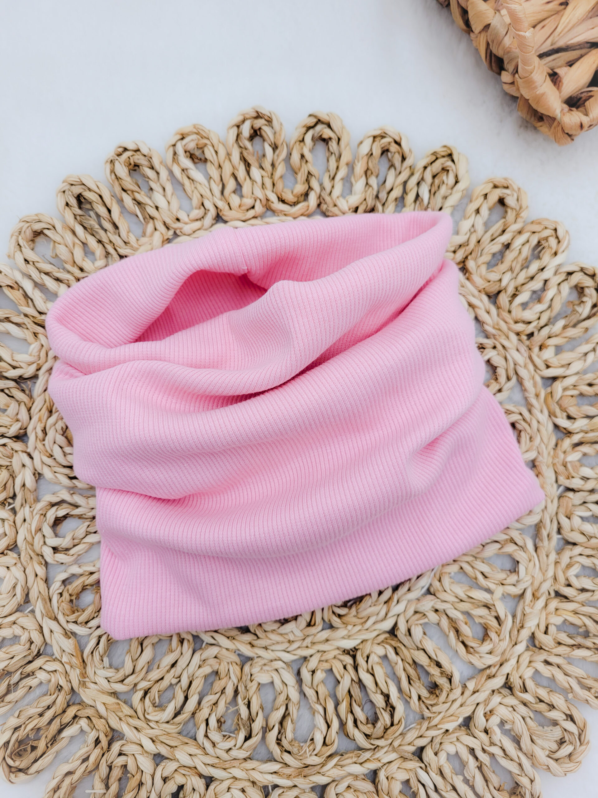 Komin z dzianiny prążkowanej w kolorze różowym.