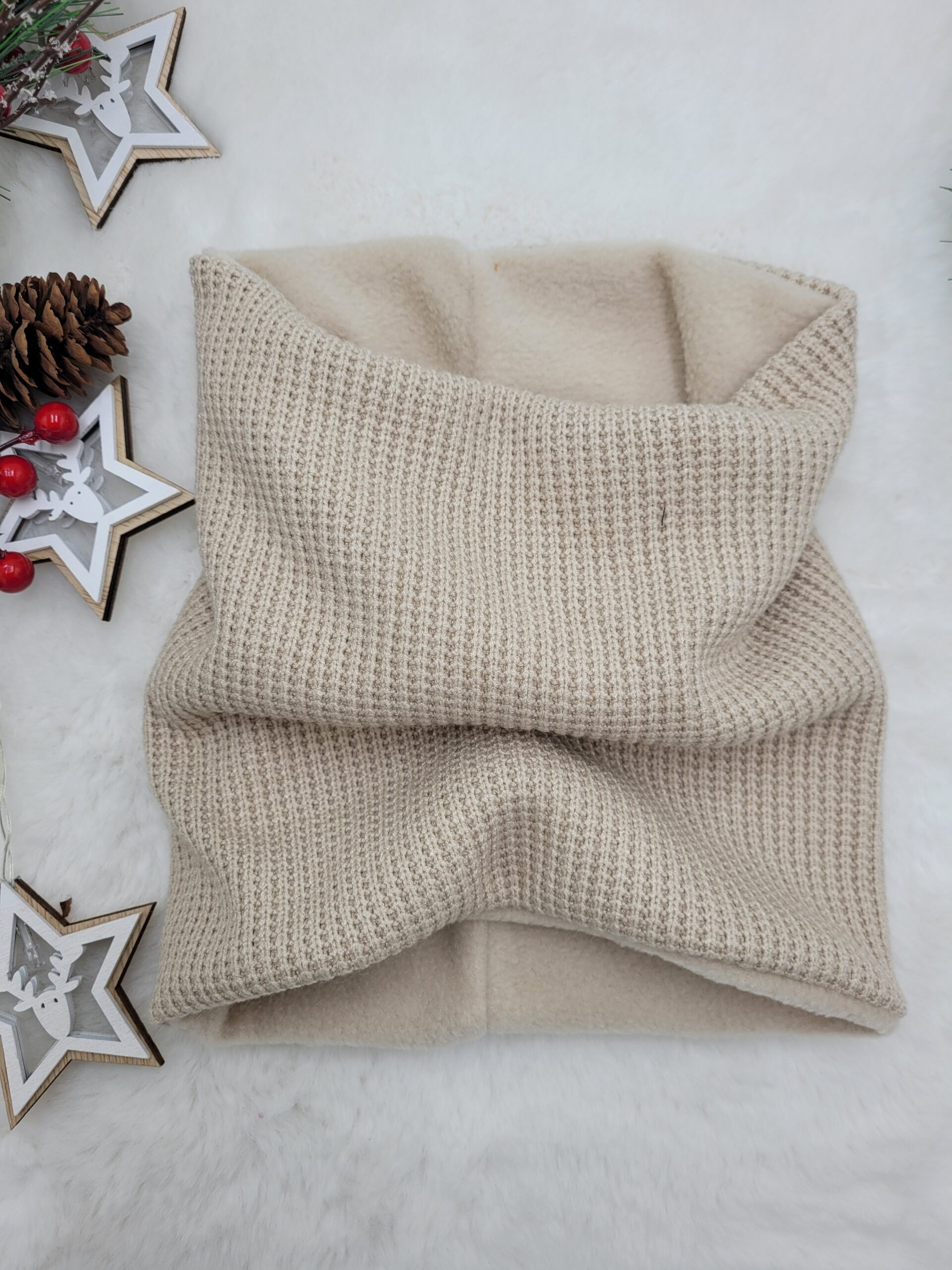 Komin z dzianiny sweterkowej w kolorze beżowym. W całości szyty z dzianiny sweterkowej lub podszyty ciepłym polarem.
