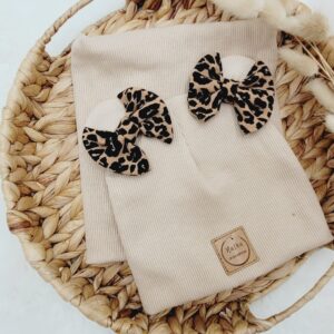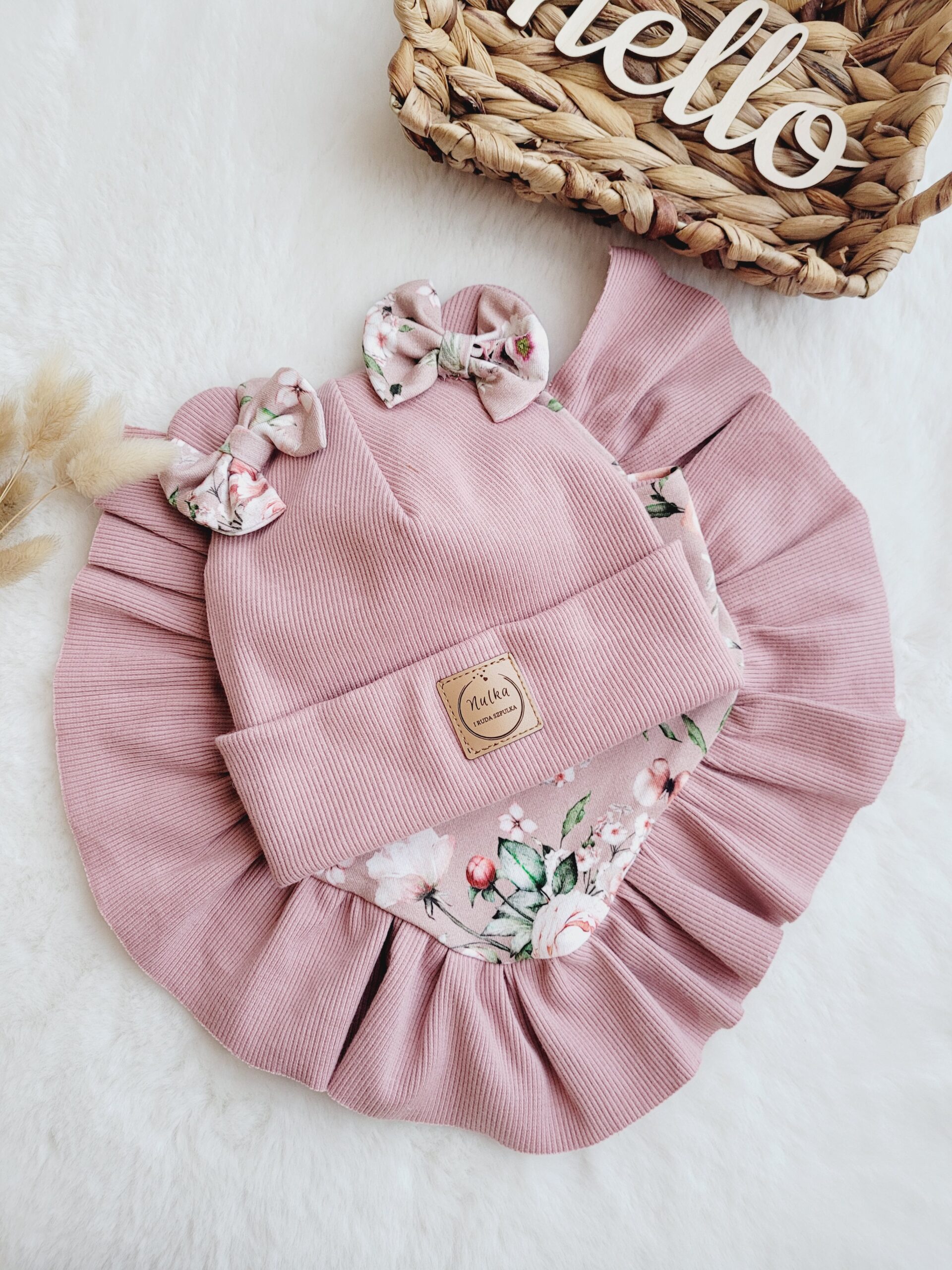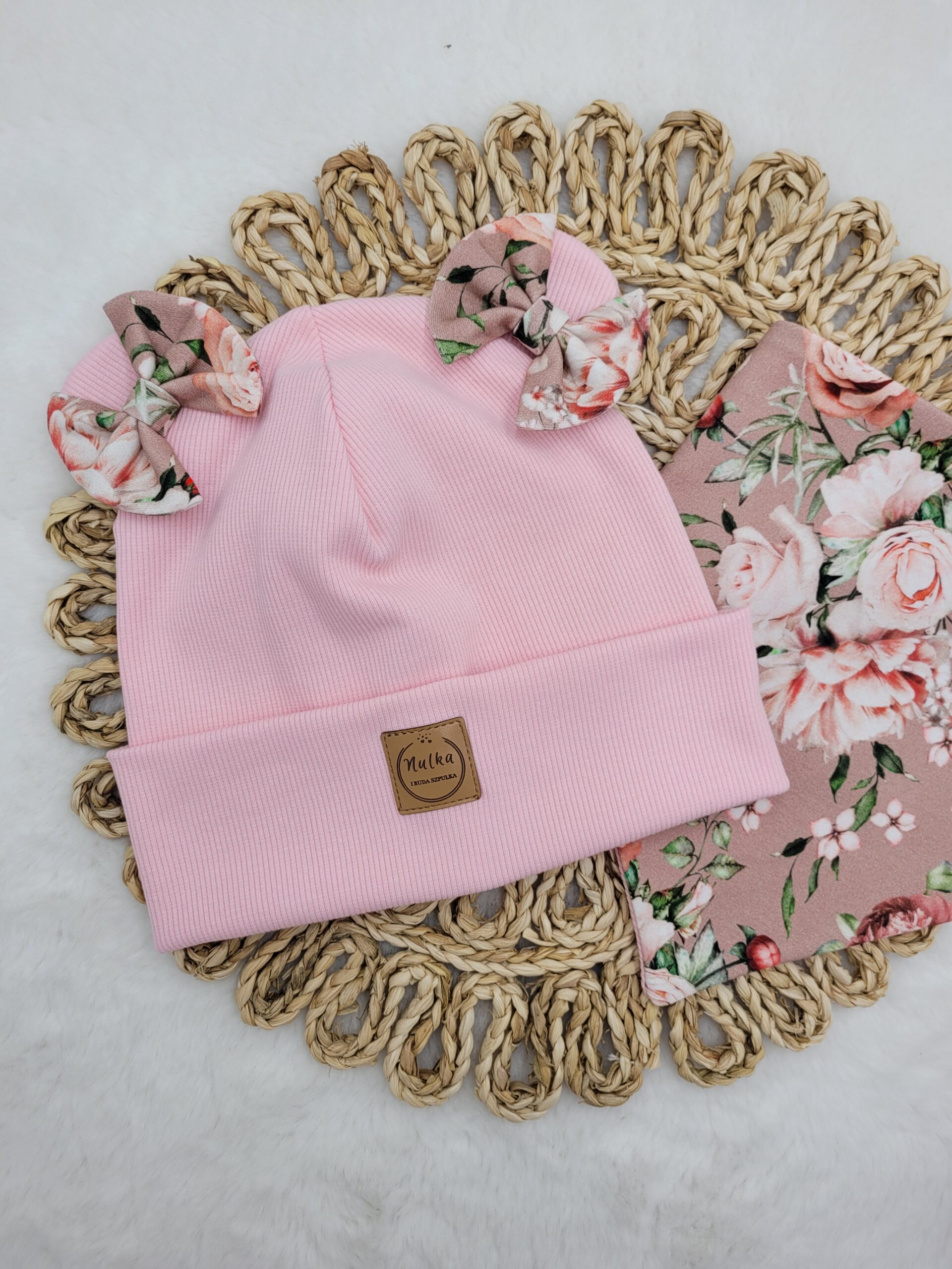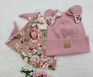 Czapka z uszkami i kokardkami w połączeniu z klasycznym kominem lub chustą. Piękny wzór kwiatowy połączony z wybranym kolorem dzianiny prążkowanej – idealny zestaw dla dziewczynki.
