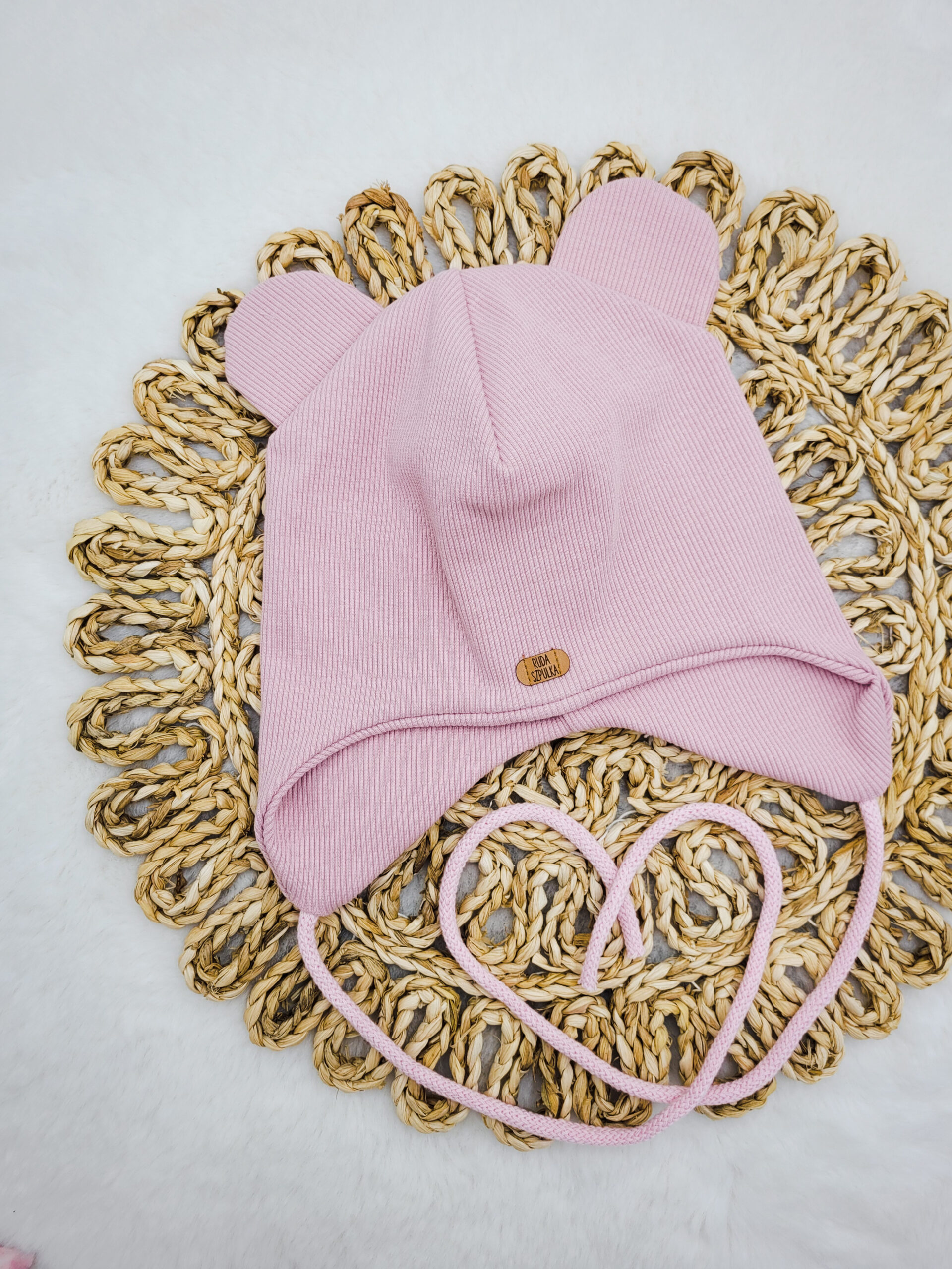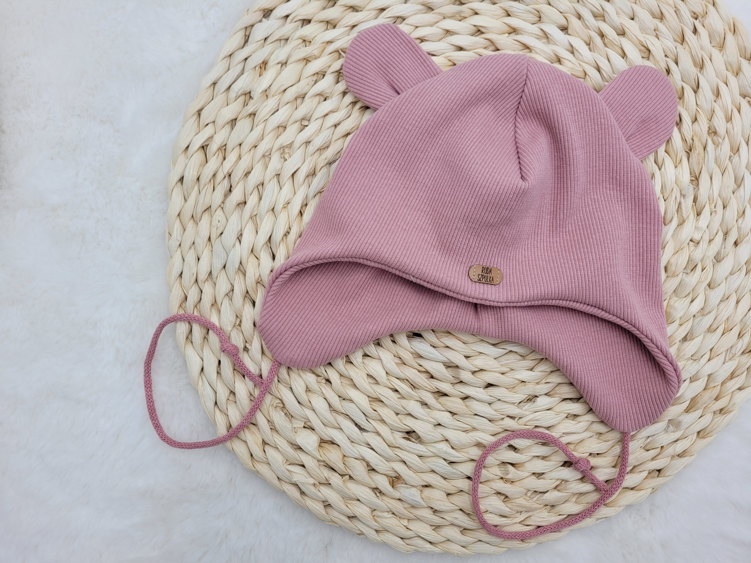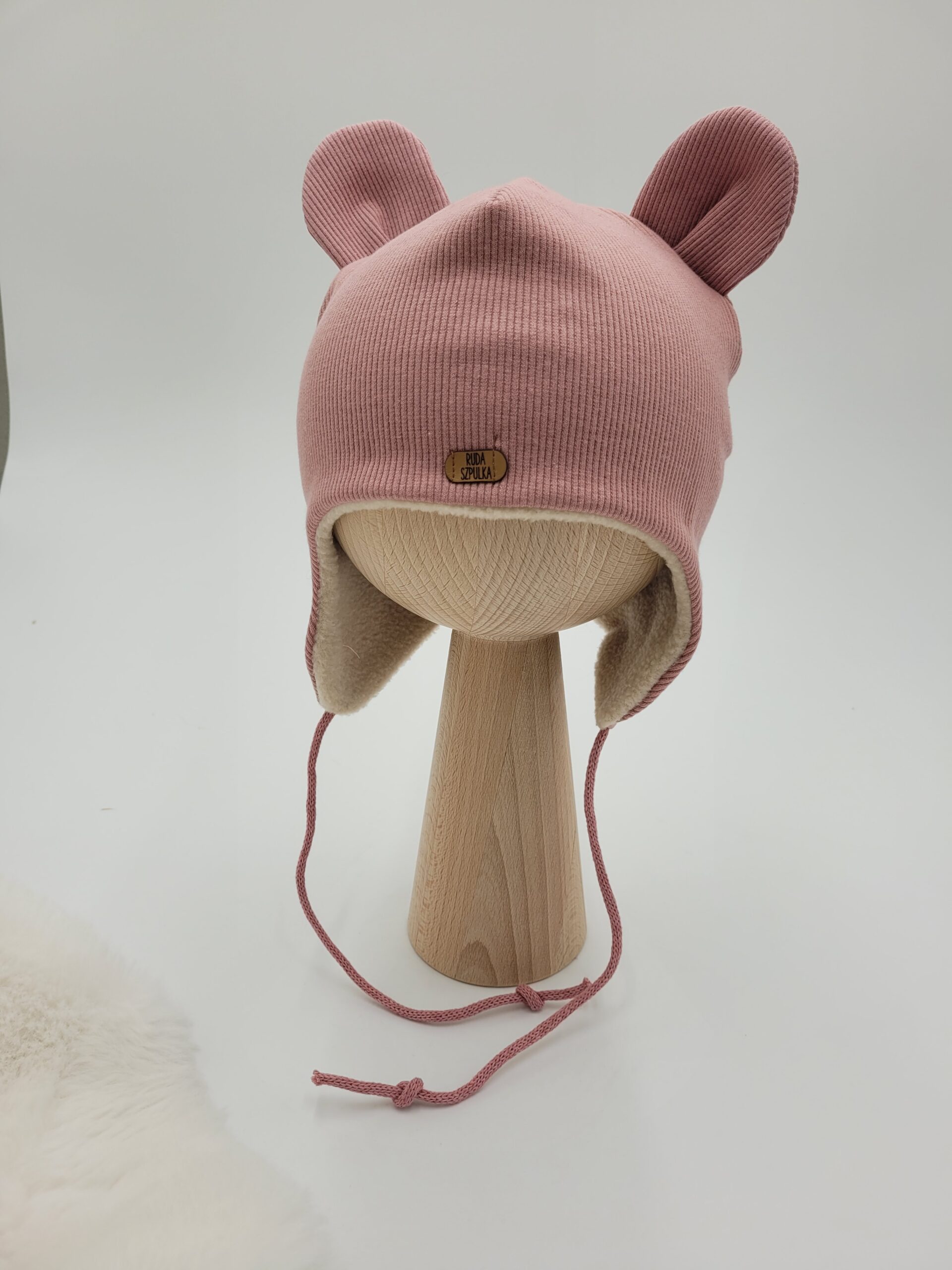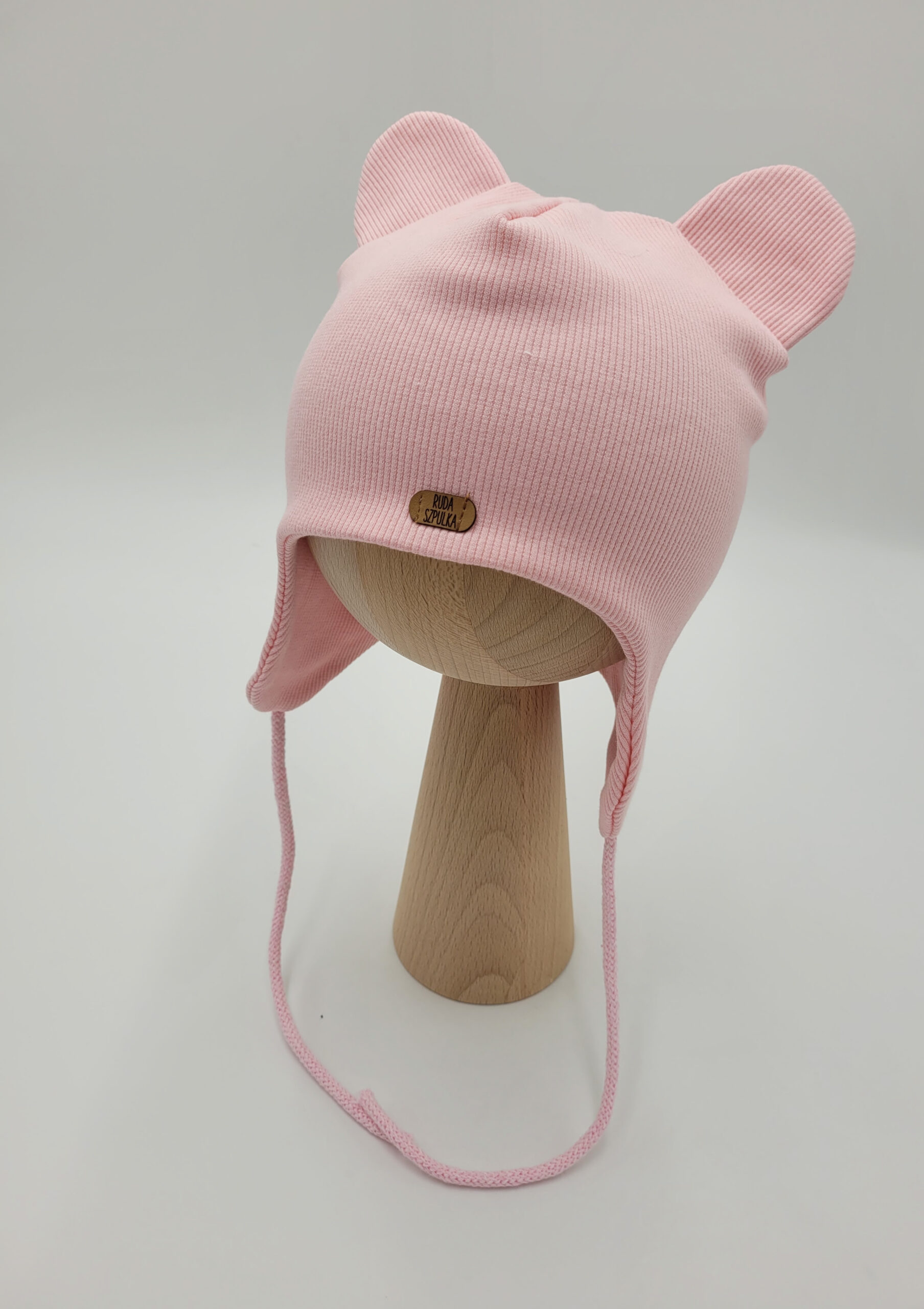 Komplet dla dziewczynki uszyty z dzianiny prążkowanej w wybranym kolorze. Czapka to klasyczna pilotka ozdobiona misiowymi uszkami. Wiązanie wykonane ze sznurka bawełnianego lub z dzianiny prążkowanej (uzależnione od koloru).