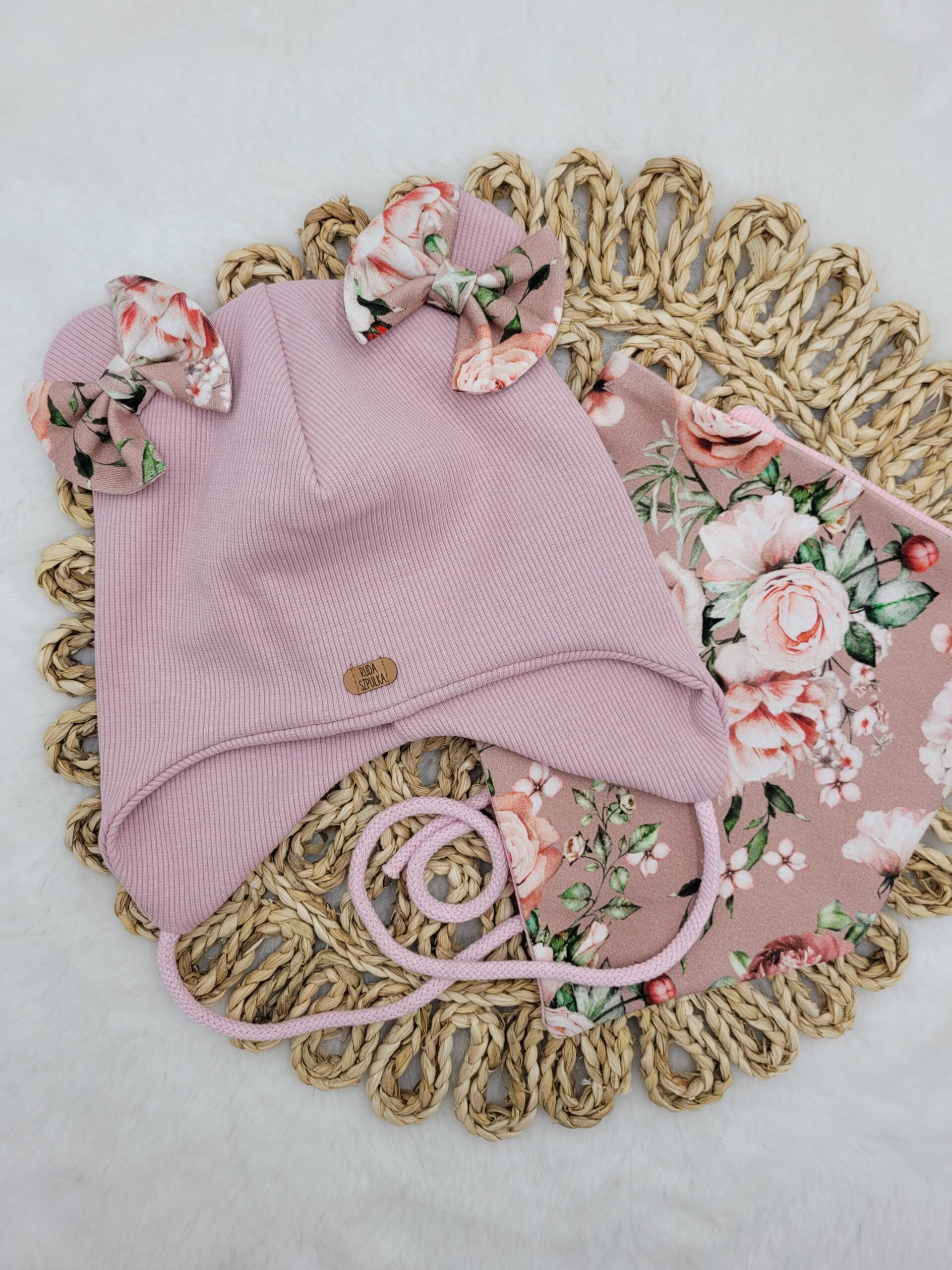 Komplet dla dziewczynki uszyty z dzianiny prążkowanej w wybranym kolorze z połączeniu z dresówką wzór Malowane róże. Czapka to klasyczna pilotka ozdobiona misiowymi uszkami i wzorzystymi kokardkami. Wiązanie wykonane z dzianiny prążkowanej.