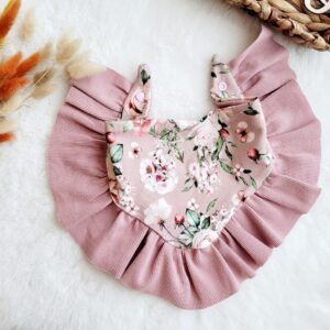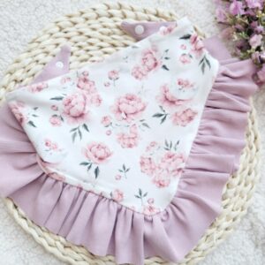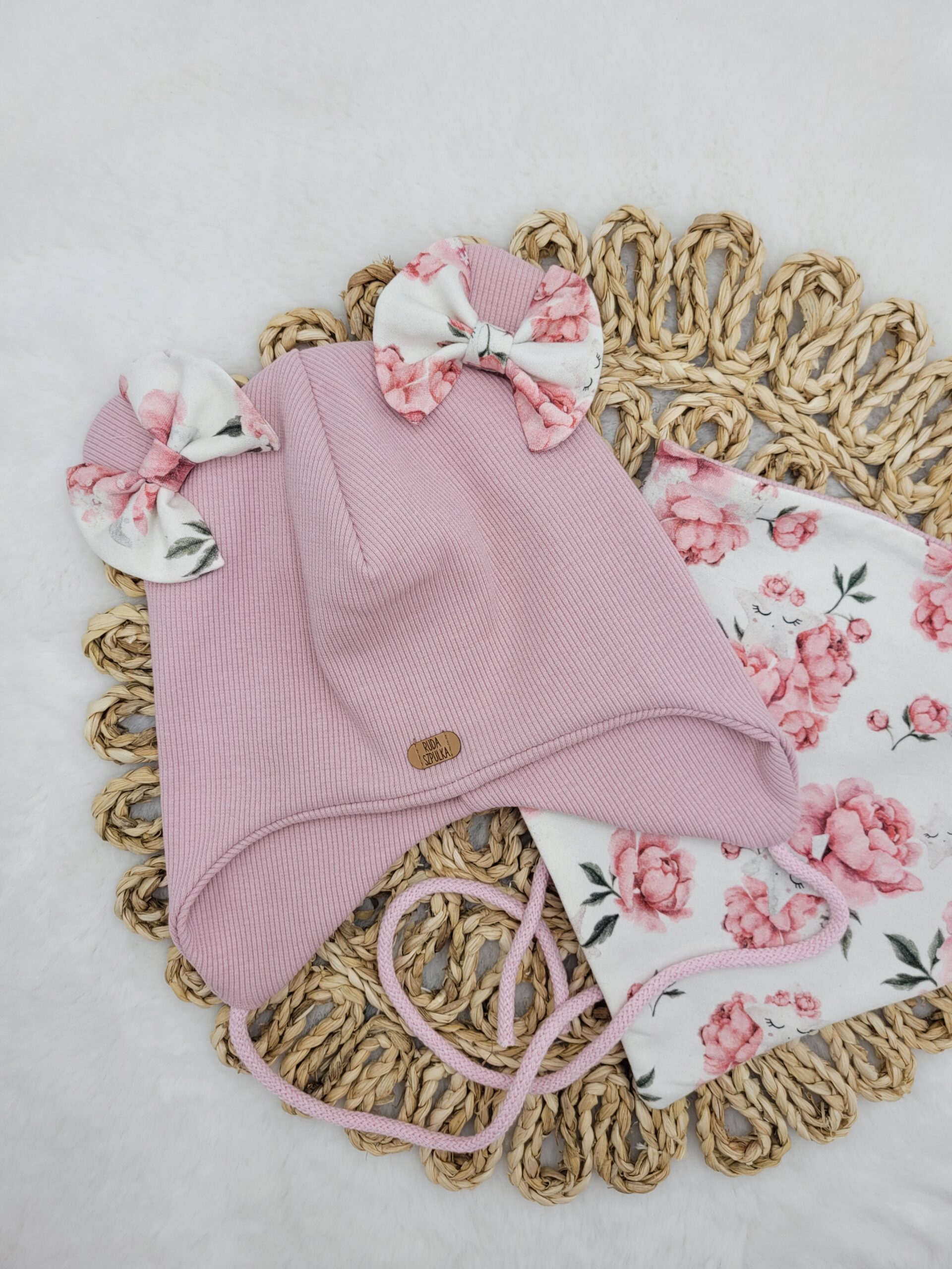 Komplet dla dziewczynki uszyty z dzianiny prążkowanej w wybranym kolorze z połączeniu z dresówką wzór Peony. Czapka to klasyczna pilotka ozdobiona misiowymi uszkami i wzorzystymi kokardkami. Wiązanie wykonane z dzianiny prążkowanej.