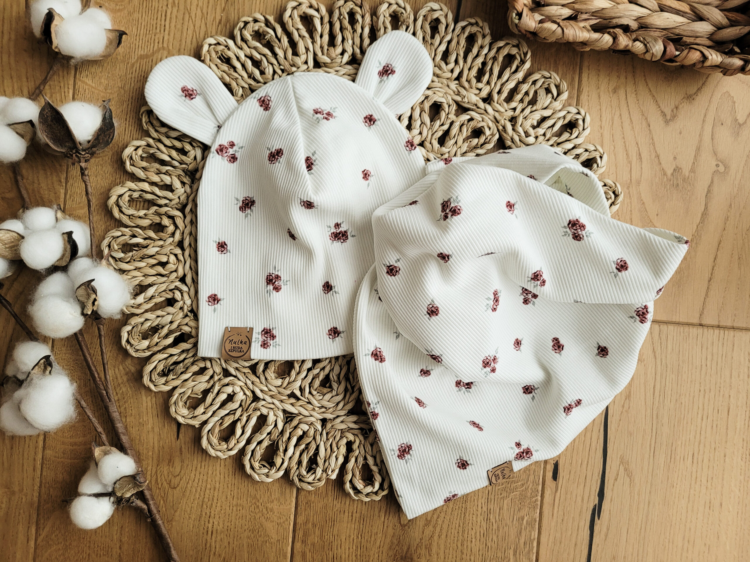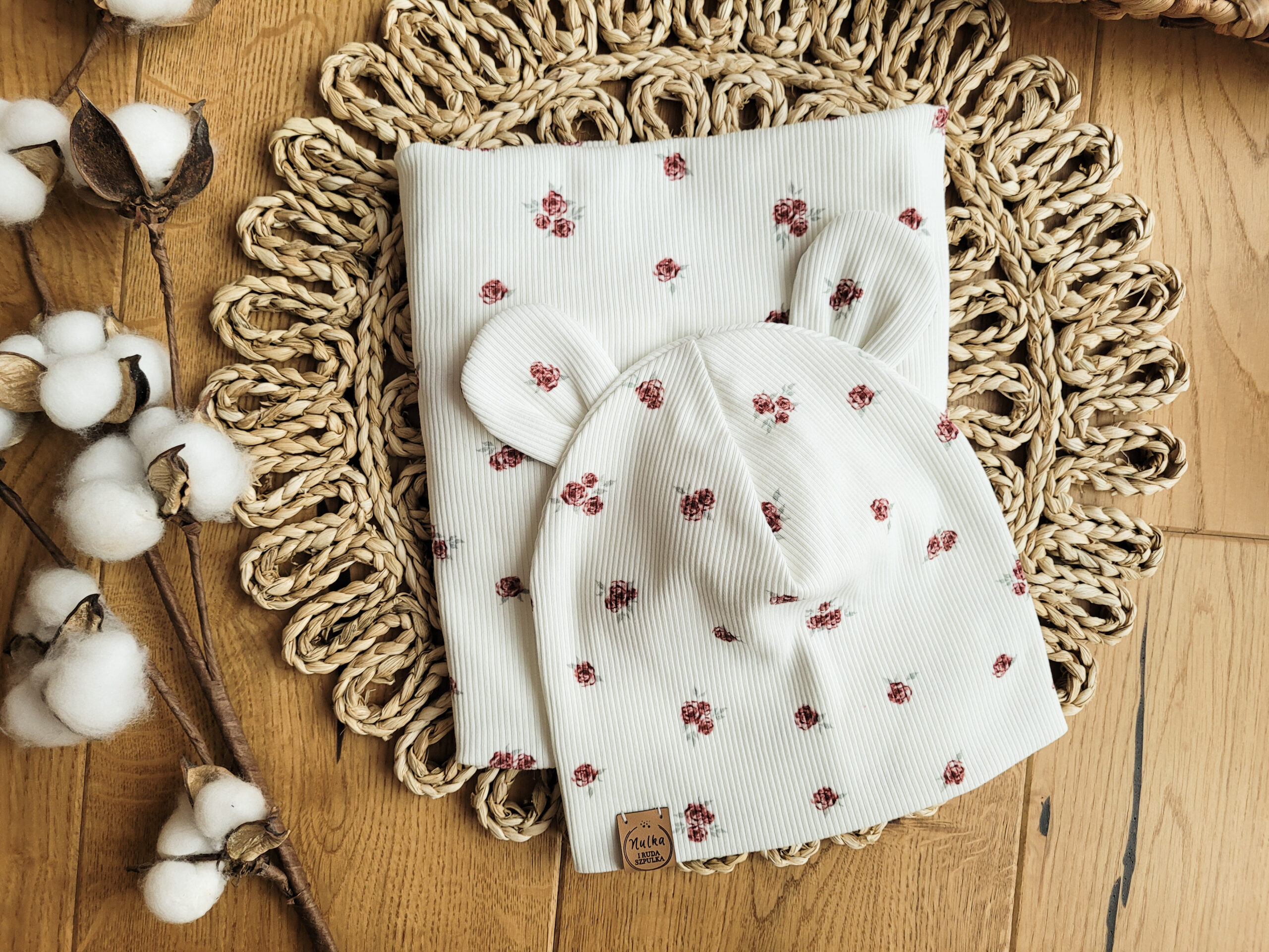 Komplet uszyty z dzianiny prążkowanej premium w kolorze ecru w drobne różyczki. Piękny, delikatny wzór, materiał jest miękki i elastyczny, dopasowuje się do głowy dziecka. Ulubiony model czapki – z misiowymi uszkami w wariancie prostym lub wywiniętym. Pod szyję możesz wybrać komin, chustę wiązaną (maxi) lub zapinaną na napki (mini).