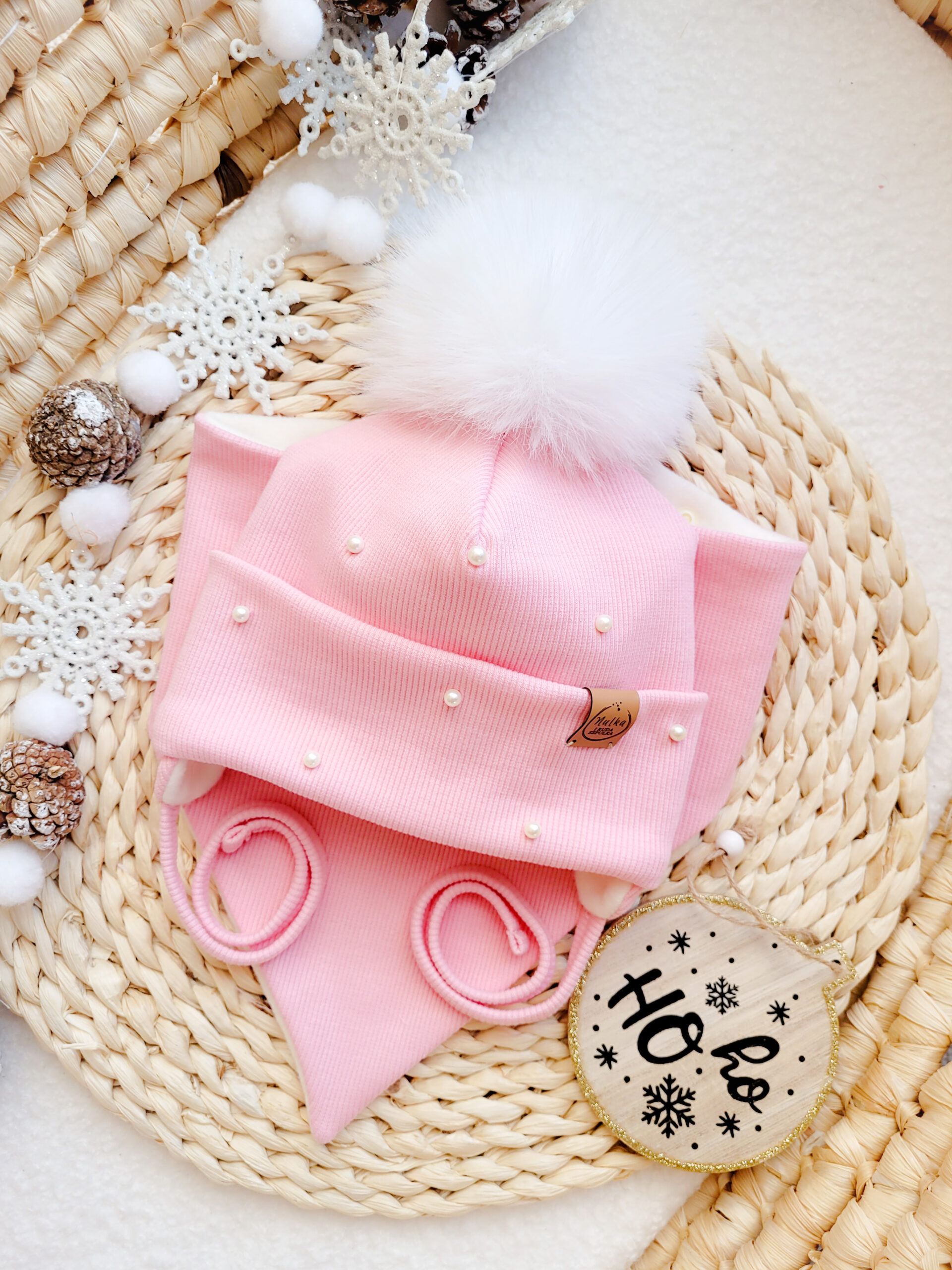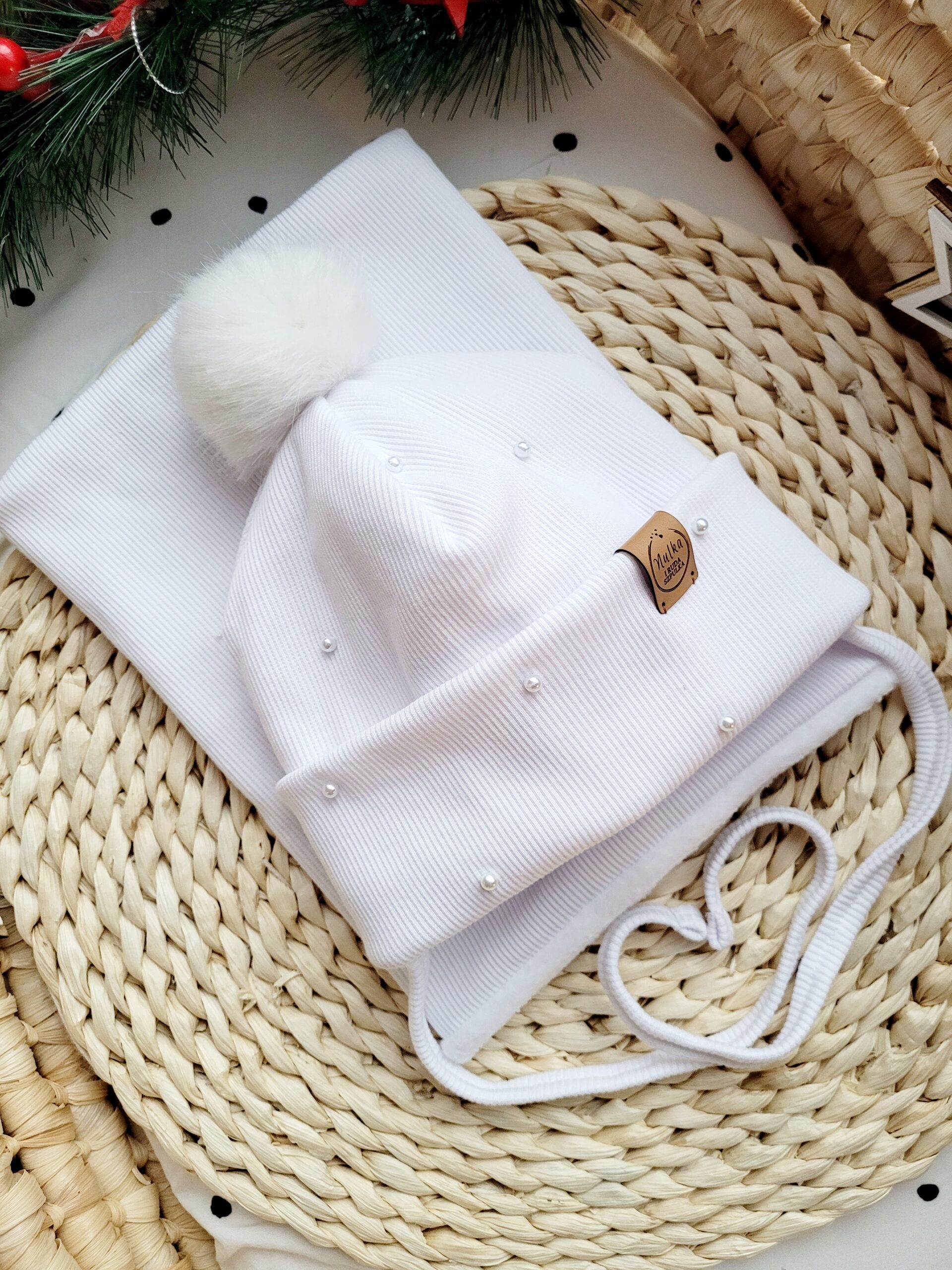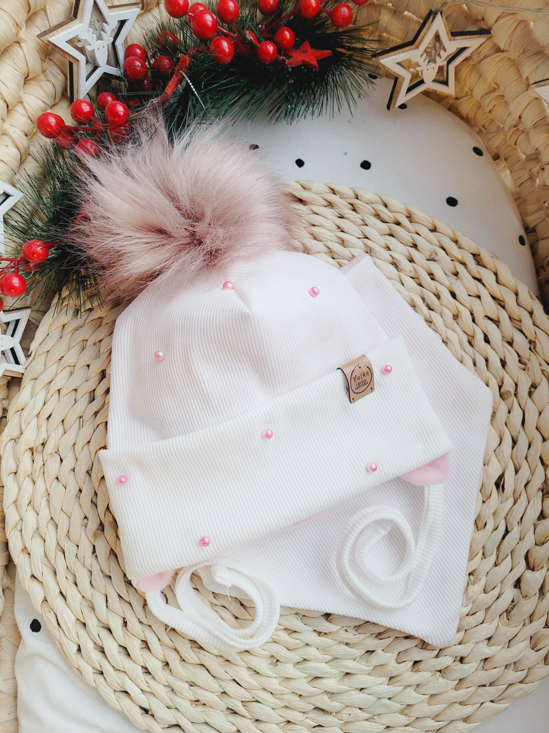 Komplet zawiera czapkę w dwóch stylach: prostą lub cieplejszą z wywinięciem na uszy. Możesz wybrać wersję z wiązaniem lub bez, a także dodać jeden lub dwa ręcznie robione pompony w dowolnym kolorze. Czapka ozdobiona jest również perełkami – dopasowanymi kolorystycznie, lub w wybranym odcieniu, na życzenie.